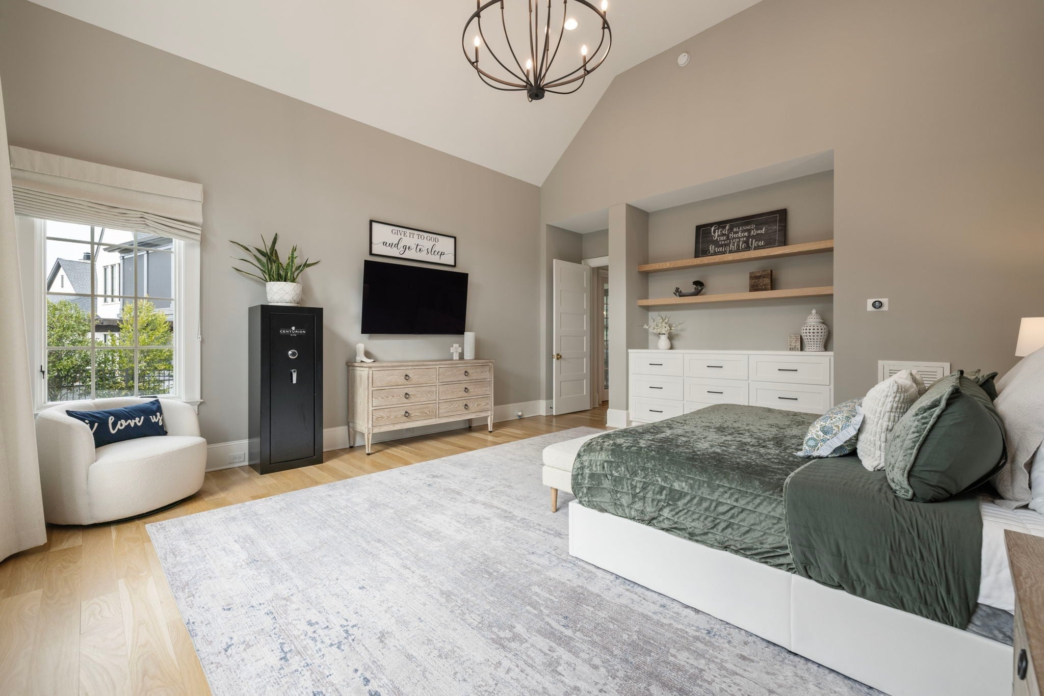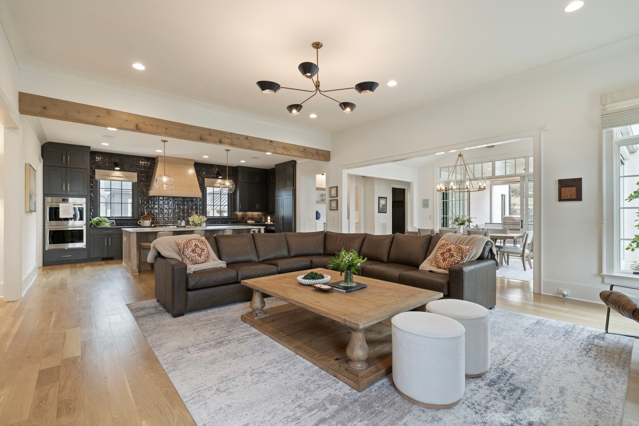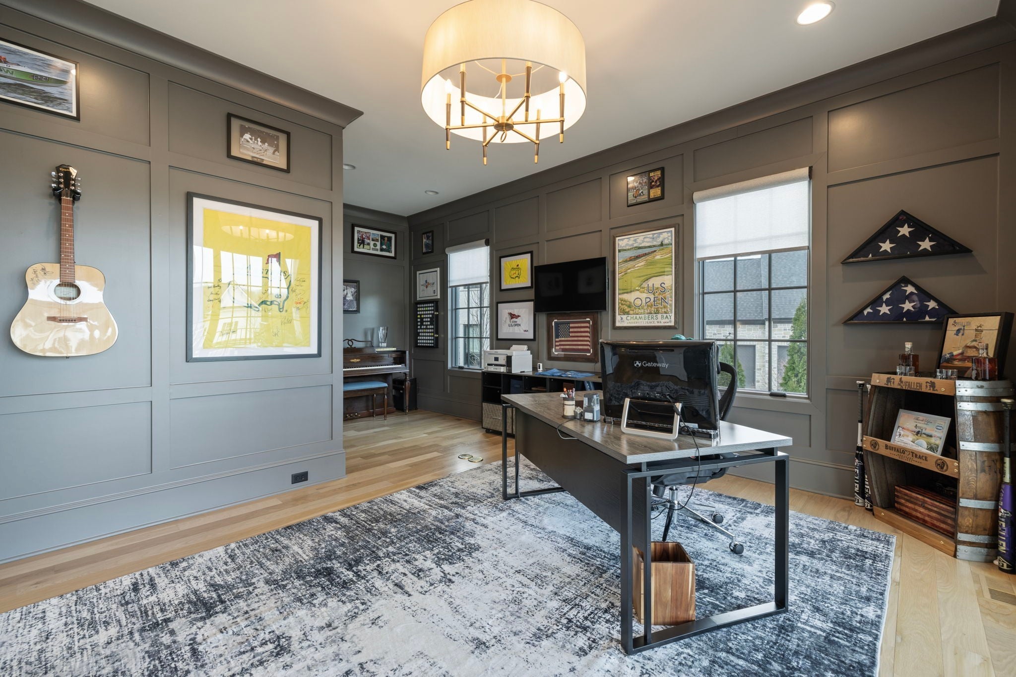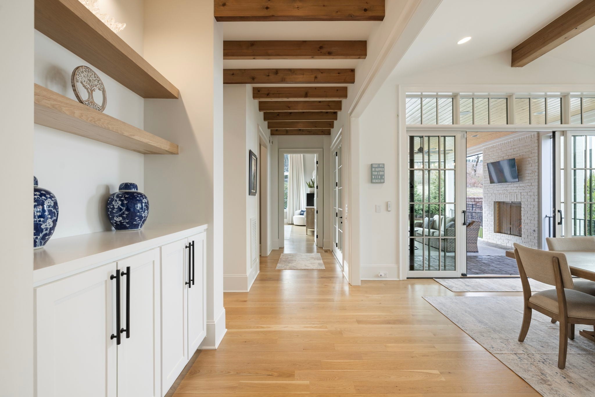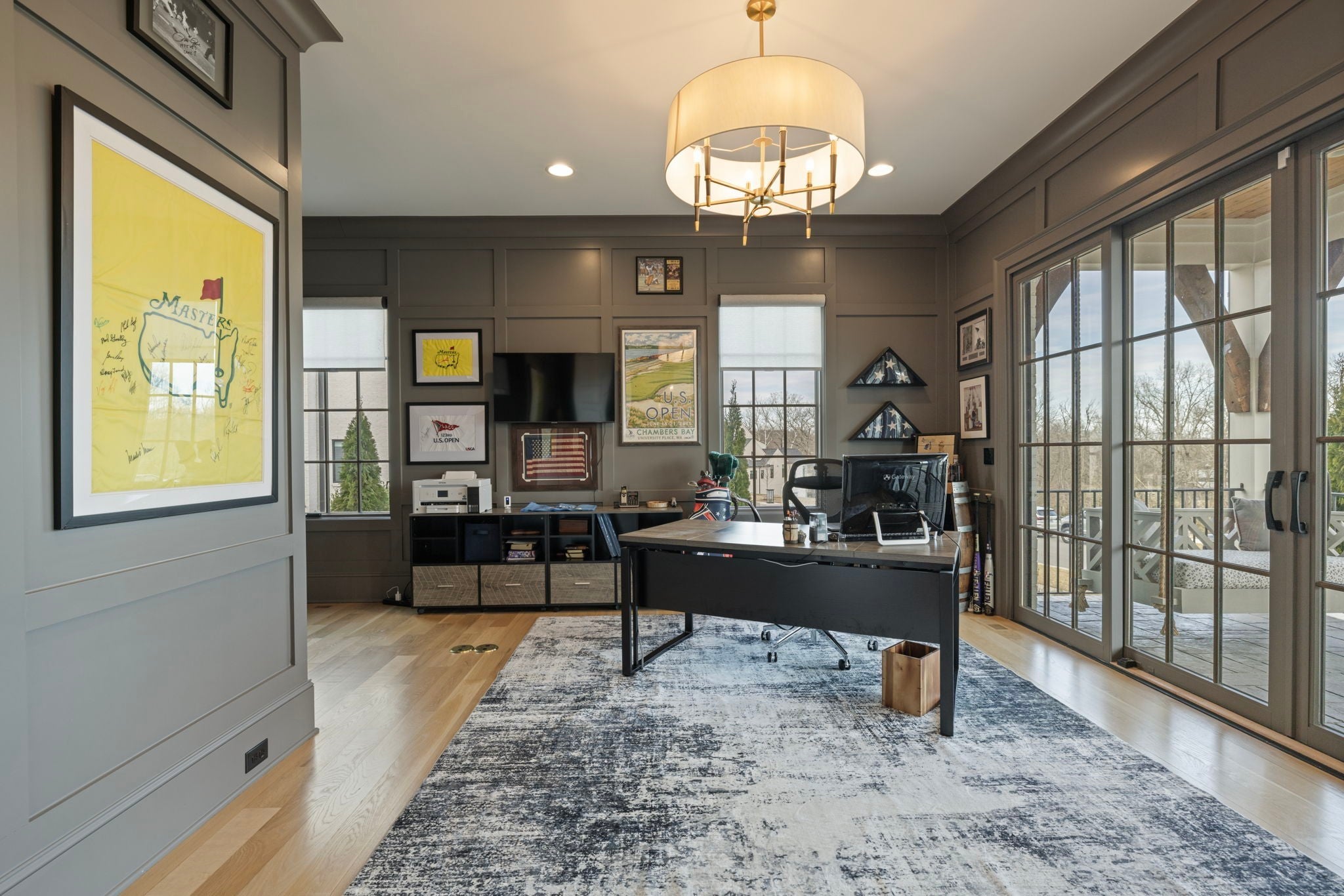 This is one of those homes that feels intentional the moment you walk in. Located inside the gated community of The Grove, the layout is open, bright, and thoughtfully designed, with hardwoods throughout the entire home and natural light pouring in from every angle. The living room centers around a gas fireplace and flows easily into the kitchen, which truly anchors the space. A generous island creates the perfect gathering spot, complemented by designer lighting, custom cabinetry, a dramatic tile backsplash, prep pantry, and dry bar. The main level offers two bedrooms and two full baths, including an oversized primary suite with vaulted ceilings. The bathroom feels refined and spa inspired, with dual vanities, floor to ceiling tile accents, a soaking tub, large walk in shower, and two walk in closets. There is also a dedicated office with wainscoting and sliding doors that open to the covered front porch, along with a spacious laundry room and drop zone just off the garage. Upstairs, you’ll find three additional bedrooms, three full baths, a flexible office or bonus space, and a large recreation room with built in bunk beds, creating a versatile space for hosting or extended stays. Over $100,000 has been invested into the backyard, creating a private outdoor retreat. The covered porch features a fireplace, outdoor gas grill, and automatic retractable screens so you can enjoy the space year round. An extended patio, low maintenance Goat turf, private putting green, and Japanese Maples complete the setting. The garage includes three full bays plus a dedicated fourth stall for your golf cart, along with epoxy floors and built in cabinetry. Living in The Grove means access to gated security, a championship golf course, resort style pools, clubhouse, fitness center and spa, walking trails, fishing, equestrian facilities, racquet sports, and multiple dining options. It’s polished and elevated, yet incredibly livable.