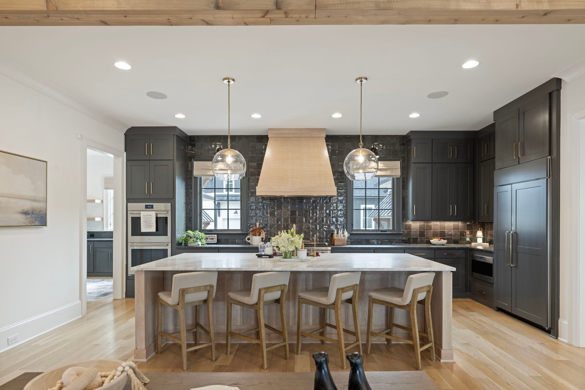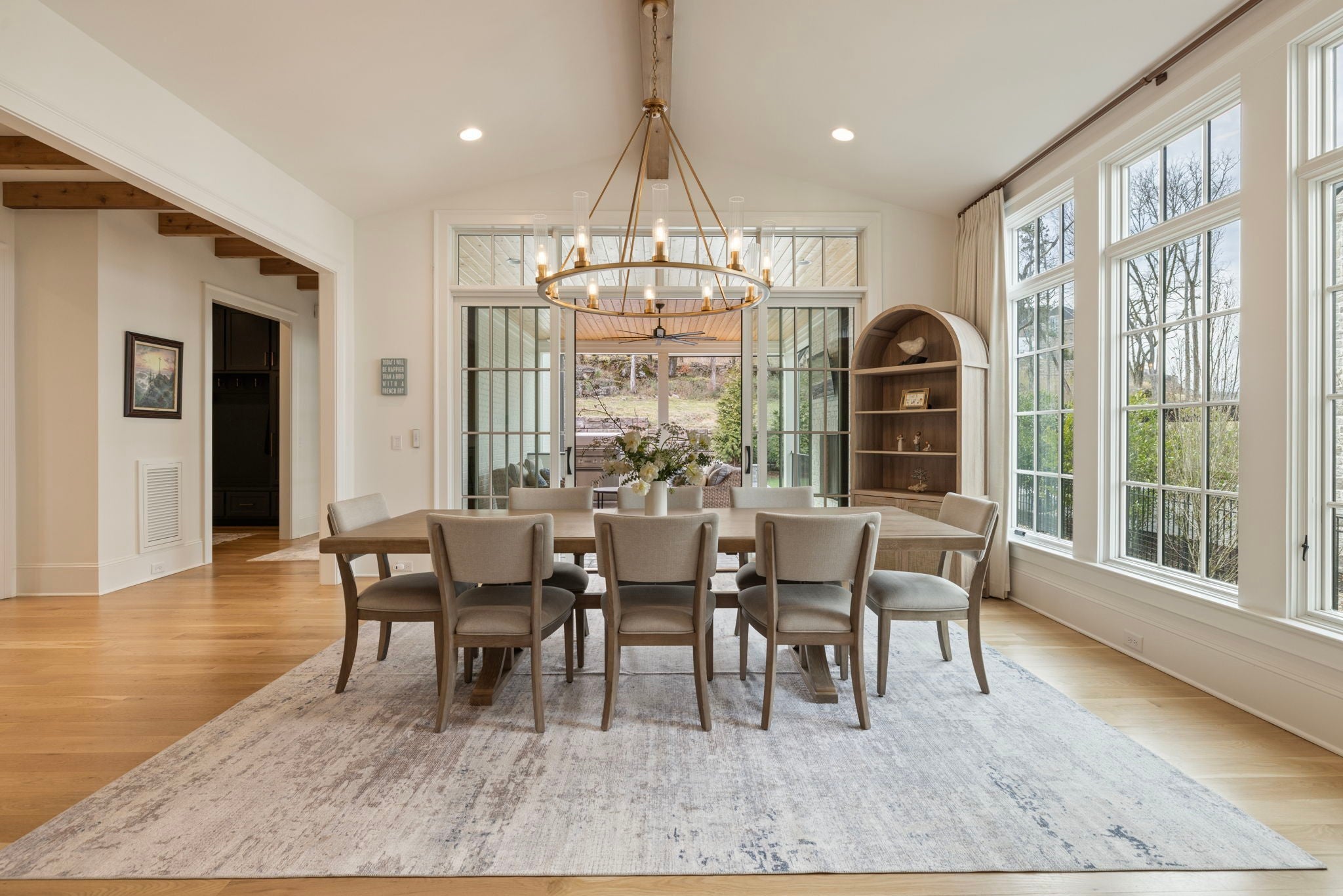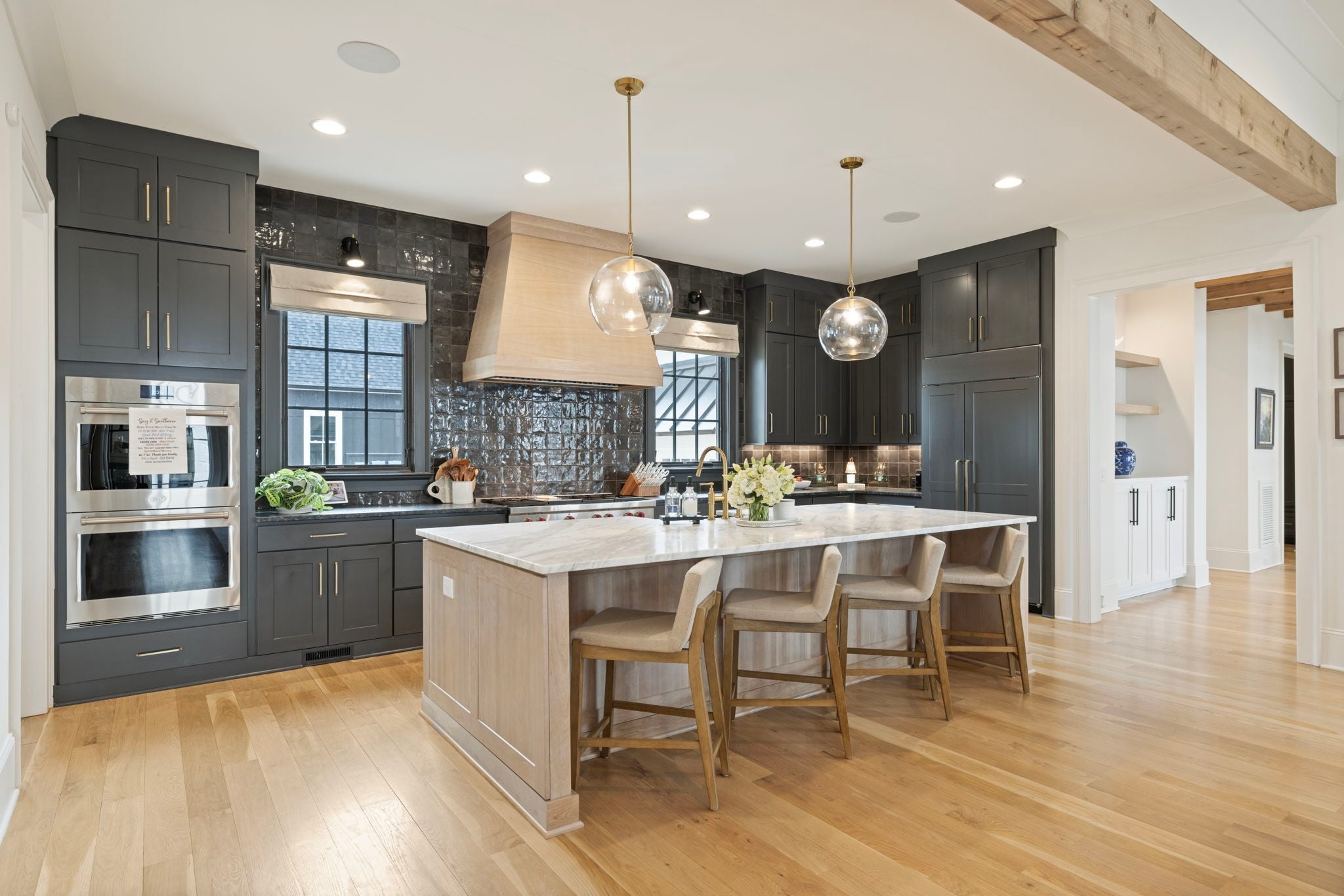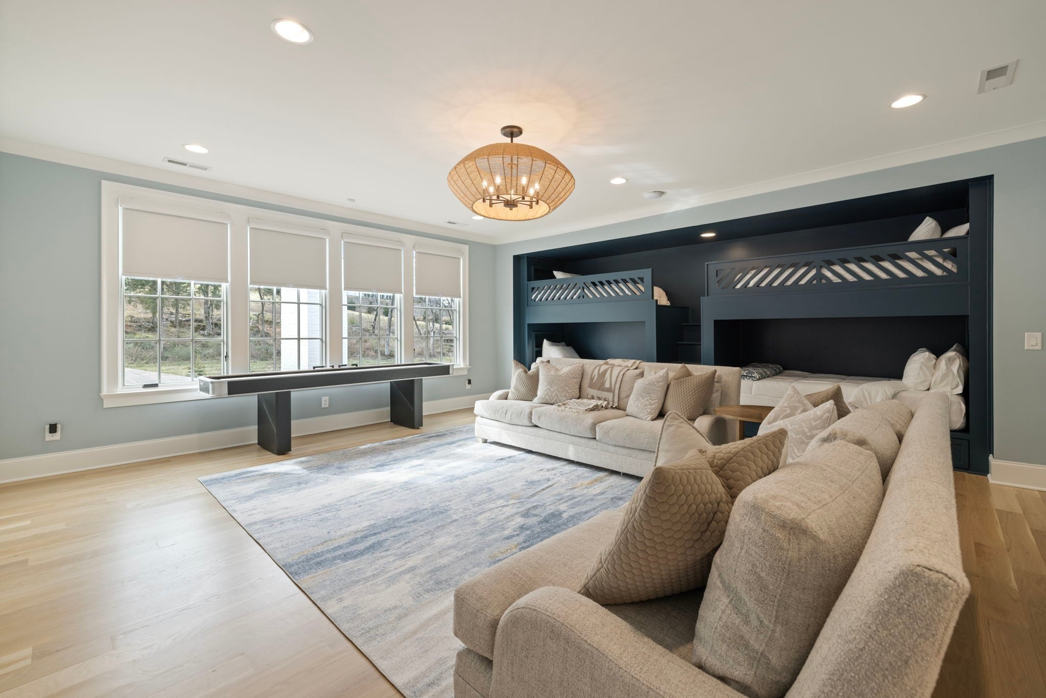 This is one of those homes that feels intentional the moment you walk in. Located inside the gated community of The Grove, the layout is open, bright, and thoughtfully designed, with hardwoods throughout the entire home and natural light pouring in from every angle. The living room centers around a gas fireplace and flows easily into the kitchen, which truly anchors the space. A generous island creates the perfect gathering spot, complemented by designer lighting, custom cabinetry, a dramatic tile backsplash, prep pantry, and dry bar. The main level offers two bedrooms and two full baths, including an oversized primary suite with vaulted ceilings. The bathroom feels refined and spa inspired, with dual vanities, floor to ceiling tile accents, a soaking tub, large walk in shower, and two walk in closets. There is also a dedicated office with wainscoting and sliding doors that open to the covered front porch, along with a spacious laundry room and drop zone just off the garage. Upstairs, you’ll find three additional bedrooms, three full baths, a flexible office or bonus space, and a large recreation room with built in bunk beds, creating a versatile space for hosting or extended stays. Over $100,000 has been invested into the backyard, creating a private outdoor retreat. The covered porch features a fireplace, outdoor gas grill, and automatic retractable screens so you can enjoy the space year round. An extended patio, low maintenance Goat turf, private putting green, and Japanese Maples complete the setting. The garage includes three full bays plus a dedicated fourth stall for your golf cart, along with epoxy floors and built in cabinetry. Living in The Grove means access to gated security, a championship golf course, resort style pools, clubhouse, fitness center and spa, walking trails, fishing, equestrian facilities, racquet sports, and multiple dining options. It’s polished and elevated, yet incredibly livable.