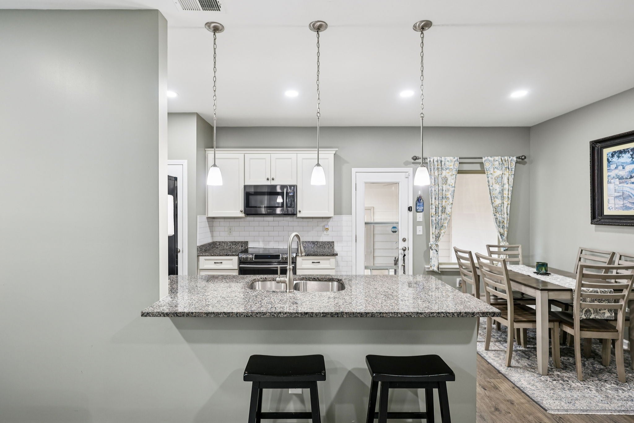 This beautifully updated 3-bedroom, 2.5-bath home delivers the modern finishes buyers want — at a great price point! Step inside to an open-concept layout featuring brand-new LVP flooring, recessed lighting, elegant arched openings, and a cozy fireplace that anchors the living space. The kitchen has been thoughtfully designed with expansive granite countertops, stainless steel appliances, a new subway tile backsplash, and plantation shutters that add timeless character. The spacious primary suite offers vaulted ceilings and a walk-in tile shower, creating a private retreat feel. Upstairs, two additional bedrooms provide great natural light and ceiling fans for added comfort. Also, there is a whole house air filter. Major updates include a new HVAC system, whole-home water purifier, and new front door — giving buyers peace of mind from day one. Out back, enjoy a covered patio overlooking a private backyard, perfect for relaxing or entertaining. Modern updates, smart value, and long-term savings — this is THE one!