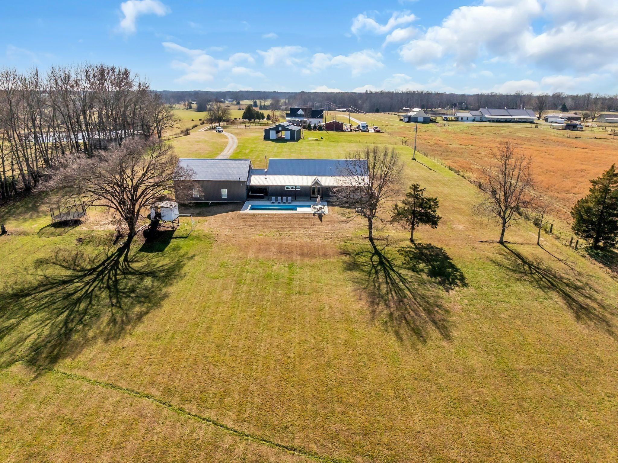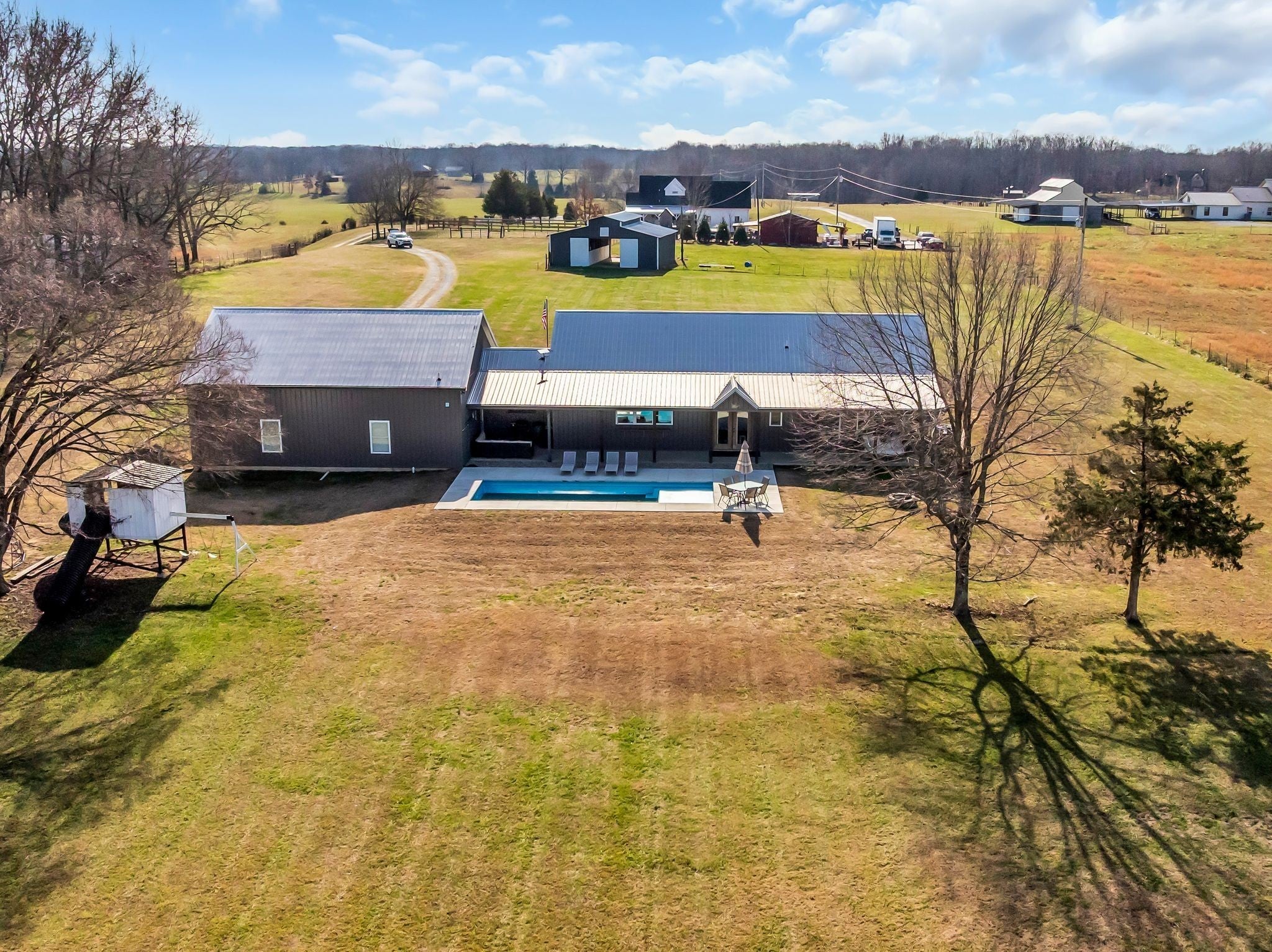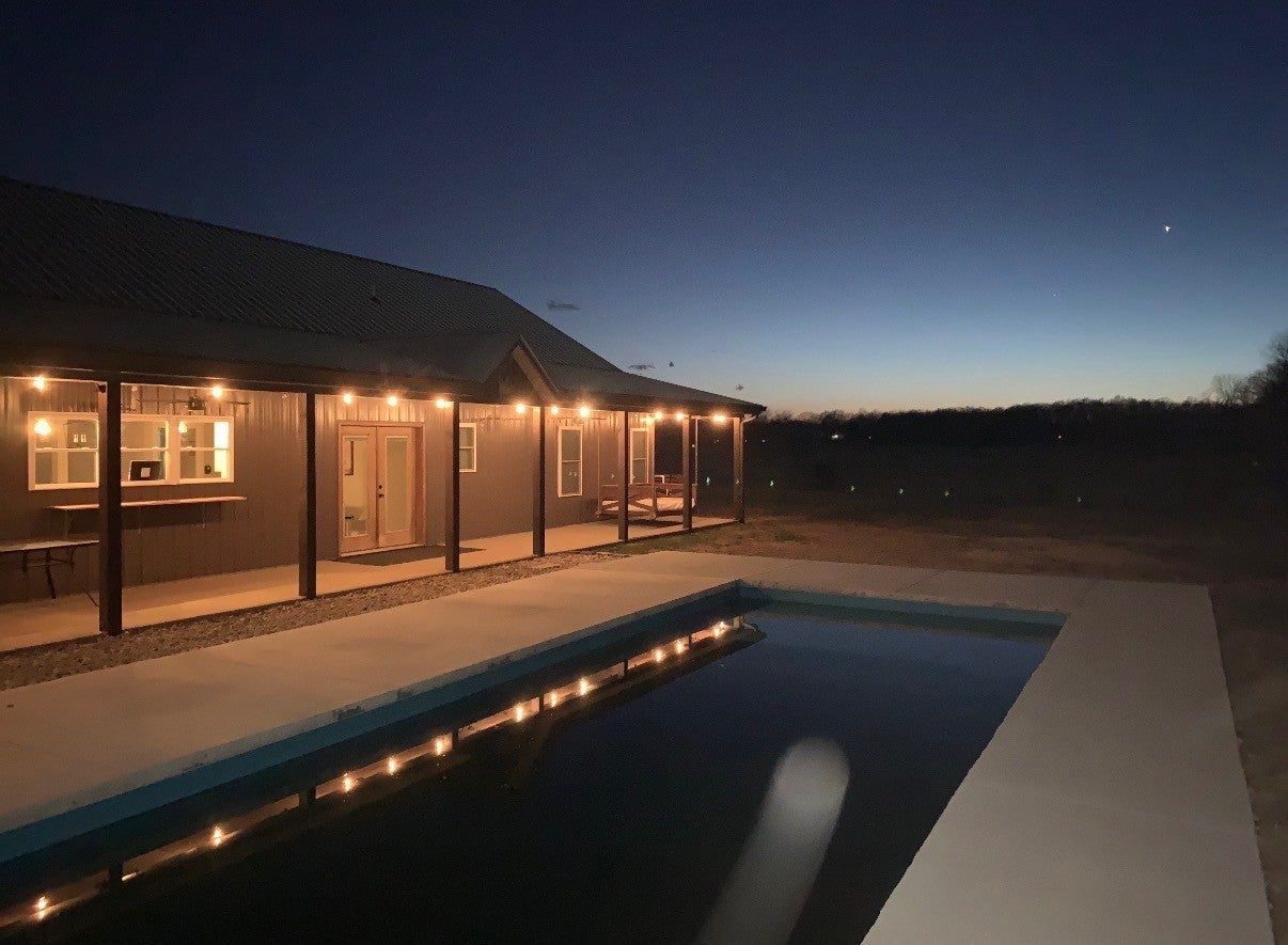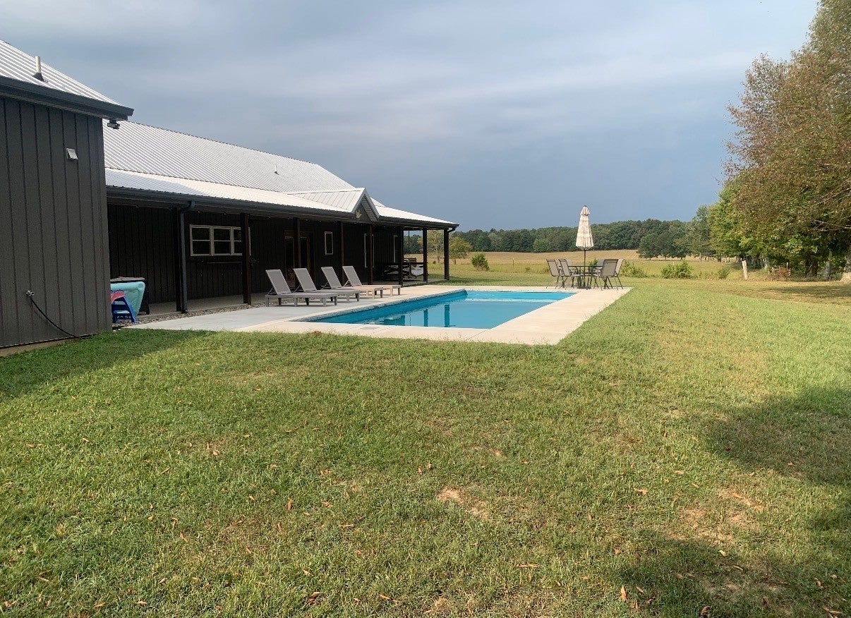 Luxury meets functionality on 5 acres in this exceptional 3 Bedroom barndominium-style home featuring metal siding with rock accents and covered front and rear porches. Open-concept living showcases a gas rock fireplace and custom built-in cabinetry throughout. The custom kitchen offers an oversized bar, Quartzite countertops, soft-close cabinetry, smart appliances, and a hidden walk-in pantry. The primary suite is a private retreat with a custom walk-in closet and spa-like bath featuring cultured marble finishes, double vanities, and a tiled walk-in shower with dual shower heads and a center rain shower. Upgrades include 3’ solid wood doors, LVP flooring, TV wall mounts throughout, and energy-efficient double-hung argon gas–filled windows. Enjoy outdoor living with speakers wired for surround sound on the back porch and an in-ground fiberglass pool with splash pad and built-in bubblers. The massive 34x40 garage includes two oversized doors, half bath, custom bar, built-in storm shelter, and tankless water heater. Property also features a metal 5-stall barn with tack room, loft, water spigot, and separate fencing for animals. A rare blend of modern luxury, comfort, and versatility. See MLS # 3130897 for Residential Info.