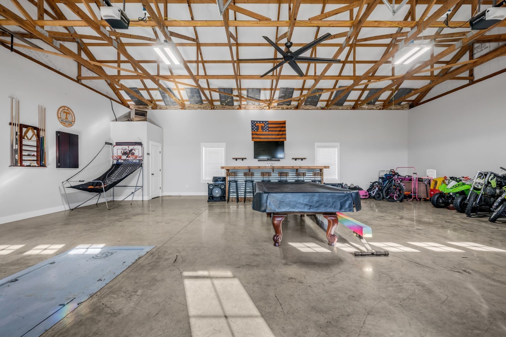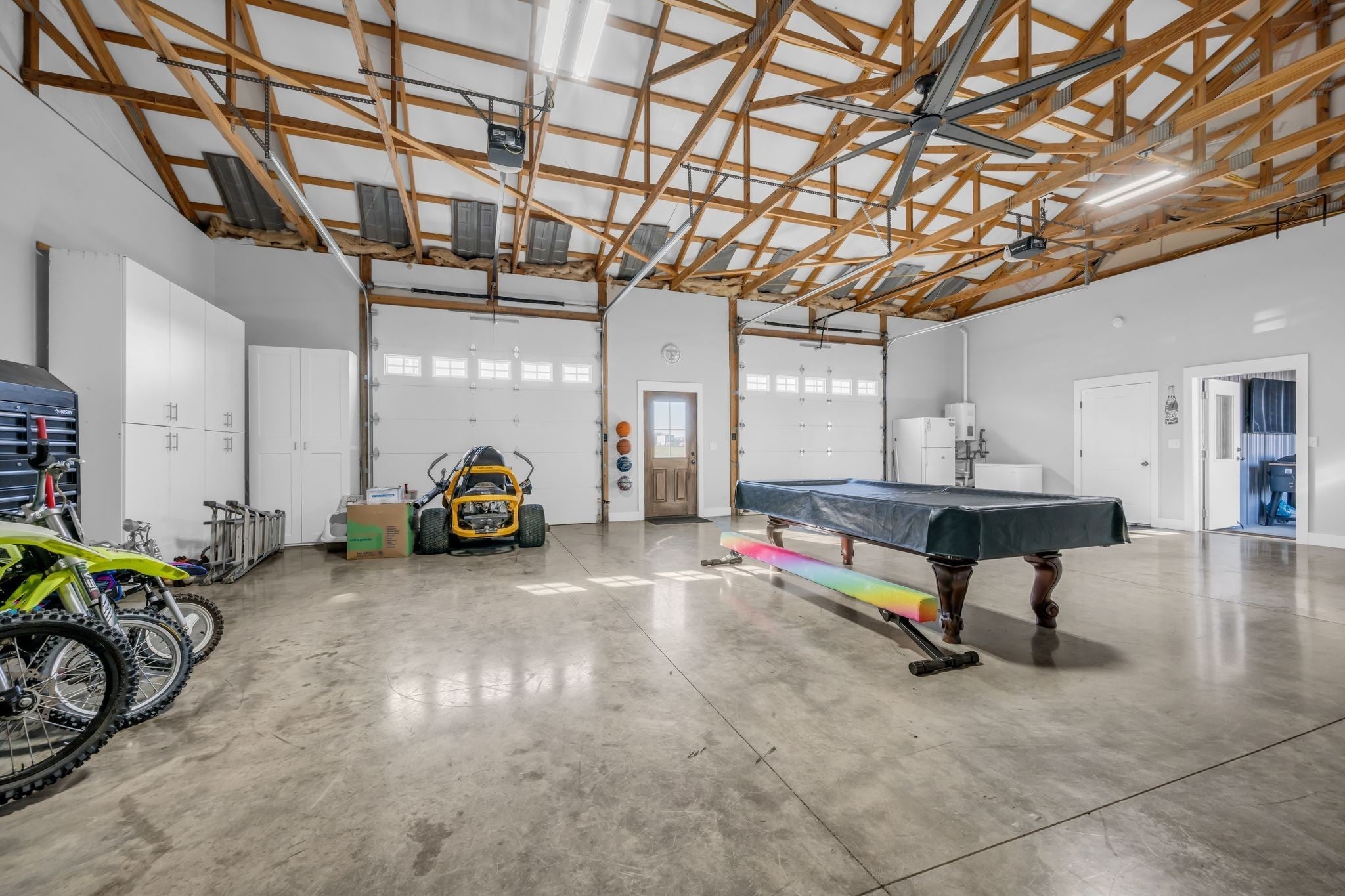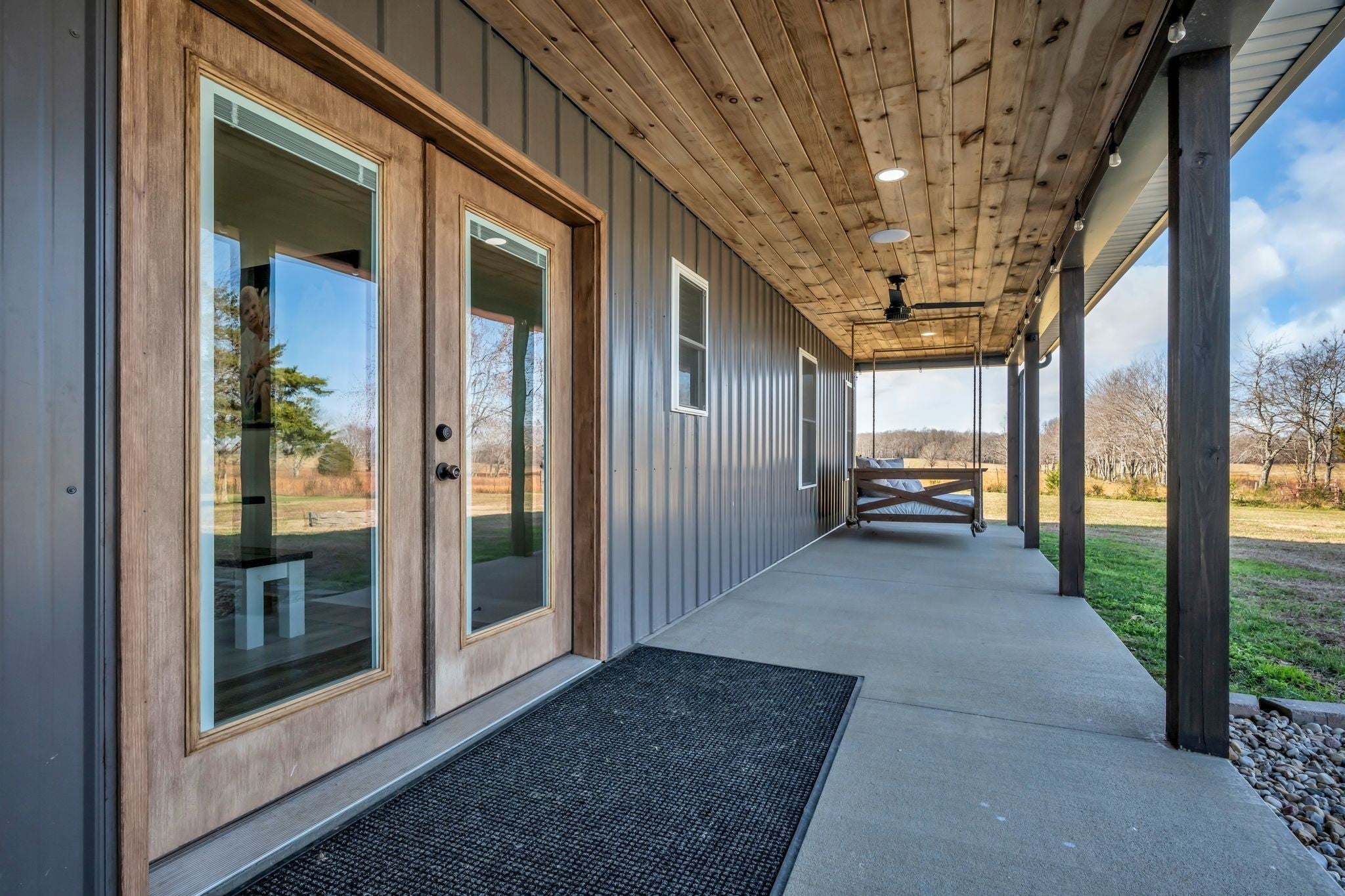 Luxury meets functionality on 5 acres in this exceptional 3 Bedroom barndominium-style home featuring metal siding with rock accents and covered front and rear porches. Open-concept living showcases a gas rock fireplace and custom built-in cabinetry throughout. The custom kitchen offers an oversized bar, Quartzite countertops, soft-close cabinetry, smart appliances, and a hidden walk-in pantry. The primary suite is a private retreat with a custom walk-in closet and spa-like bath featuring cultured marble finishes, double vanities, and a tiled walk-in shower with dual shower heads and a center rain shower. Upgrades include 3’ solid wood doors, LVP flooring, TV wall mounts throughout, and energy-efficient double-hung argon gas–filled windows. Enjoy outdoor living with speakers wired for surround sound on the back porch and an in-ground fiberglass pool with splash pad and built-in bubblers. The massive 34x40 garage includes two oversized doors, half bath, custom bar, built-in storm shelter, and tankless water heater. Property also features a metal 5-stall barn with tack room, loft, water spigot, and separate fencing for animals. A rare blend of modern luxury, comfort, and versatility. See MLS # 3130897 for Residential Info.