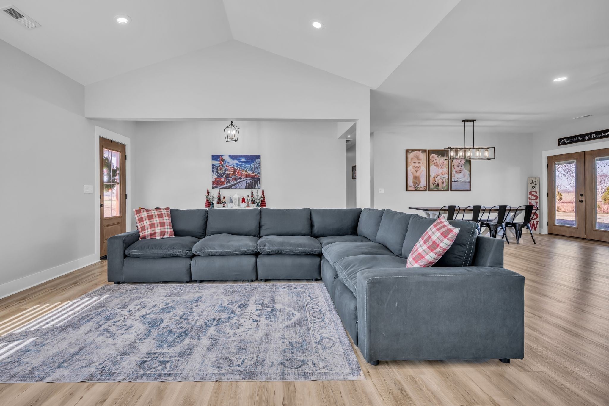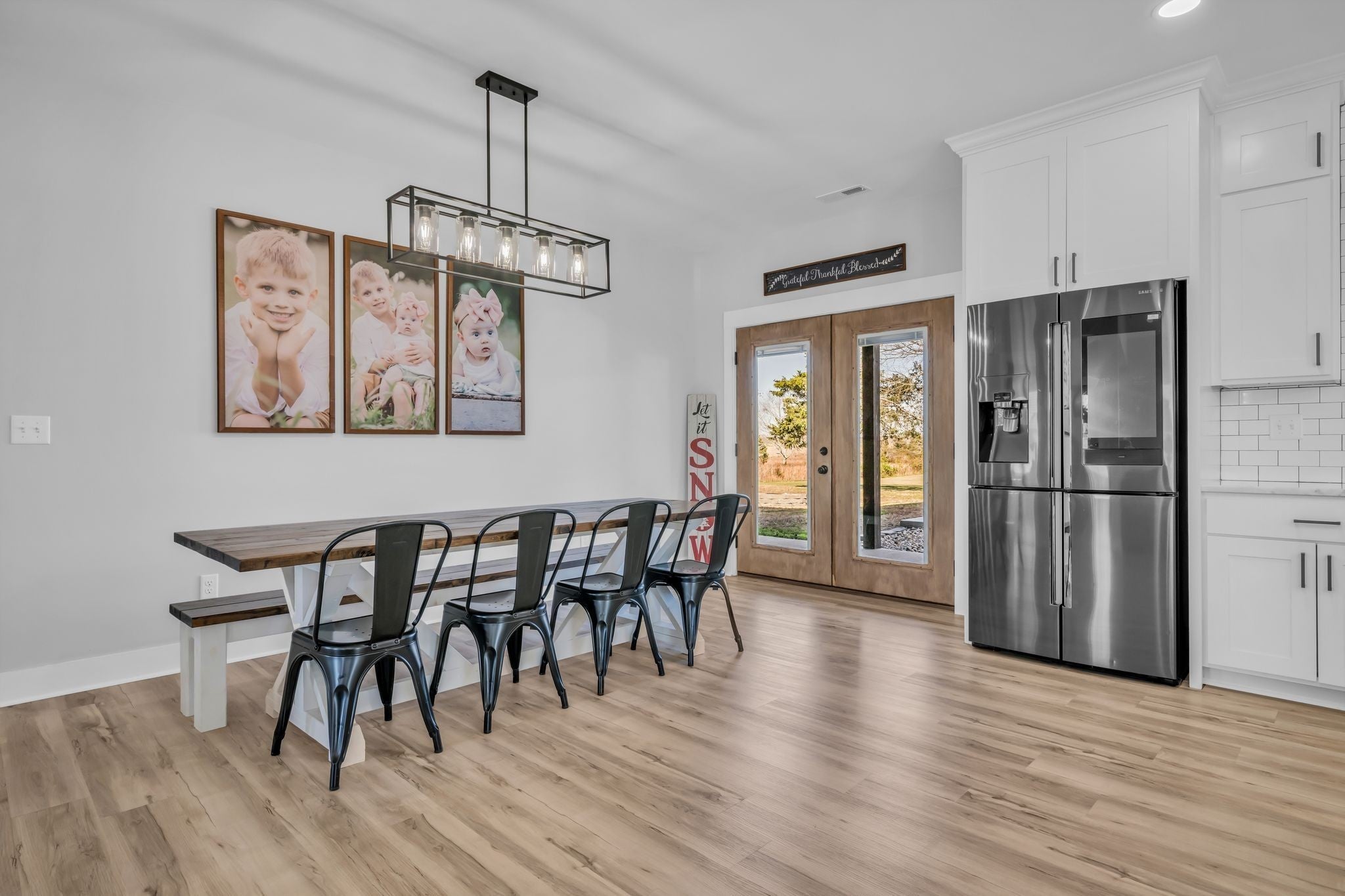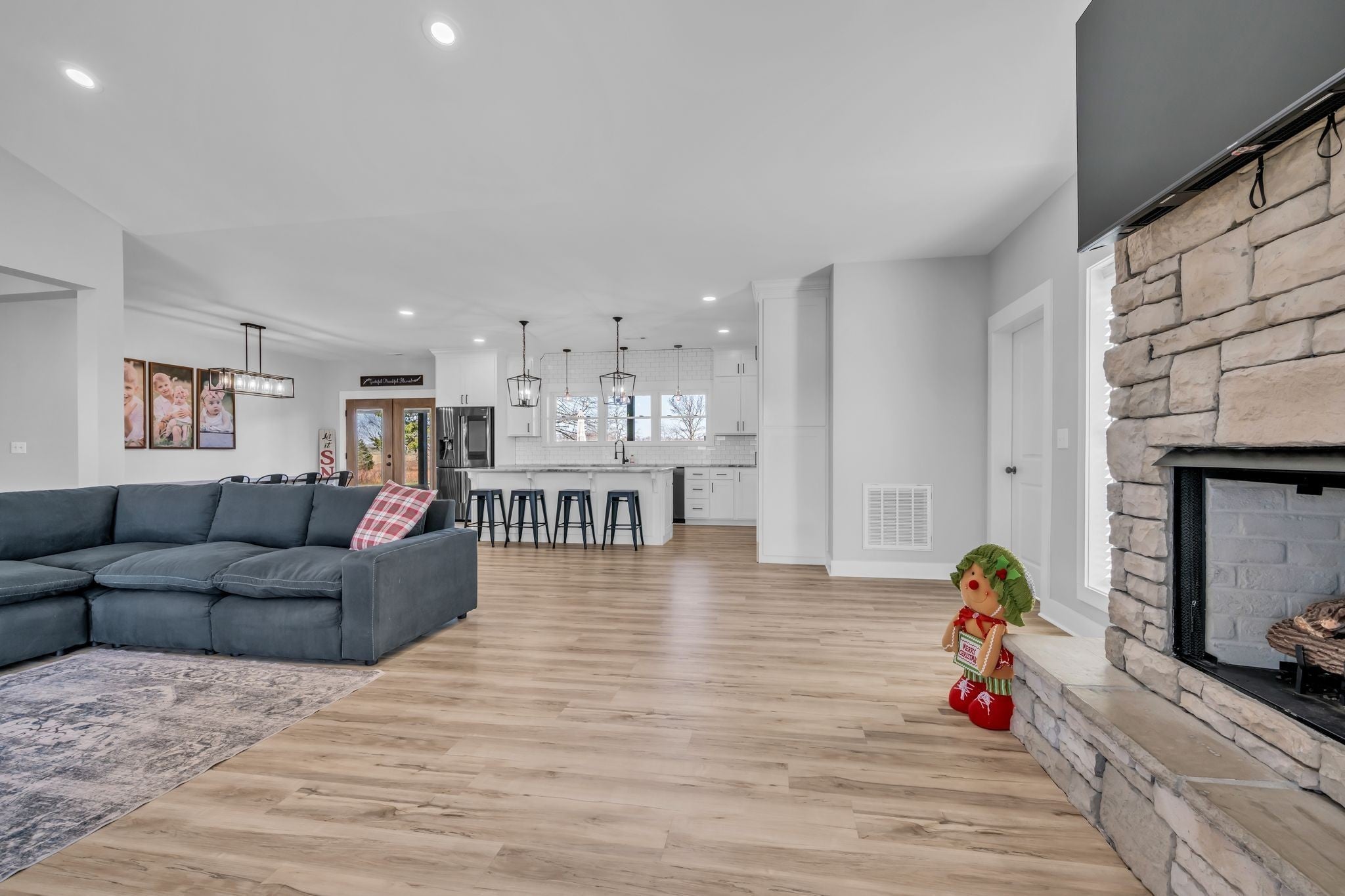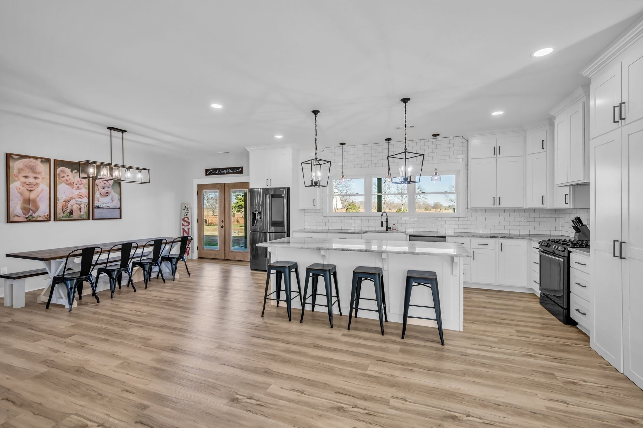Luxury meets functionality on 5 acres in this exceptional 3 Bedroom barndominium-style home featuring metal siding with rock accents and covered front and rear porches. Open-concept living showcases a gas rock fireplace and custom built-in cabinetry throughout. The custom kitchen offers an oversized bar, Quartzite countertops, soft-close cabinetry, smart appliances, and a hidden walk-in pantry. The primary suite is a private retreat with a custom walk-in closet and spa-like bath featuring cultured marble finishes, double vanities, and a tiled walk-in shower with dual shower heads and a center rain shower. Upgrades include 3’ solid wood doors, LVP flooring, TV wall mounts throughout, and energy-efficient double-hung argon gas–filled windows. Enjoy outdoor living with speakers wired for surround sound on the back porch and an in-ground fiberglass pool with splash pad and built-in bubblers. The massive 34x40 garage includes two oversized doors, half bath, custom bar, built-in storm shelter, and tankless water heater. Property also features a metal 5-stall barn with tack room, loft, water spigot, and separate fencing for animals. A rare blend of modern luxury, comfort, and versatility. See MLS # 3130897 for Residential Info.