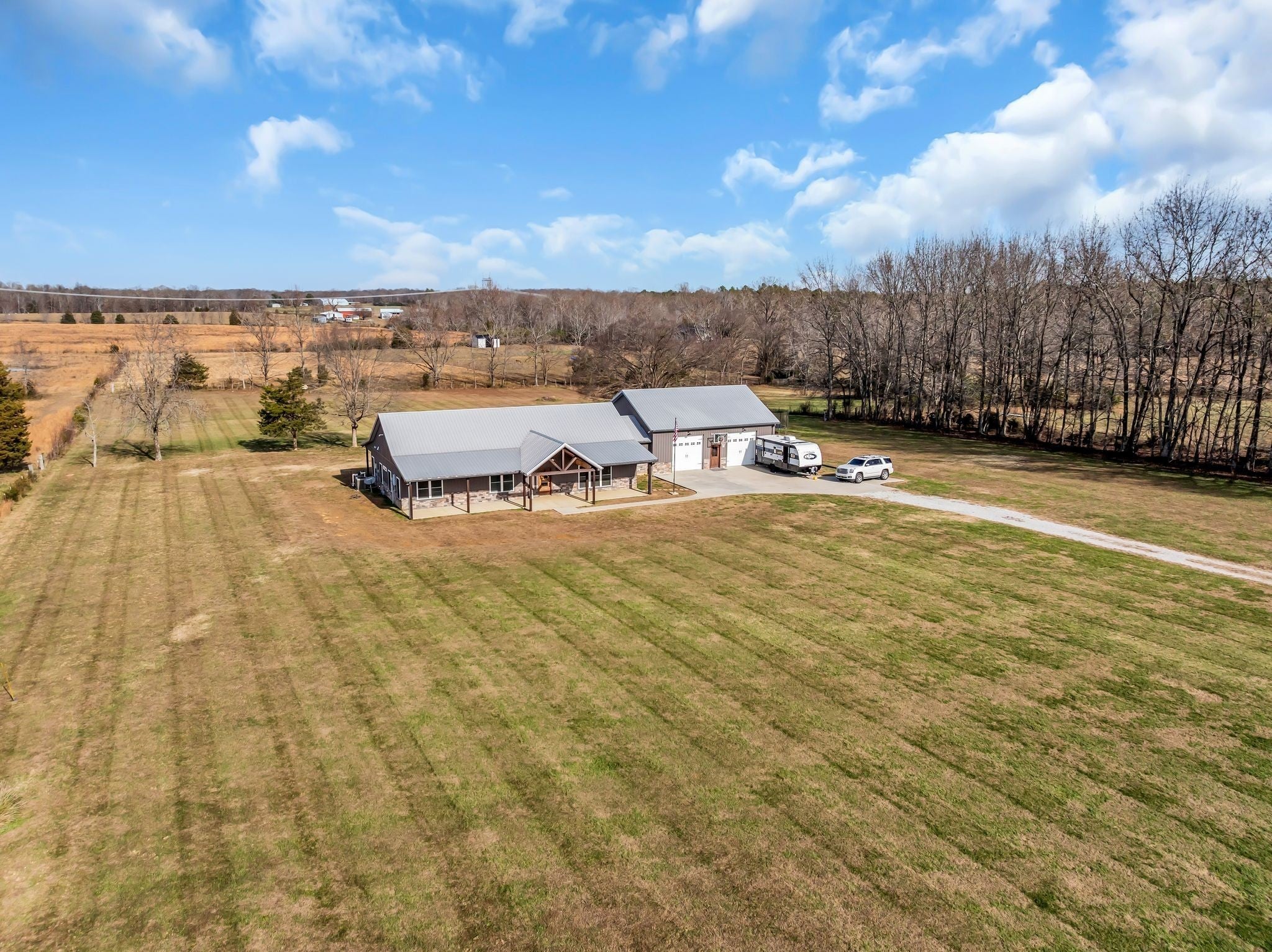 Luxury meets functionality on 5 acres in this exceptional barndominium-style home featuring metal siding with rock accents and covered front and rear porches. Open-concept living showcases a gas rock fireplace and custom built-in cabinetry throughout. The custom kitchen offers an oversized bar, Quartzite countertops, soft-close cabinetry, smart appliances, and a hidden walk-in pantry. The primary suite is a private retreat with a custom walk-in closet and spa-like bath featuring cultured marble finishes, double vanities, and a tiled walk-in shower with dual shower heads and a center rain shower. Upgrades include 3’ solid wood doors, LVP flooring, TV wall mounts throughout, and energy-efficient double-hung argon gas–filled windows. Enjoy outdoor living with speakers wired for surround sound on the back porch and an in-ground fiberglass pool with splash pad and built-in bubblers. The massive 34x40 garage includes two oversized doors, half bath, custom bar, built-in storm shelter, and tankless water heater. Property also features a metal 5-stall barn with tack room, loft, water spigot, and separate fencing for animals. A rare blend of modern luxury, comfort, and versatility. See MLS # 3130896 for Land Details