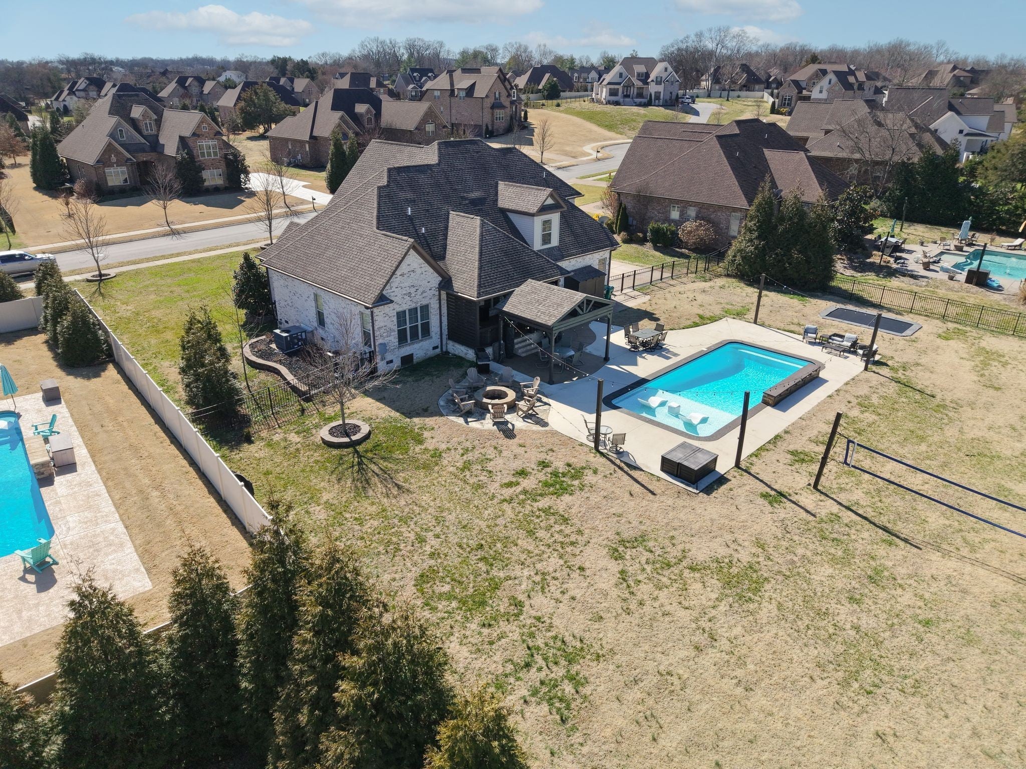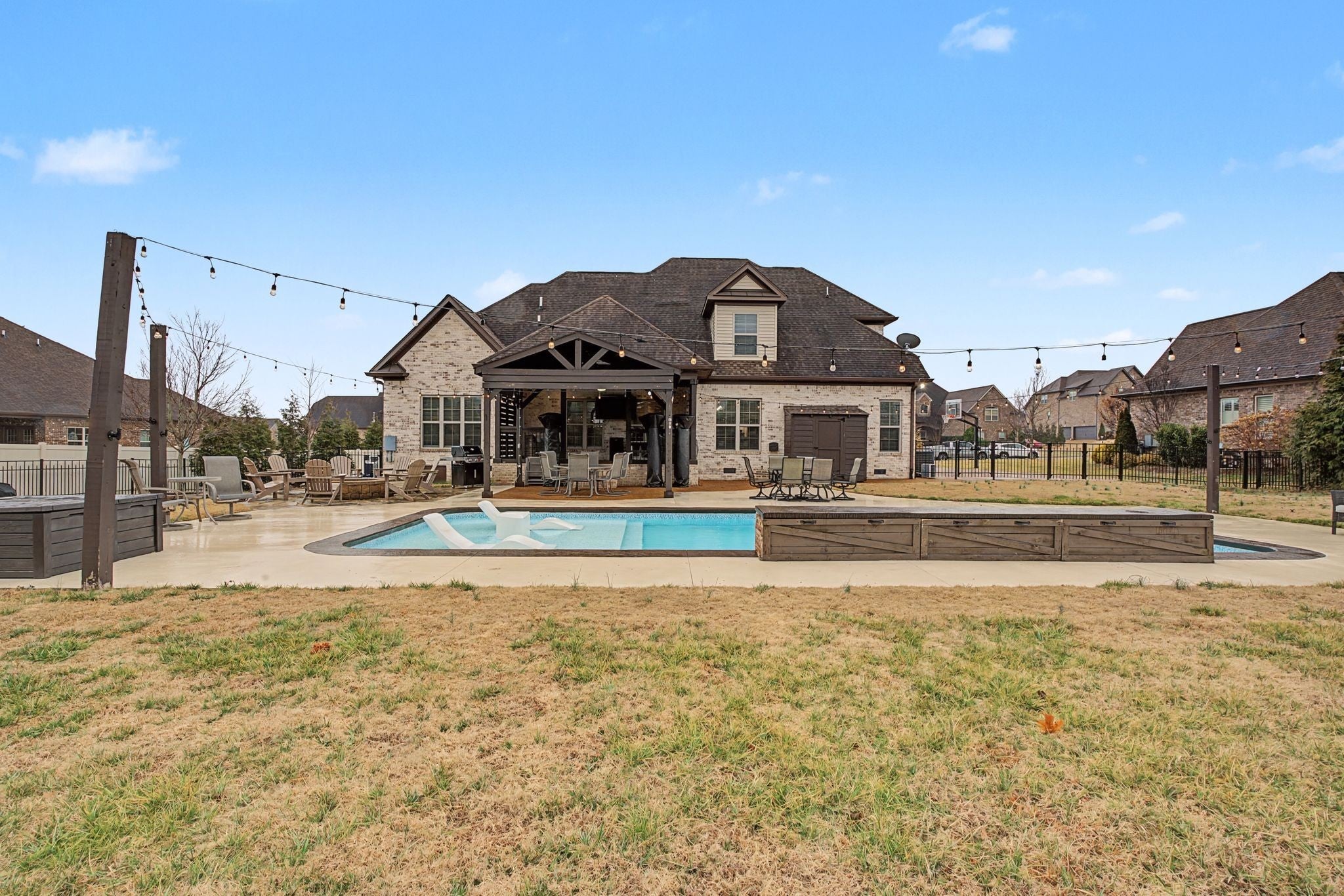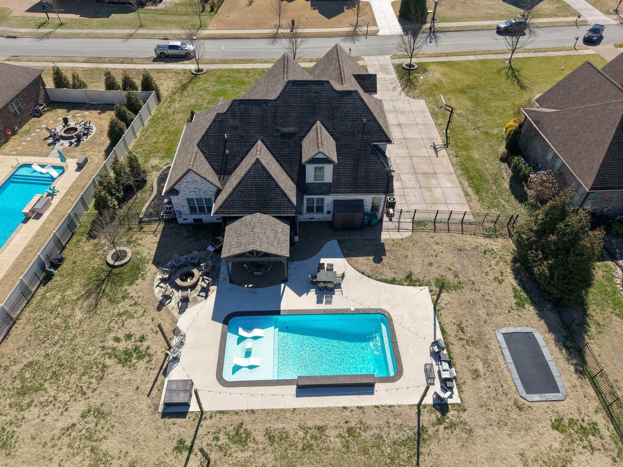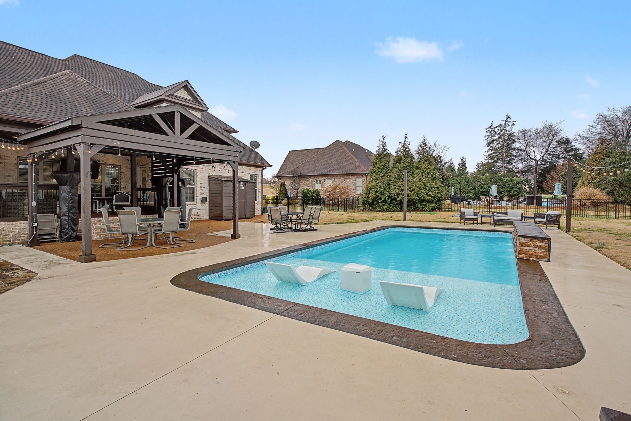 All-Brick Custom Home on the west side of Lebanon in sought-after Farmington Woods. Home features a professionally remodeled kitchen and baths. The main level offers two bedrooms, including a large primary with a beautiful vaulted ceiling accented with wood beams and includes an ensuite with large walk-in closet, double vanities, a walk-in steam shower, a relaxing soaking tub. A second main-level room perfect for a bedroom or office. Upstairs offers 3 bedrooms and a large bonus room that is over a 3-car side-entry garage with ample parking. Outdoor offers a private large 0.62 acre lot fenced-in backyard with a heated in-ground pool with tanning ledge, inground trampoline, pergola and firepit. New pool pump and heater. Exterior holiday lights professionally installed.Great for all your entertaining needs!