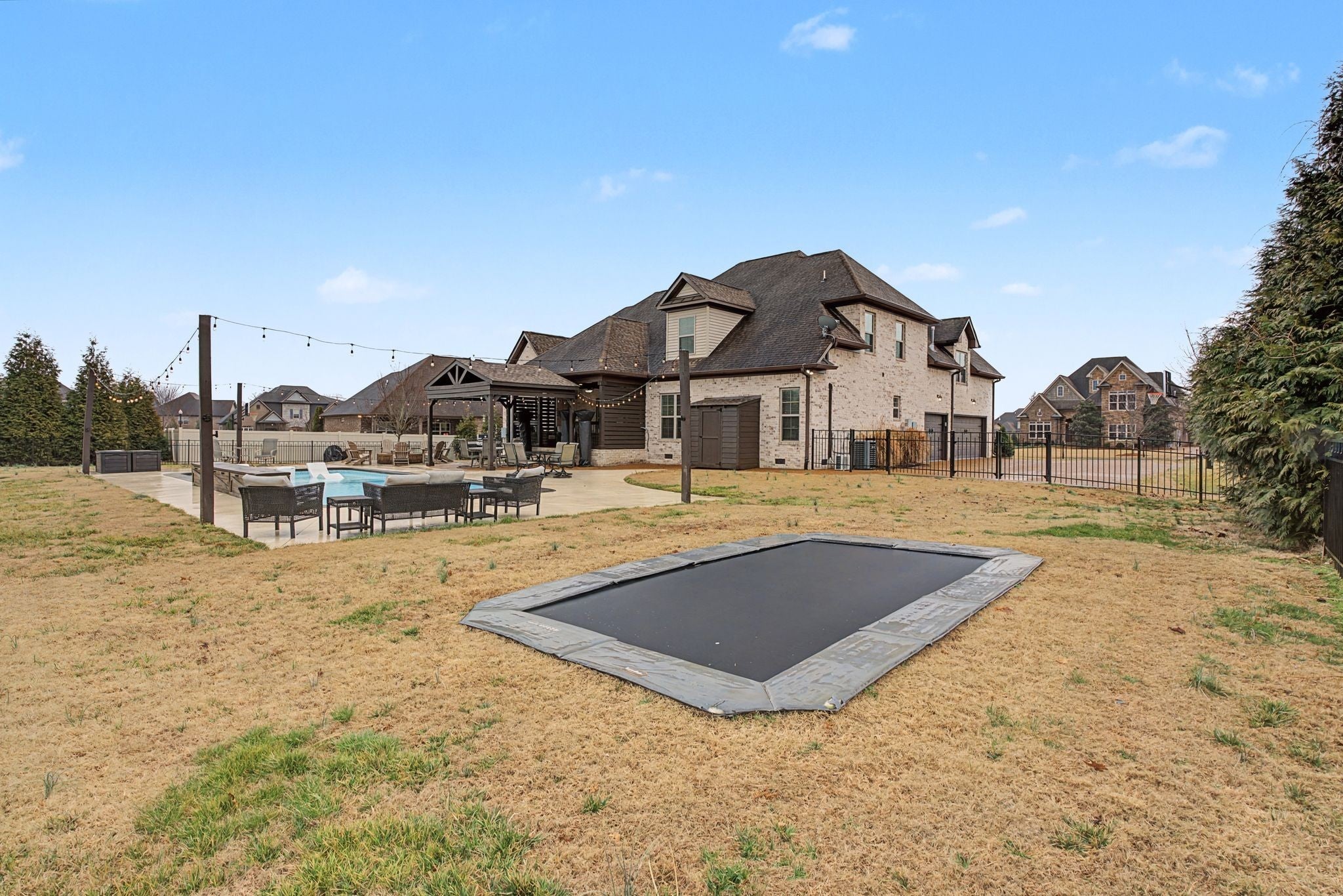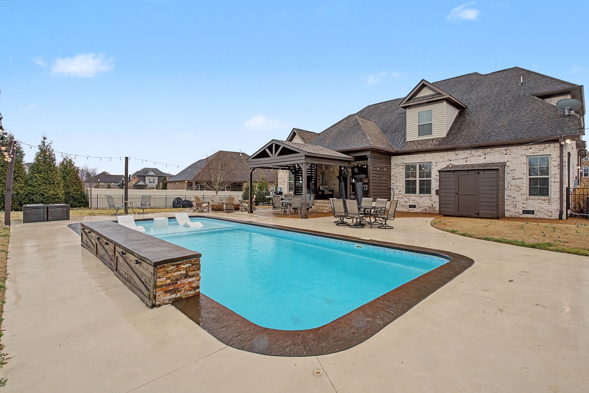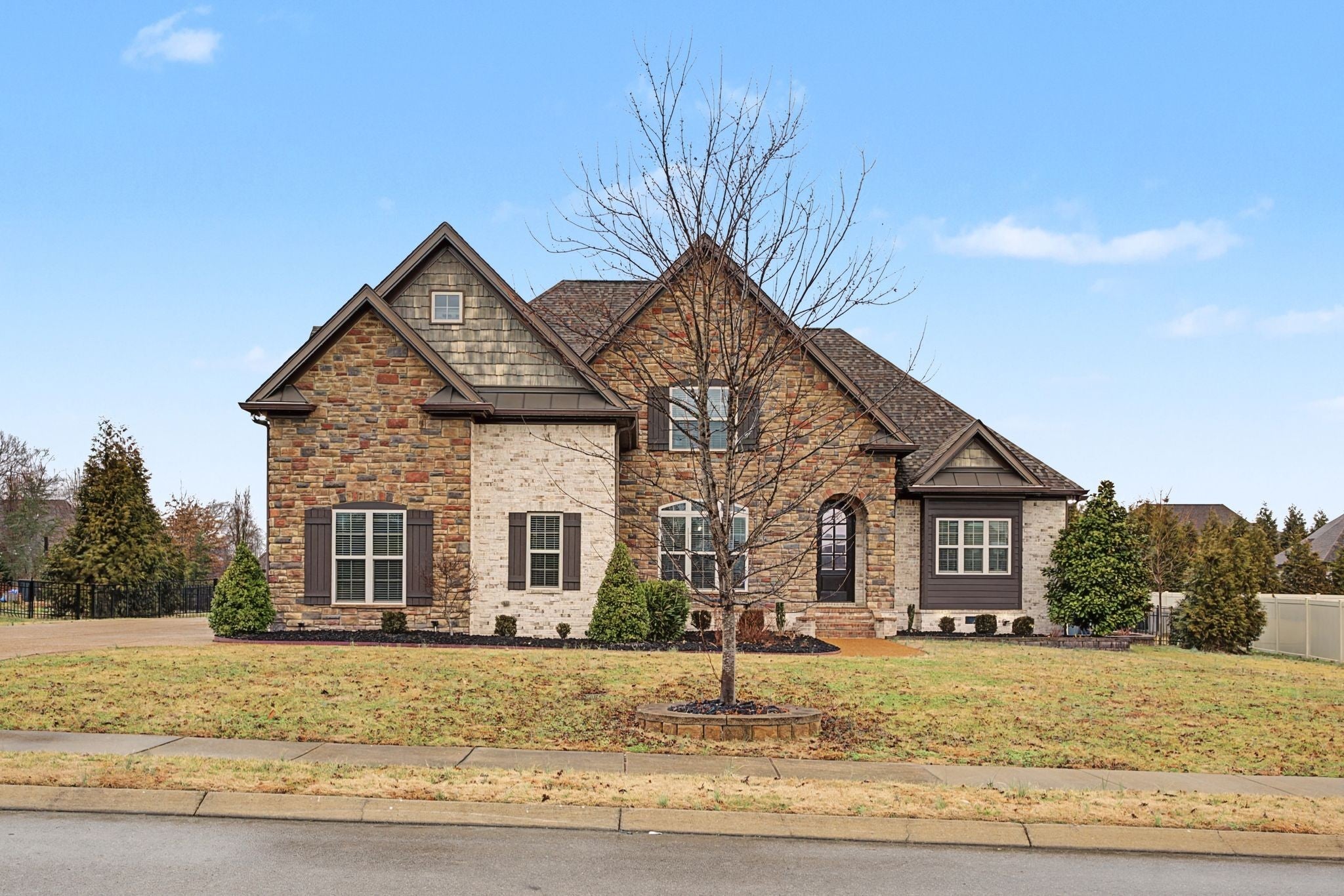 All-Brick Custom Home on the west side of Lebanon in sought-after Farmington Woods. Home features a professionally remodeled kitchen and baths. The main level offers two bedrooms, including a large primary with a beautiful vaulted ceiling accented with wood beams and includes an ensuite with large walk-in closet, double vanities, a walk-in steam shower, a relaxing soaking tub. A second main-level room perfect for a bedroom or office. Upstairs offers 3 bedrooms and a large bonus room that is over a 3-car side-entry garage with ample parking. Outdoor offers a private large 0.62 acre lot fenced-in backyard with a heated in-ground pool with tanning ledge, inground trampoline, pergola and firepit. New pool pump and heater. Exterior holiday lights professionally installed.Great for all your entertaining needs!