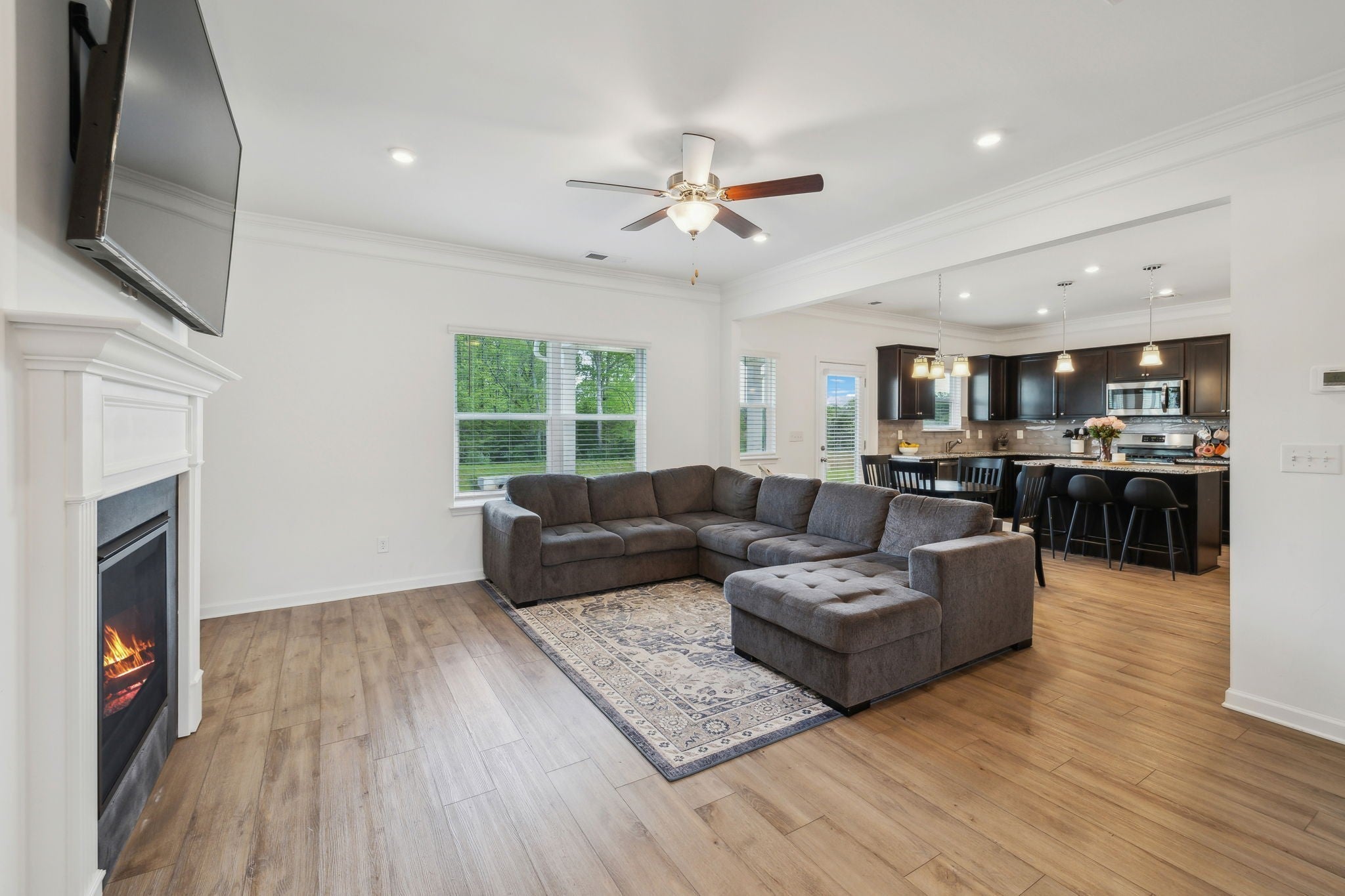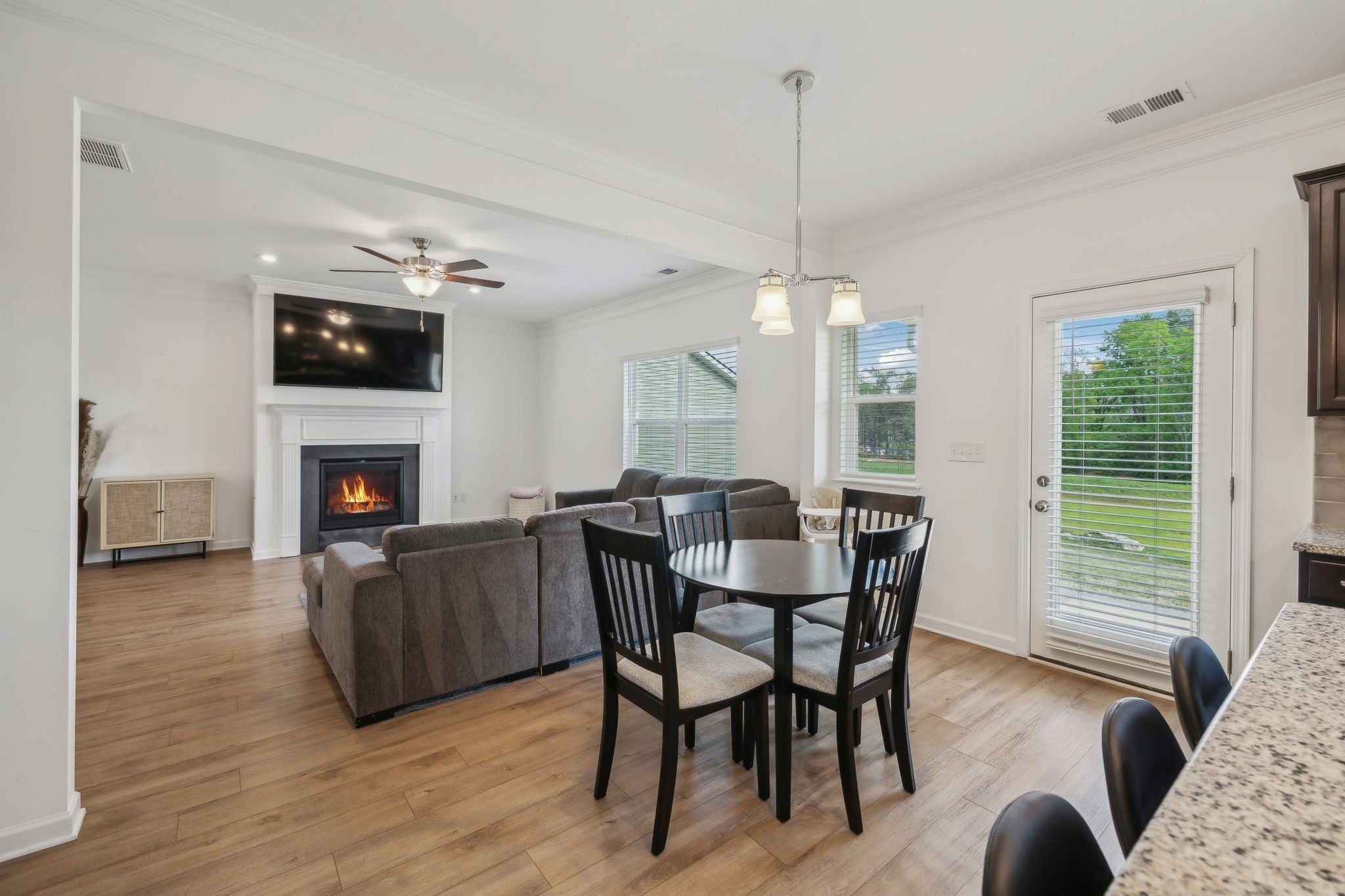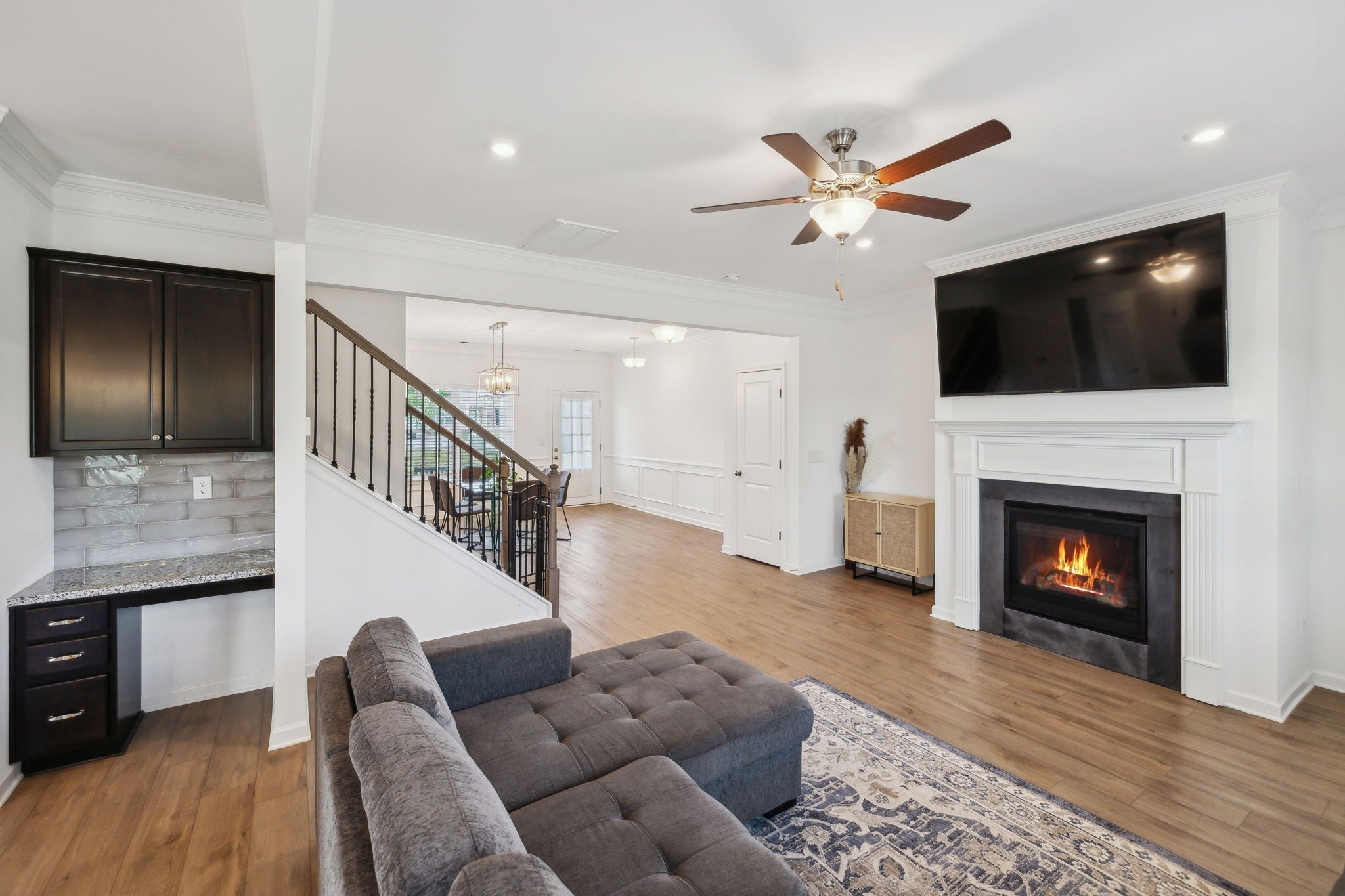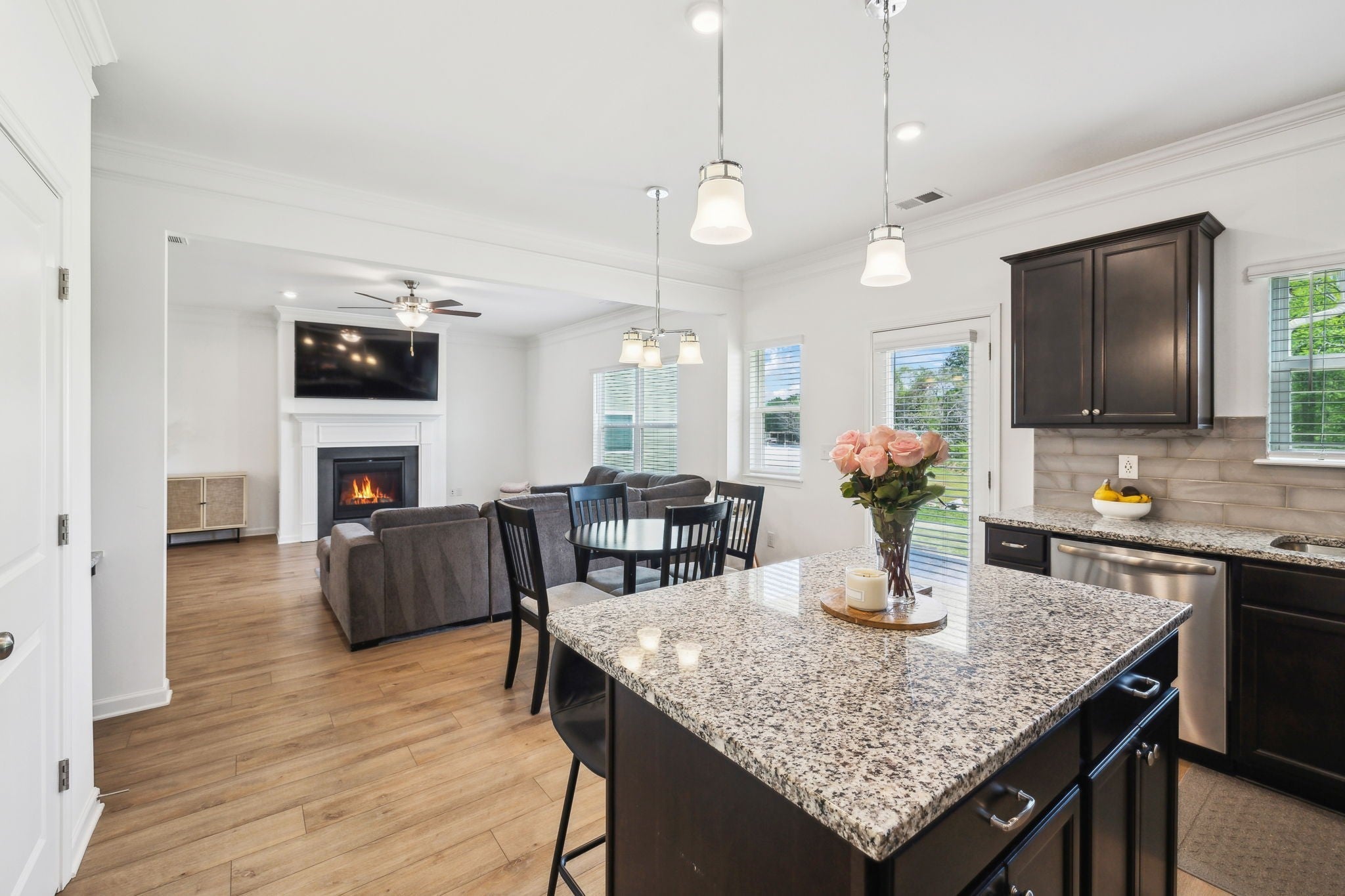 Welcome to this beautiful, like-new 4-bedroom, 2.5-bathroom home in the sought-after Union Station Subdivision! Built only three years ago and nestled in a peaceful cul-de-sac, this home offers fantastic curb appeal and a serene setting you’ll love coming home to. Inside, you’ll find a well-maintained, open-concept layout featuring luxury vinyl plank flooring throughout the main living areas. The formal dining room with classic wainscoting sets the scene for memorable gatherings, while the spacious living room boasts a sleek, white-mantled gas fireplace- perfect for cozy evenings. The kitchen is ideal, with granite countertops, rich espresso cabinetry, an island with seating, and a gas stove. A built-in desk area provides an ideal nook for remote work or homework. The convenient half bath on the main level is perfect for guests. Upstairs, retreat to the expansive primary suite complete with dual walk-in closets, a large double vanity with ample storage, a relaxing garden tub, and a walk-in tiled shower. Three additional bedrooms share a full bath featuring a double vanity and a separate toilet/shower area- perfect for busy mornings. The laundry room is also upstairs, making daily chores a breeze. Step outside to enjoy an open backyard with lush greenery and a covered patio- ideal for unwinding in the shade, as you take in beautiful Tennessee sunsets. With a serene, country feel yet just minutes from Shelbyville Square’s shopping, dining, and amenities, this home truly has it all. Schedule your private tour today! Washer, dryer, refrigerator and water softener/filtration system remain.
