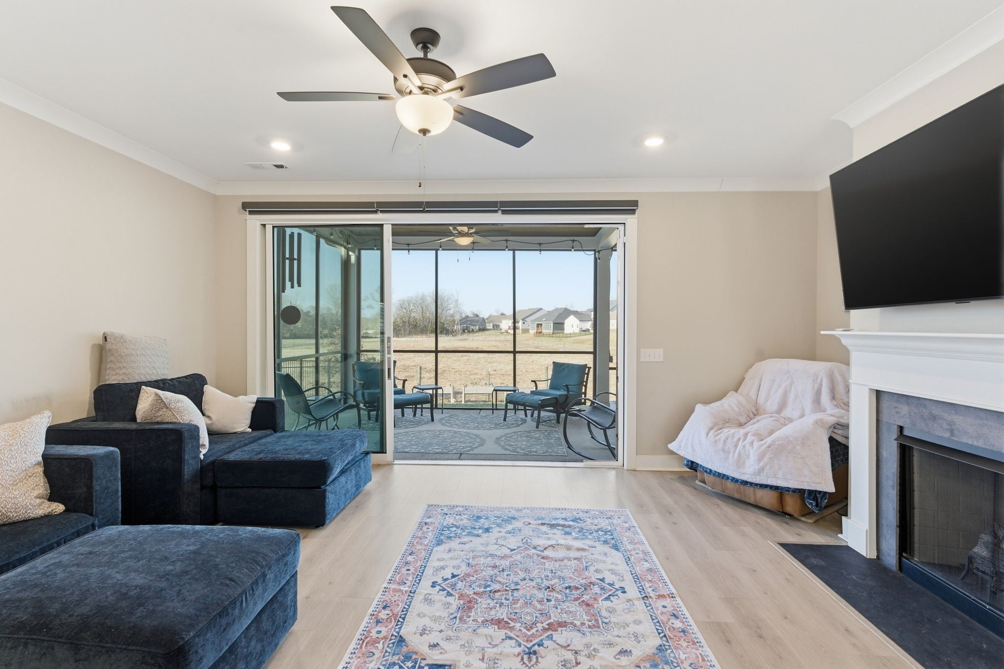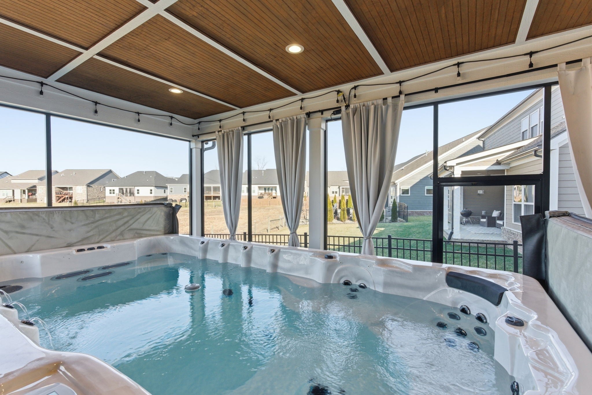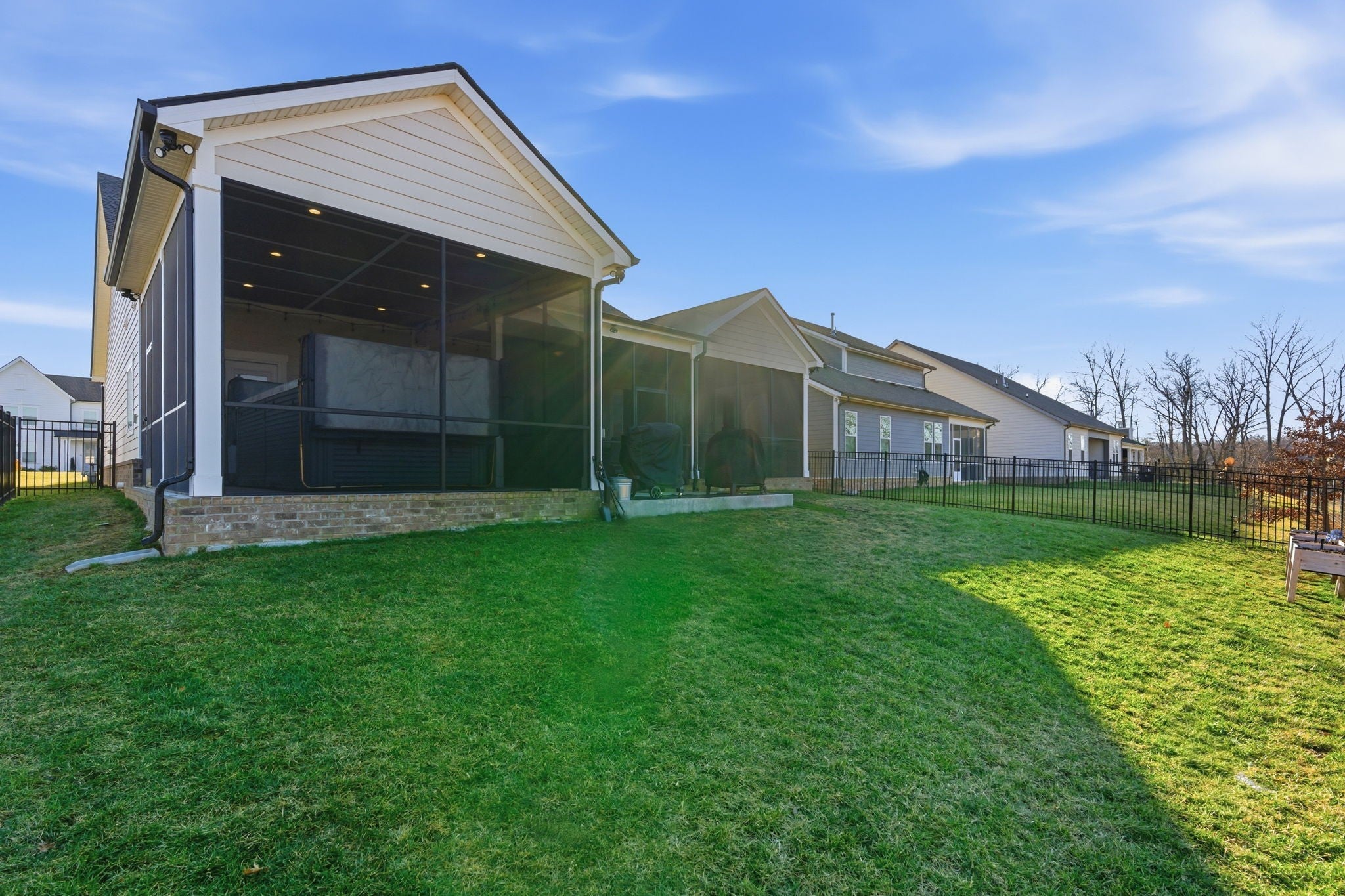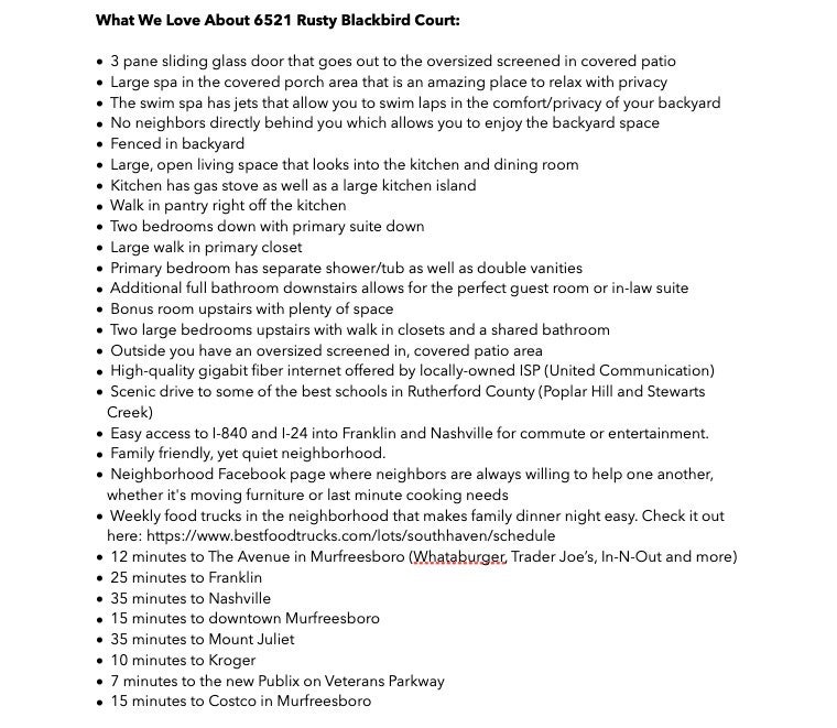 This well-designed home is in South Haven in Murfreesboro on a quiet cul-de-sac street, has no rear neighbors and a giant spa for year round relaxation. It provides the convenience of one-level living home with 2 bedrooms and 2 full bathrooms on the main floor, including a spacious primary suite. Upstairs, you have 2 additional bedrooms, 1 full bath up and a large bonus room that can flex as a media room, playroom, office, or guest space. The primary retreat features a large walk-in closet, double vanities, a tiled walk-in shower, and a separate soaking tub. The heart of the home is the open-concept kitchen and living area, ideal for both everyday living and entertaining. You’ll love the gas stove, abundant prep space, walk in pantry and seamless flow into the main living room with a cozy fireplace. One of the standout features is the oversized three-panel sliding glass door that fills the home with natural light and creates an easy indoor-outdoor connection. Step outside to an extended screened-in back patio (45 x 21) built for year-round enjoyment. The giant outdoor spa, which is as large as some pools, has been HOA approved and is here to stay for the new owner. The swim spa allows you to set the jets to where you can be swimming in the comfort/privacy of your own backyard. The screened design adds comfort and function, and the private backyard setting with no homes directly behind you creates a peaceful escape. The laundry room is conveniently located downstairs. South Haven residents enjoy neighborhood amenities such as a community pool, food truck on Thursday nights and community gatherings. With its functional layout, upgraded outdoor living, and prime South Haven location, this home offers the perfect blend of privacy, comfort, style, and practicality. The home is zoned for the brand new Poplar Hill Elementary School and will be zoned for the brand new Poplar Hill Middle School in 2026. Get to know one of the best neighborhoods in Rutherford County today!