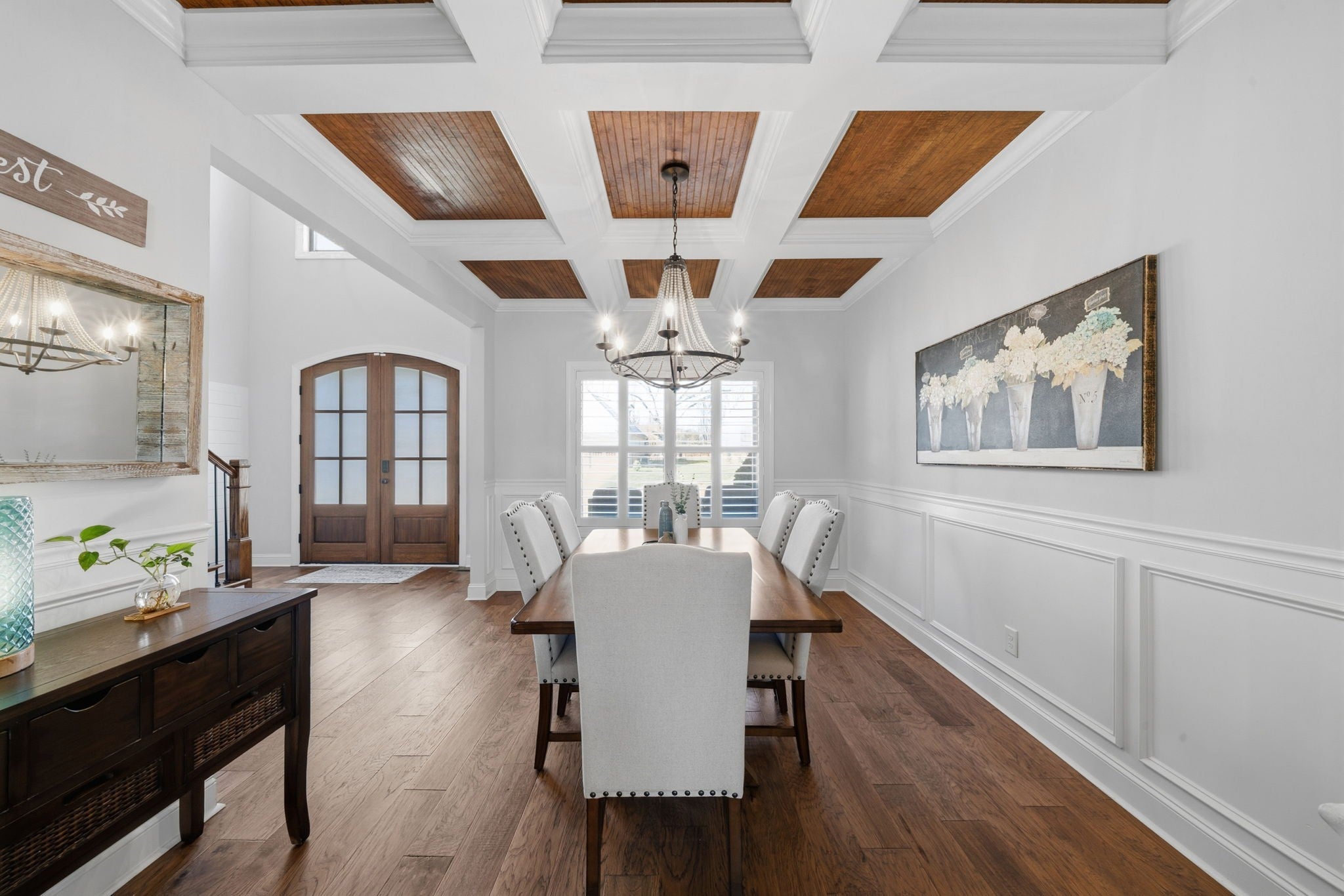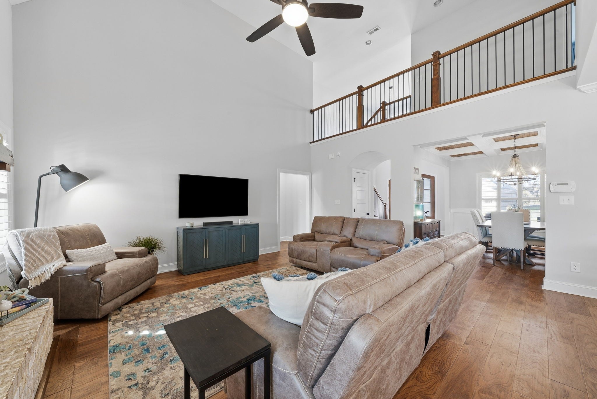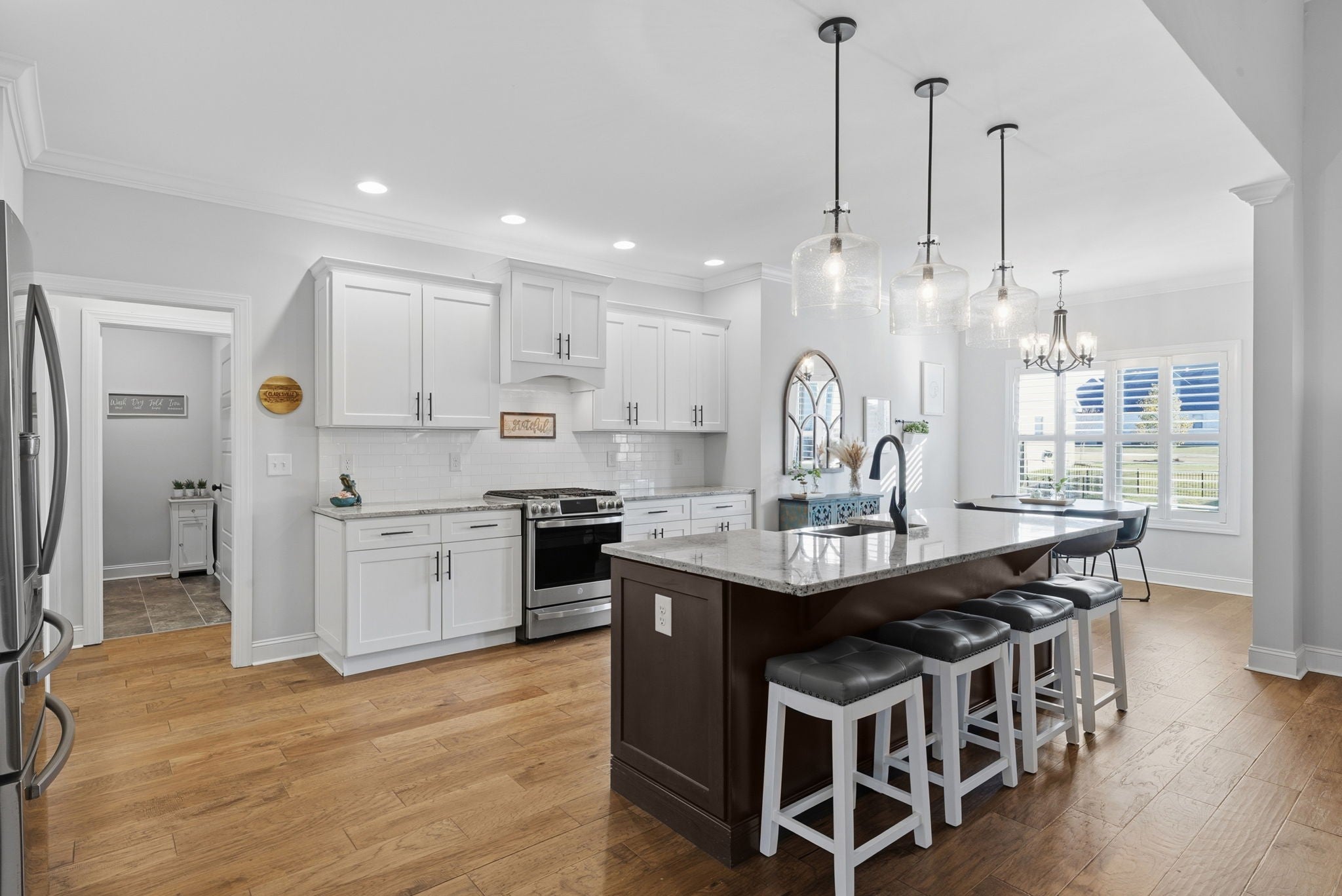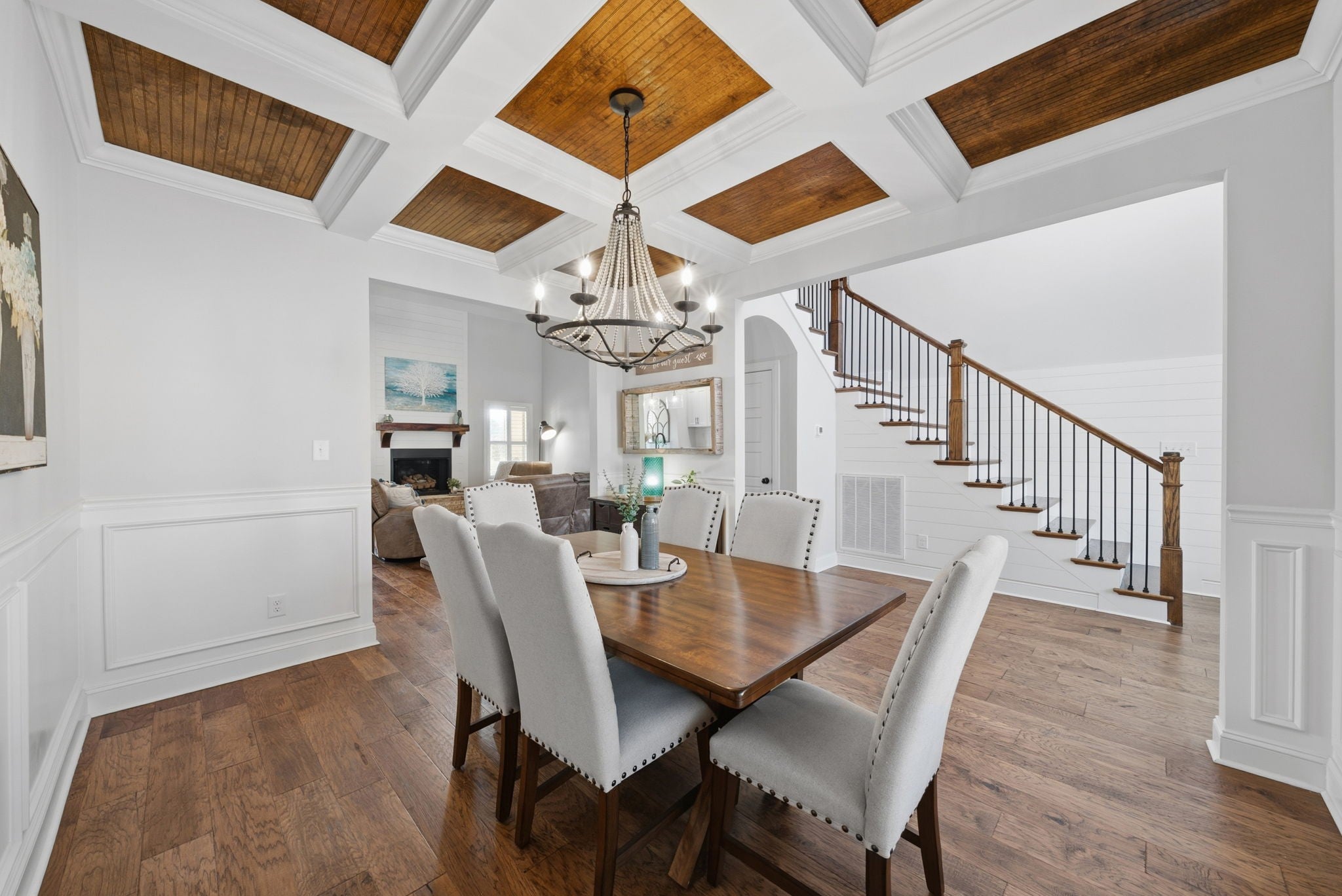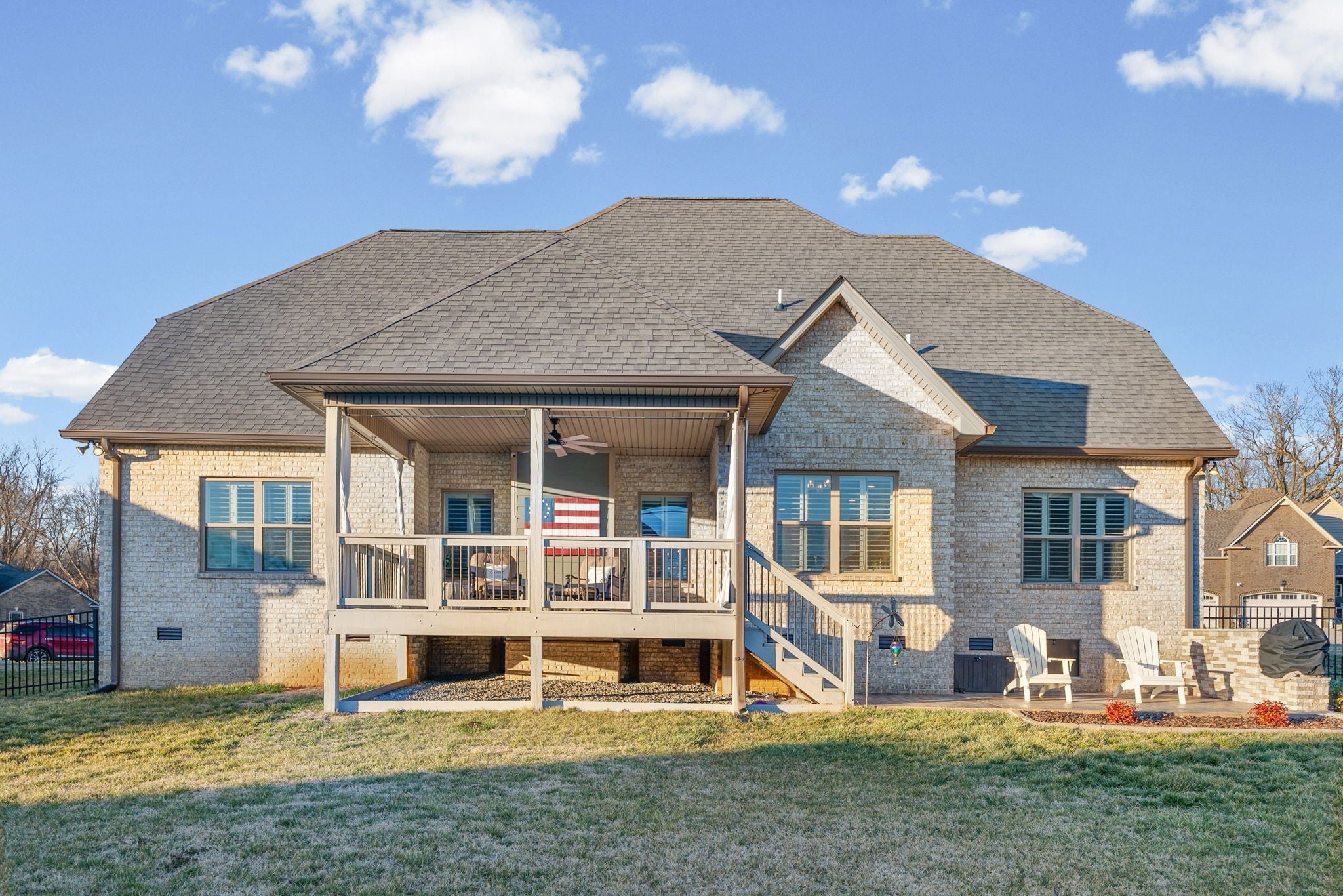 Welcome home to this beautifully upgraded residence featuring refined details throughout. An impressive 10-foot entry door, plantation shutters, and a stunning shiplap fireplace create a warm yet sophisticated main living space. The gourmet eat-in kitchen offers granite countertops, a gas range, and newer stainless steel appliances. A gorgeous formal dining room with custom coffered ceilings provides the perfect setting for entertaining. The primary suite on the main level is a private retreat, complete with an oversized walk-in closet featuring custom shelving. Upstairs, spacious secondary bedrooms each include Newer carpet,as well as walk-in closets. The bonus room with a stylish wet bar adds the perfect touch for entertaining or relaxing. Enjoy outdoor living on the covered deck equipped with new ceiling fan and newly installed stamped patio adding to the already spacious fenced backyard — ideal for all your backyard needs. The garage includes new storage cabinets for added convenience and organization. Luxury, comfort, and thoughtful upgrades come together beautifully in this exceptional home.Video link at the bottom!!