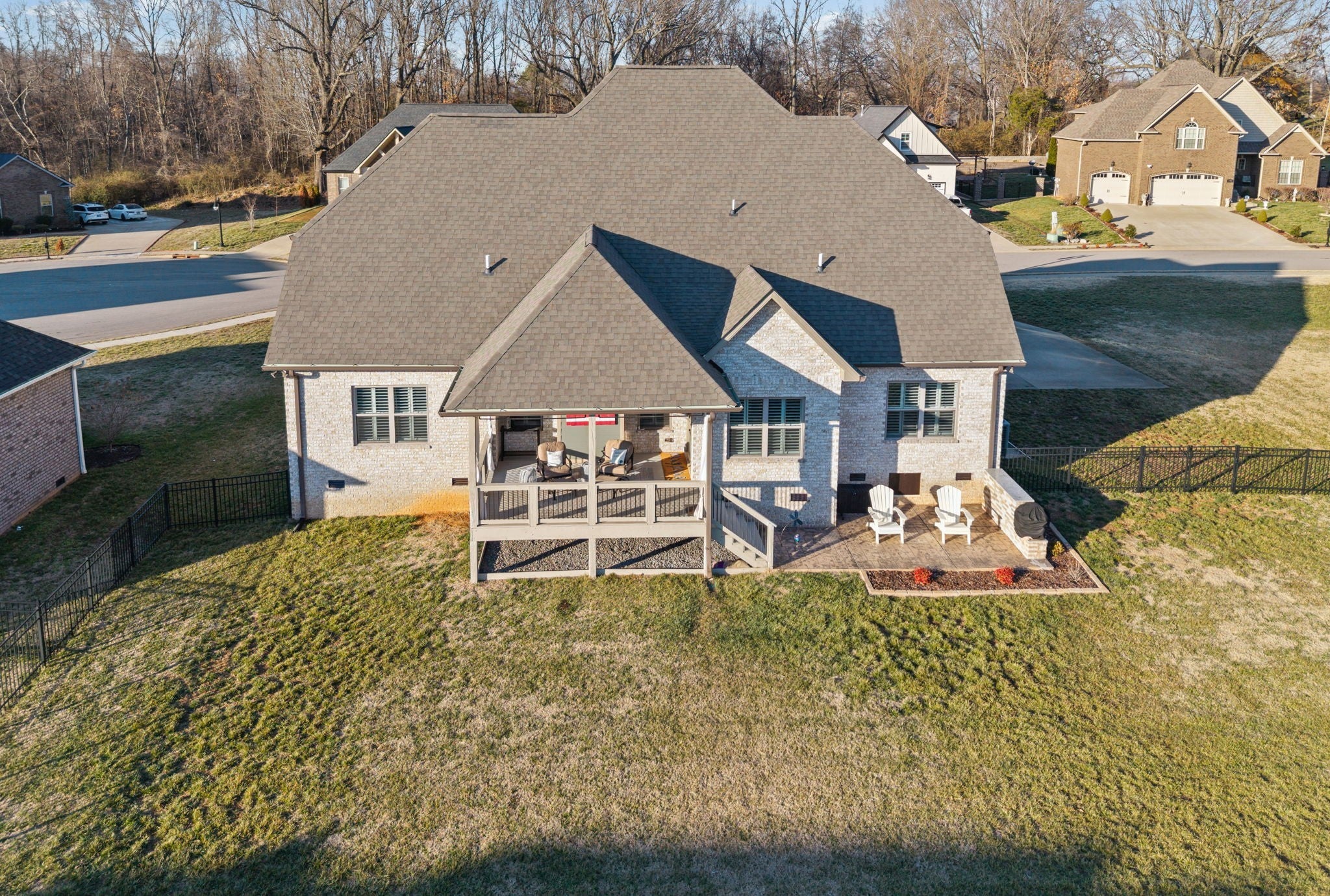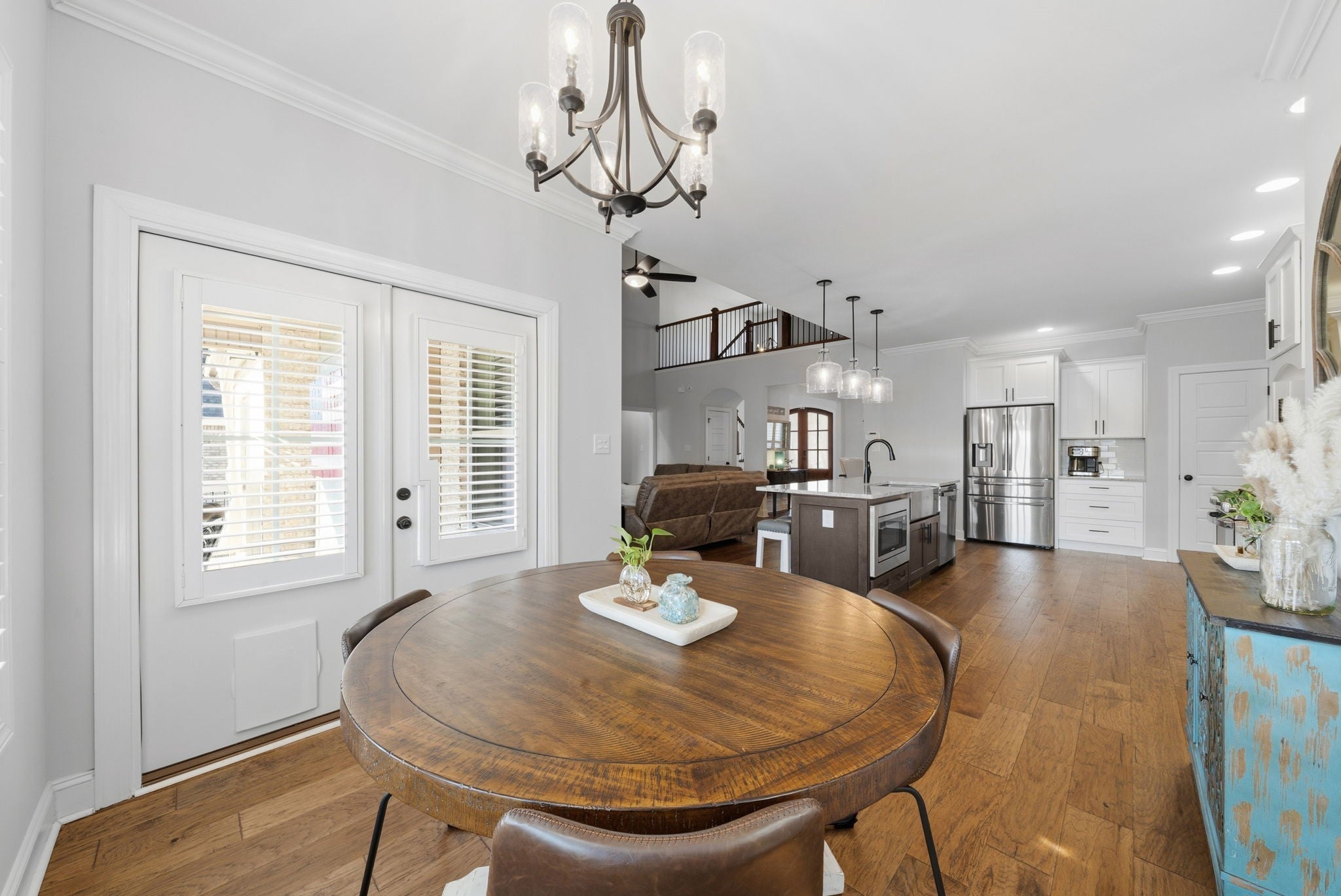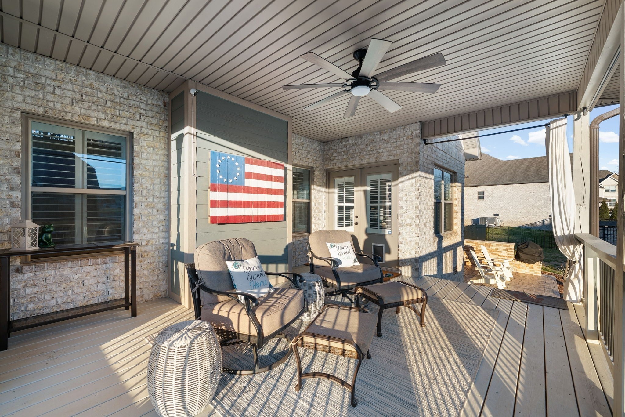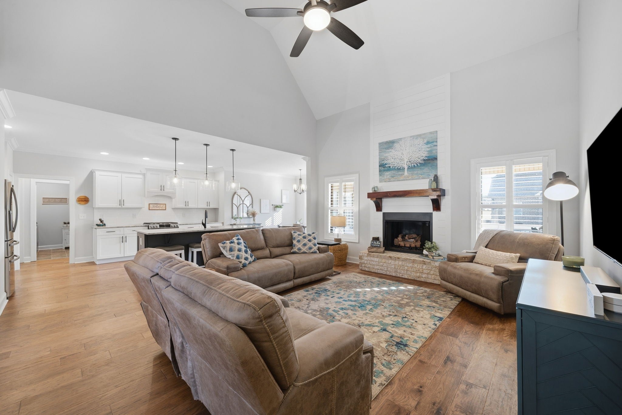 Welcome home to this beautifully upgraded residence featuring refined details throughout. An impressive 10-foot entry door, plantation shutters, and a stunning shiplap fireplace create a warm yet sophisticated main living space. The gourmet eat-in kitchen offers granite countertops, a gas range, and newer stainless steel appliances. A gorgeous formal dining room with custom coffered ceilings provides the perfect setting for entertaining. The primary suite on the main level is a private retreat, complete with an oversized walk-in closet featuring custom shelving. Upstairs, spacious secondary bedrooms each include Newer carpet,as well as walk-in closets. The bonus room with a stylish wet bar adds the perfect touch for entertaining or relaxing. Enjoy outdoor living on the covered deck equipped with new ceiling fan and newly installed stamped patio adding to the already spacious fenced backyard — ideal for all your backyard needs. The garage includes new storage cabinets for added convenience and organization. Luxury, comfort, and thoughtful upgrades come together beautifully in this exceptional home.Video link at the bottom!!