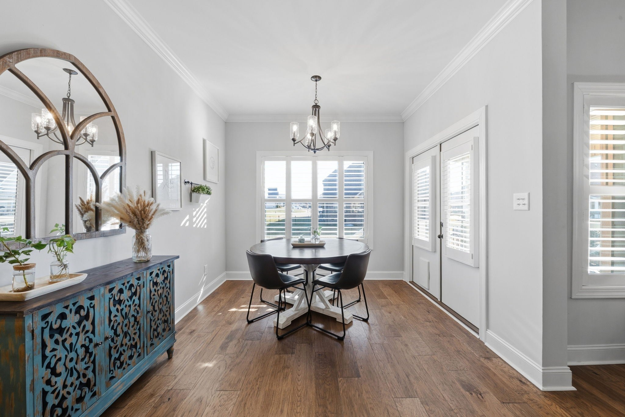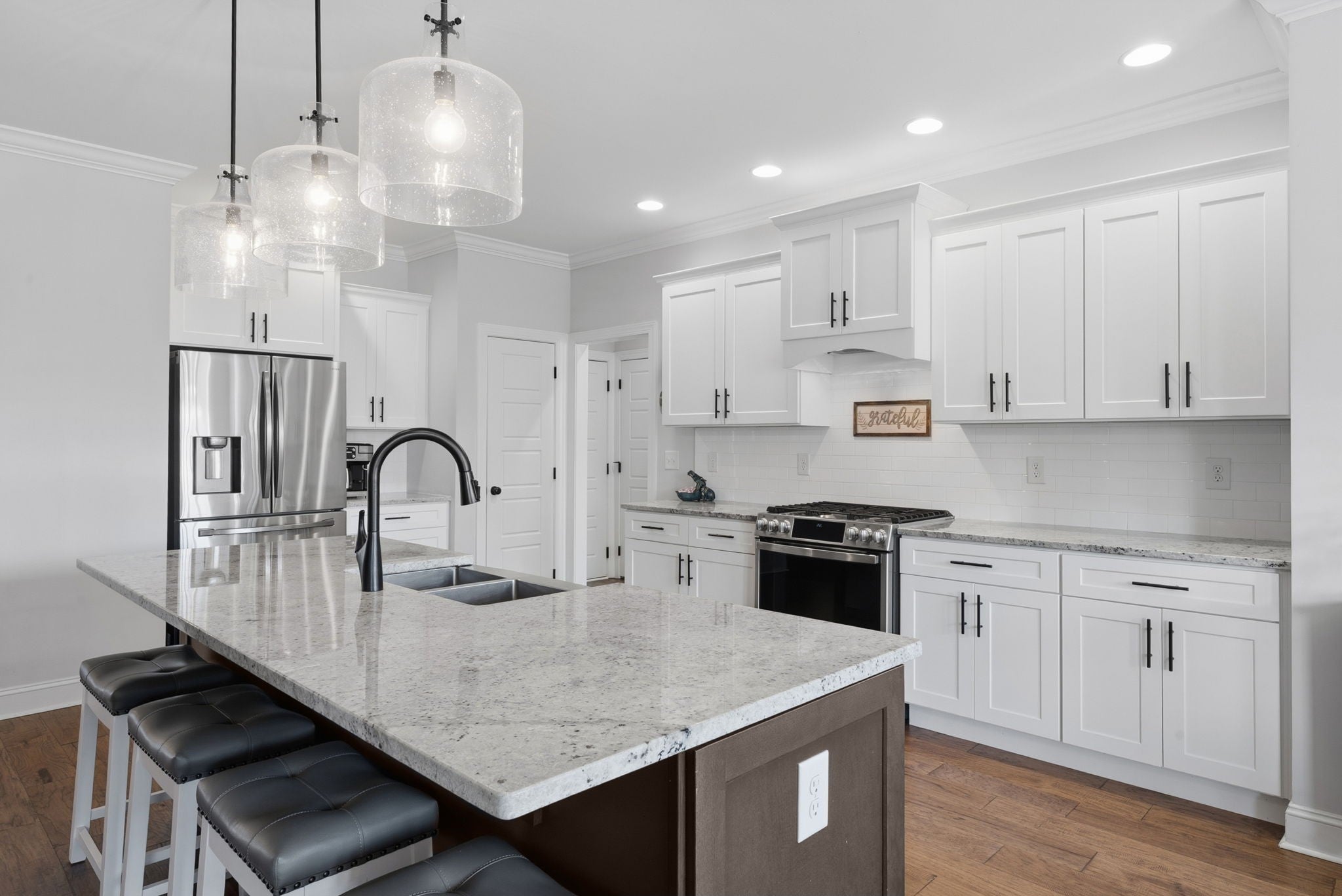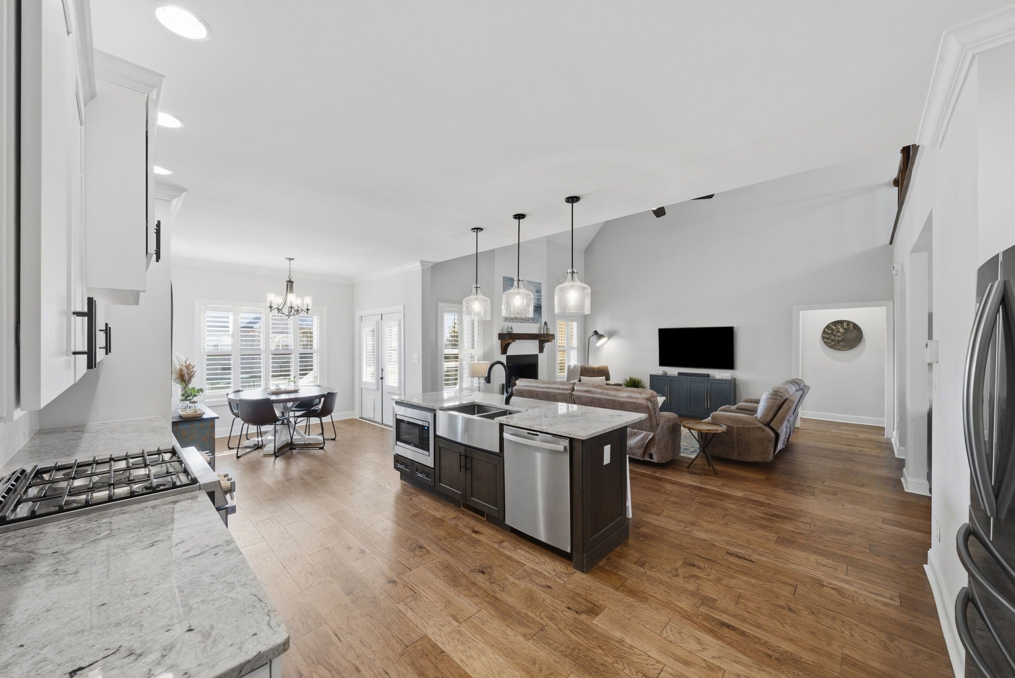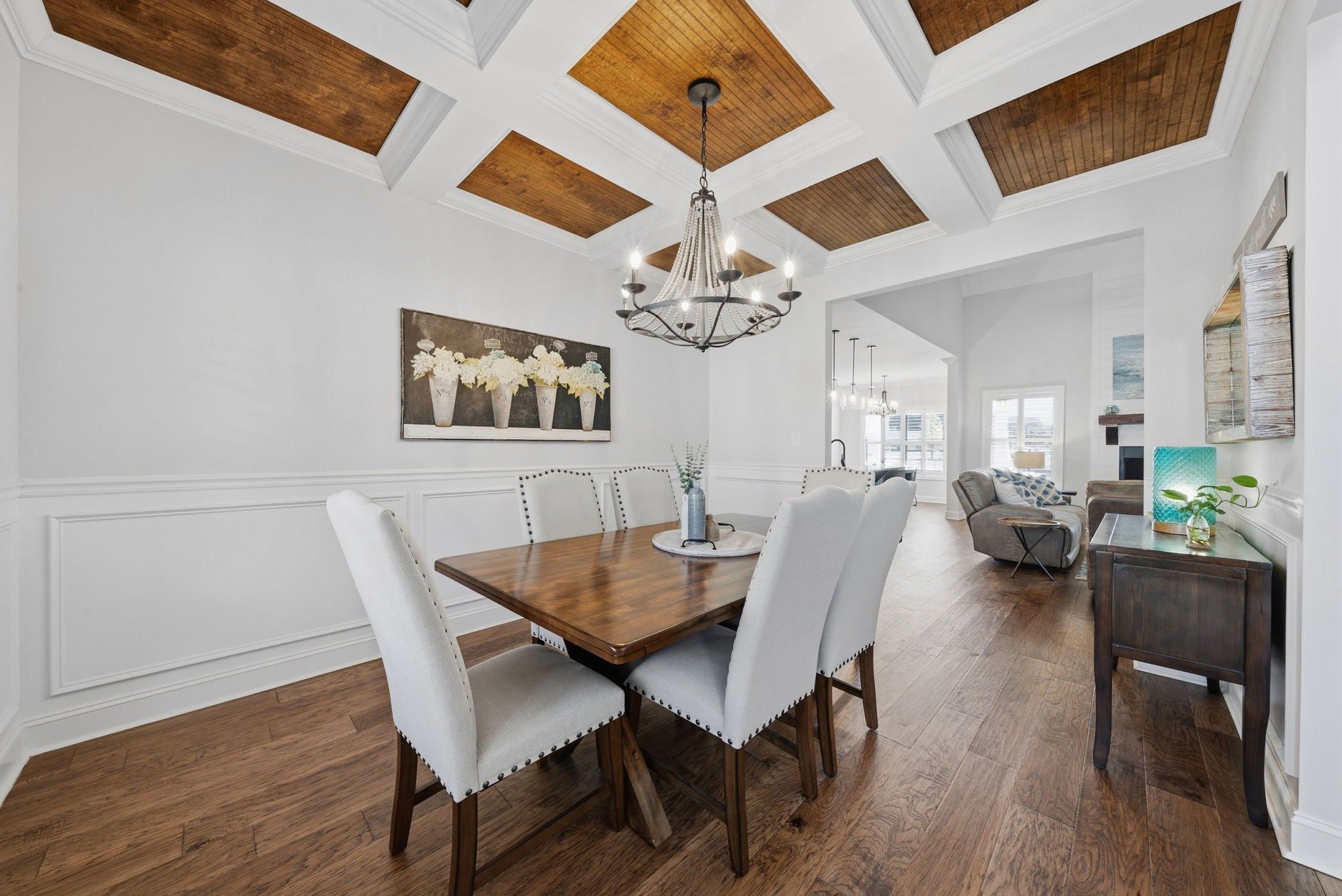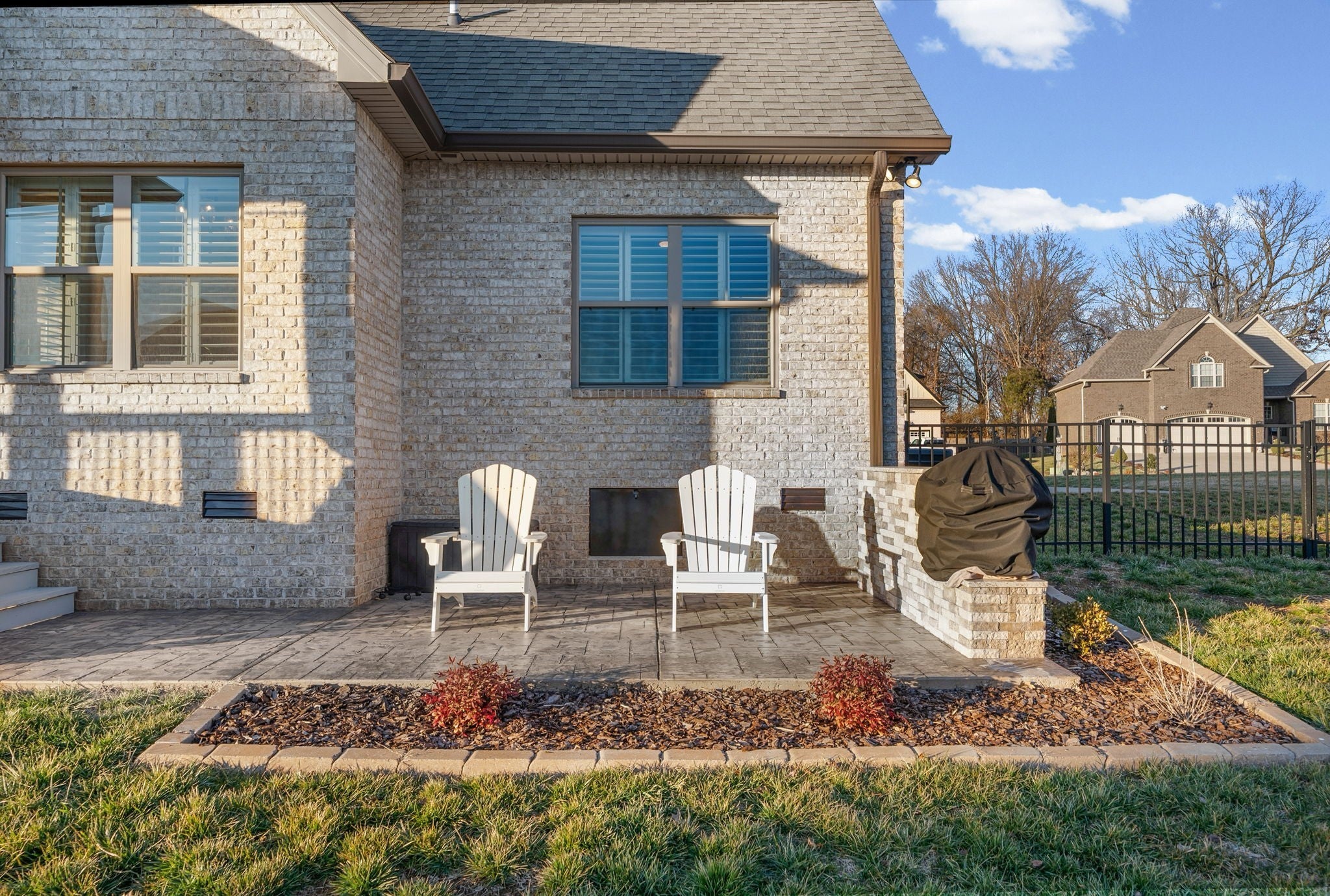 Welcome home to this beautifully upgraded residence featuring refined details throughout. An impressive 10-foot entry door, plantation shutters, and a stunning shiplap fireplace create a warm yet sophisticated main living space. The gourmet eat-in kitchen offers granite countertops, a gas range, and newer stainless steel appliances. A gorgeous formal dining room with custom coffered ceilings provides the perfect setting for entertaining. The primary suite on the main level is a private retreat, complete with an oversized walk-in closet featuring custom shelving. Upstairs, spacious secondary bedrooms each include Newer carpet,as well as walk-in closets. The bonus room with a stylish wet bar adds the perfect touch for entertaining or relaxing. Enjoy outdoor living on the covered deck equipped with new ceiling fan and newly installed stamped patio adding to the already spacious fenced backyard — ideal for all your backyard needs. The garage includes new storage cabinets for added convenience and organization. Luxury, comfort, and thoughtful upgrades come together beautifully in this exceptional home.Video link at the bottom!!