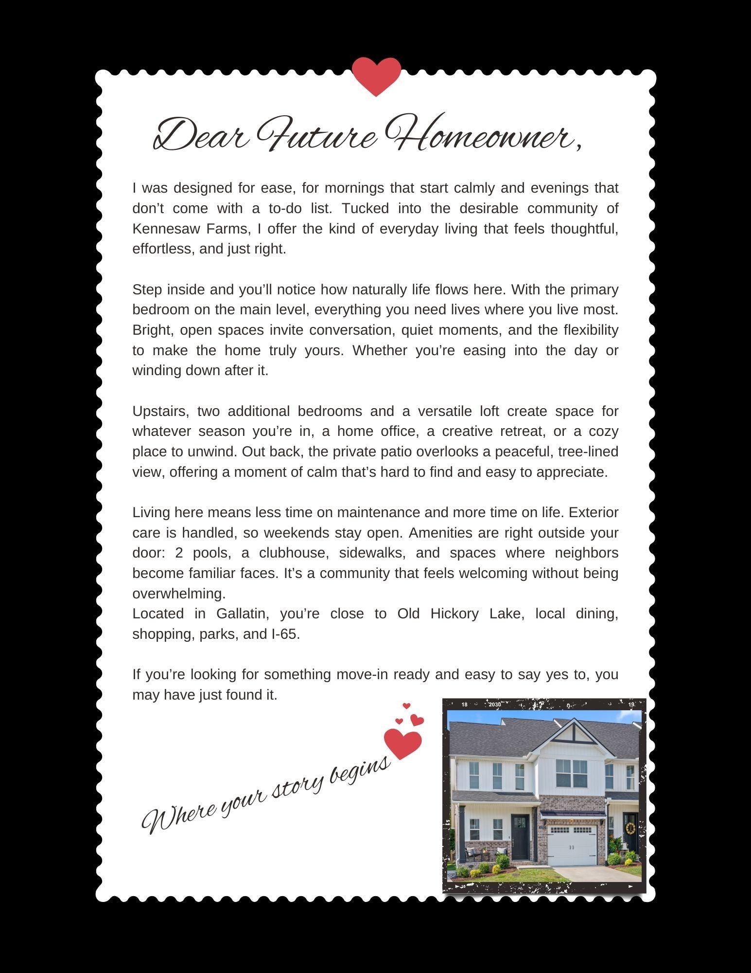 In Kennesaw Farms — Where Convenience Meets Lifestyle.... If you’ve been waiting for the right blend of space, simplicity, and smart value — this is it. Built in 2022 and barely lived in, this immaculate end-unit townhome offers 1,962 square feet of thoughtfully designed living space with something buyers are actively searching for: a main-level primary suite. The main-level primary suite makes everyday living convenient and accessible, ideal for those wanting fewer stairs without sacrificing space. The open-concept layout feels bright and inviting, with luxury vinyl plank flooring, stainless steel appliances, and a seamless flow perfect for everyday living or entertaining. Step out to your private patio with peaceful tree-lined views — no backyard maintenance required. Upstairs features two additional bedrooms plus a versatile loft, ideal for working from home, guests, media space, or a playroom. 1230 Hayloft Place is giving you a true lock-and-leave lifestyle. The community amenities elevate the experience even further, featuring two pools, a clubhouse, a fitness center, a playground, and sidewalks throughout. Location matters—and this one delivers. Just minutes from Old Hickory Lake, dining, shopping, parks, and with convenient access to Hendersonville, I-65, and Nashville, you’re positioned for both relaxation and commuting ease. At $355,000, this home offers modern construction, community amenities, and nearly 2,000 square feet in one of Gallatin’s most desirable areas—without the maintenance demands of a detached home. The seller is offering $3,500 toward closing costs or an interest-rate buydown with the preferred lender, creating even more opportunity for buyers looking to make a smart move in today’s market.