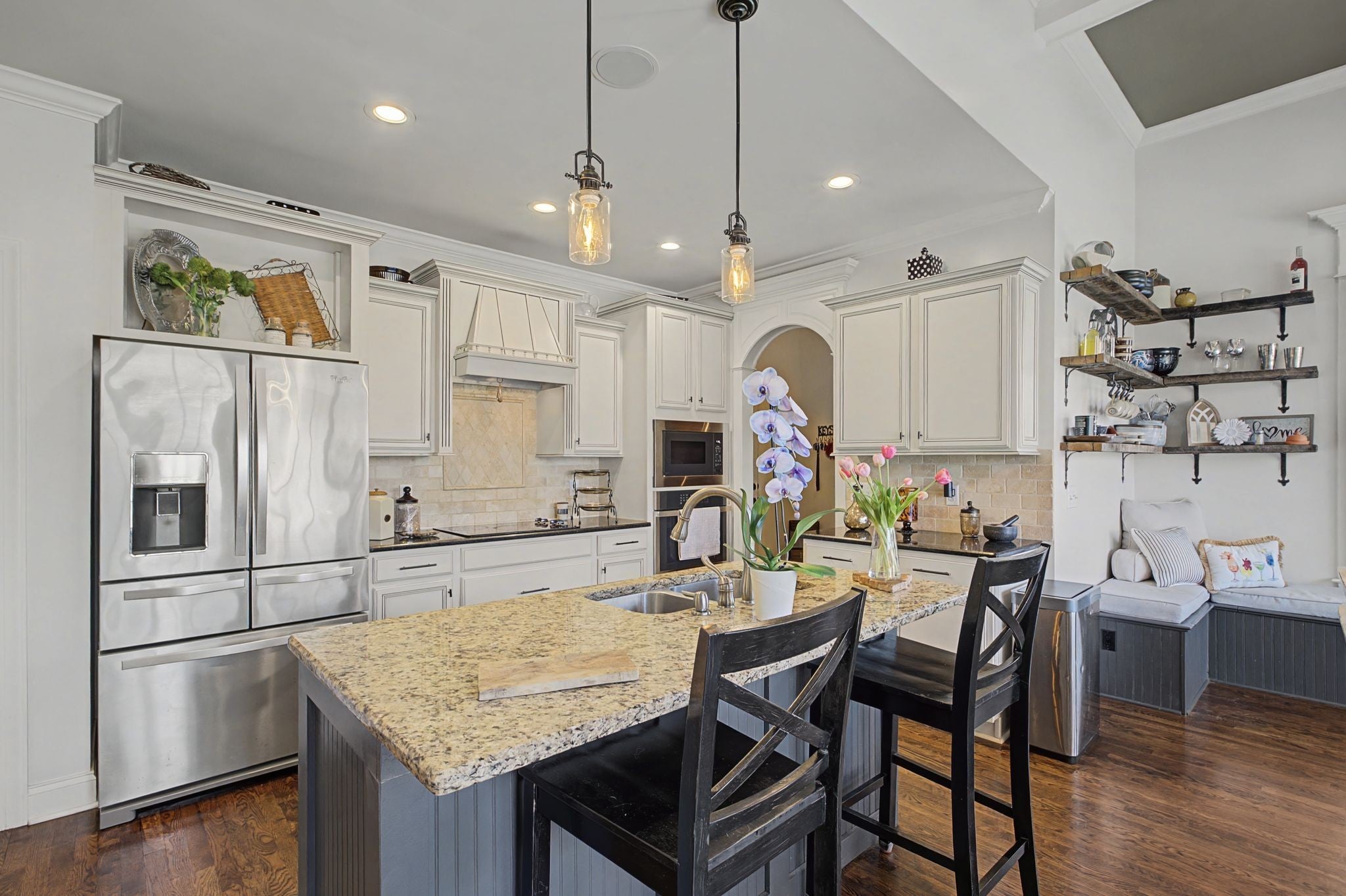 - Built-In Electric Oven, Cooktop, Dishwasher, Microwave, Refrigerator, Stainless Steel Appliance(s)