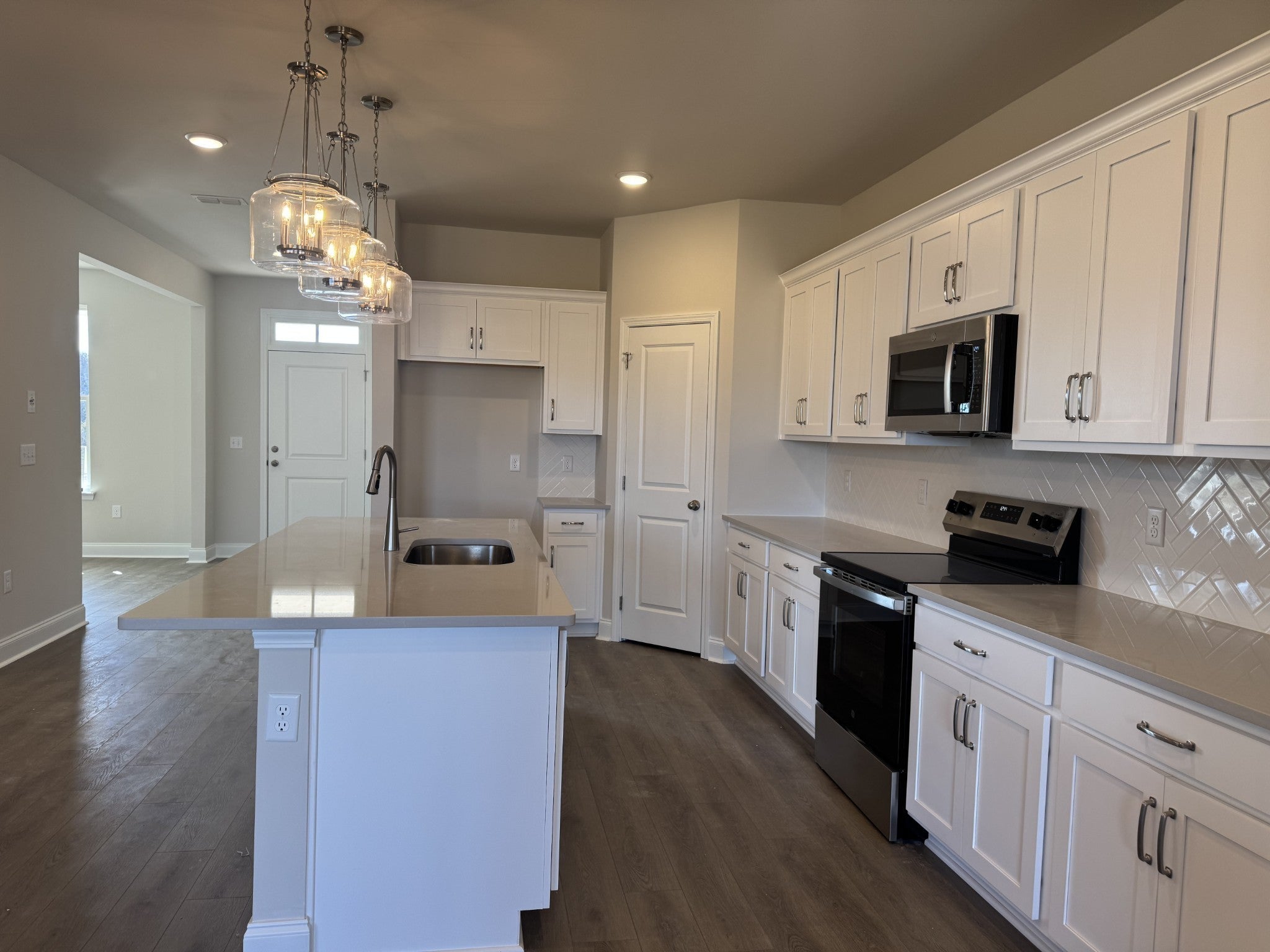Homesite 398. This open-concept Macon floorplan by Ashton Woods has the primary suite on the main level as well as a spacious study with French doors. Beyond the gourmet kitchen with double wall ovens, the dining area and family room flow together. Extend your dining outdoors onto the covered back patio. The oak stairs lead to a loft upstairs, perfect for game night. You'll also find 3 large bedrooms, each with a walk-in closet, and a hall bathroom with dual sinks. This home features custom design including slate blue cabinets, brushed nickel hardware, white quartz counters and a stunning grey and white kitchen backsplash. Photos of similar home.