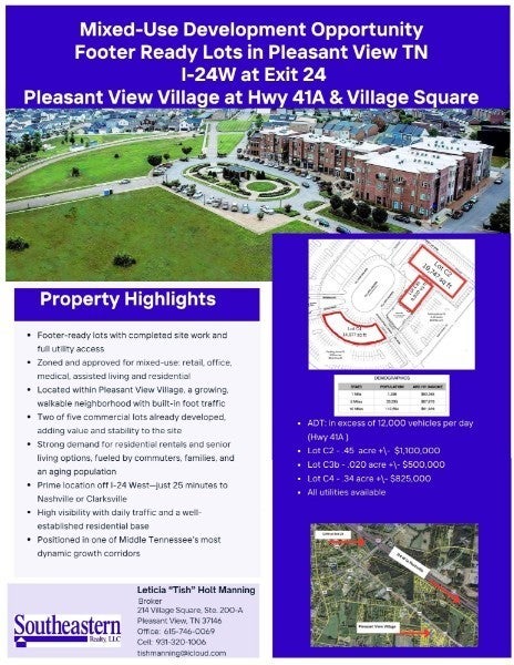 Footer-ready mixed-use lots in the heart of Pleasant View Village, a thriving, master-planned community perfectly positioned between Nashville and Clarksville off I-24 West at Exit 24. With site work completed and utilities in place, these parcels are ready for immediate vertical construction—ideal for investors and developers looking to fast-track their next income-generating project. Located in a well-established area, two of the five commercial lots have already been developed, adding value and stability to the site. The remaining lots offer a rare opportunity to build commercial storefronts with offices and residential rentals above, assisted living within a walkable, village-style setting. ADT: in excess of 12,000 vehicles per day (Hwy 41A)
