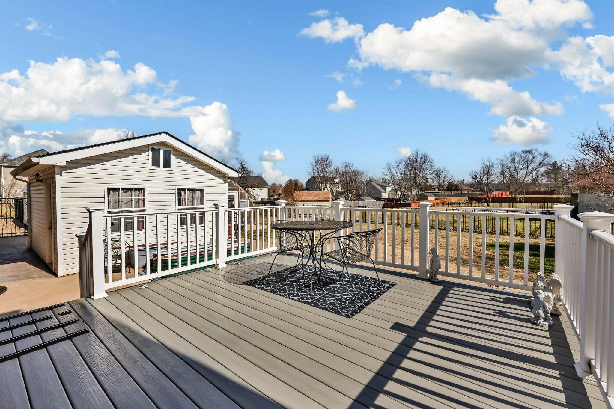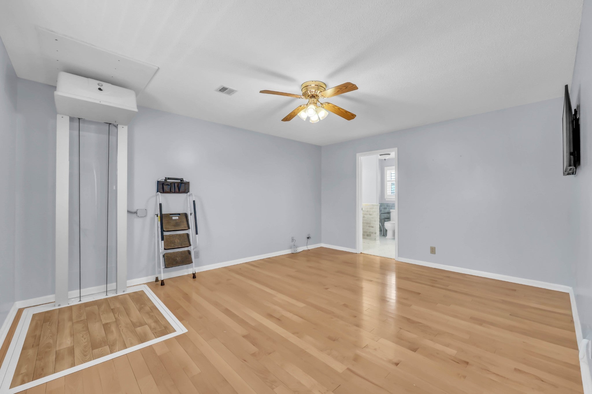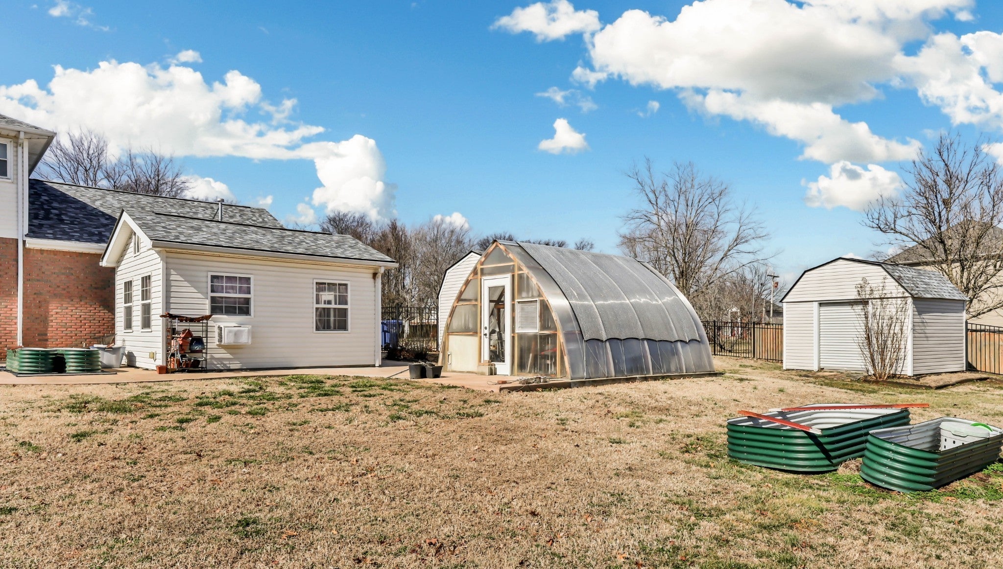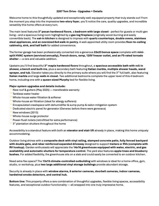 Welcome home to this thoughtfully updated and exceptionally well-equipped property that truly stands out! From the impressive two-story foyer, you’ll immediately notice the care and versatility throughout. The main level features a bedroom with large closet—perfect for guests or multi-gen living—plus a spacious living room with gas-log fireplace (originally wood-burning and easily convertible back). The eat-in kitchen shines with quartz countertops, double ovens, stainless steel appliances, and an oversized 8x4 walk-in pantry. A utility room with floor-to-ceiling cabinetry, sink, and half bath adds everyday convenience. The former garage has been professionally converted into a 22x23 bonus space with mini-split HVAC, French doors, ramp access, dedicated 120V outlet, and an F5-rated tornado shelter. Upstairs features beautiful maple hardwood floors, an accessible primary bath with roll-in shower and built-ins, plus a secondary bath with Italian marble, tub, and multiple shower features. One bedroom includes a queen Murphy bed. Elevator and stair lift provide added accessibility. Major upgrades include new roof and gutters (May 2025, transferable warranty), tankless water heater, whole-house water filtration and air purification, encapsulated crawlspace with dehumidifier and sump pump, new windows (2013), surge protector, and hardwired smoke detectors. Enjoy a composite deck, stamped patio, fully fenced yard with double gate, reinforced driveway with RV hookup, 14x16 greenhouse with utilities, 13x15 climate-controlled outbuilding, and two storage buildings. Security system in place. See attached spec sheet for full features list.
