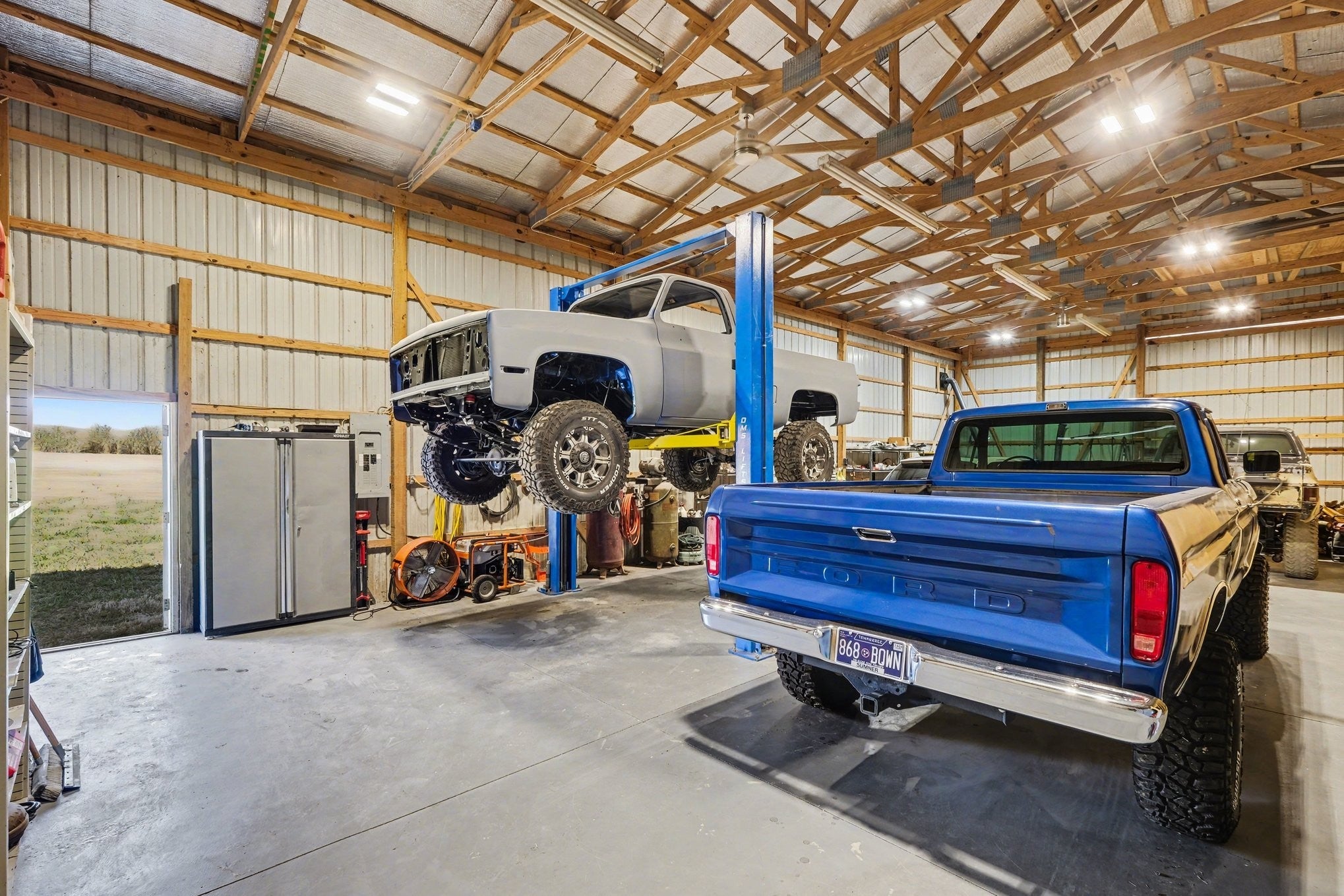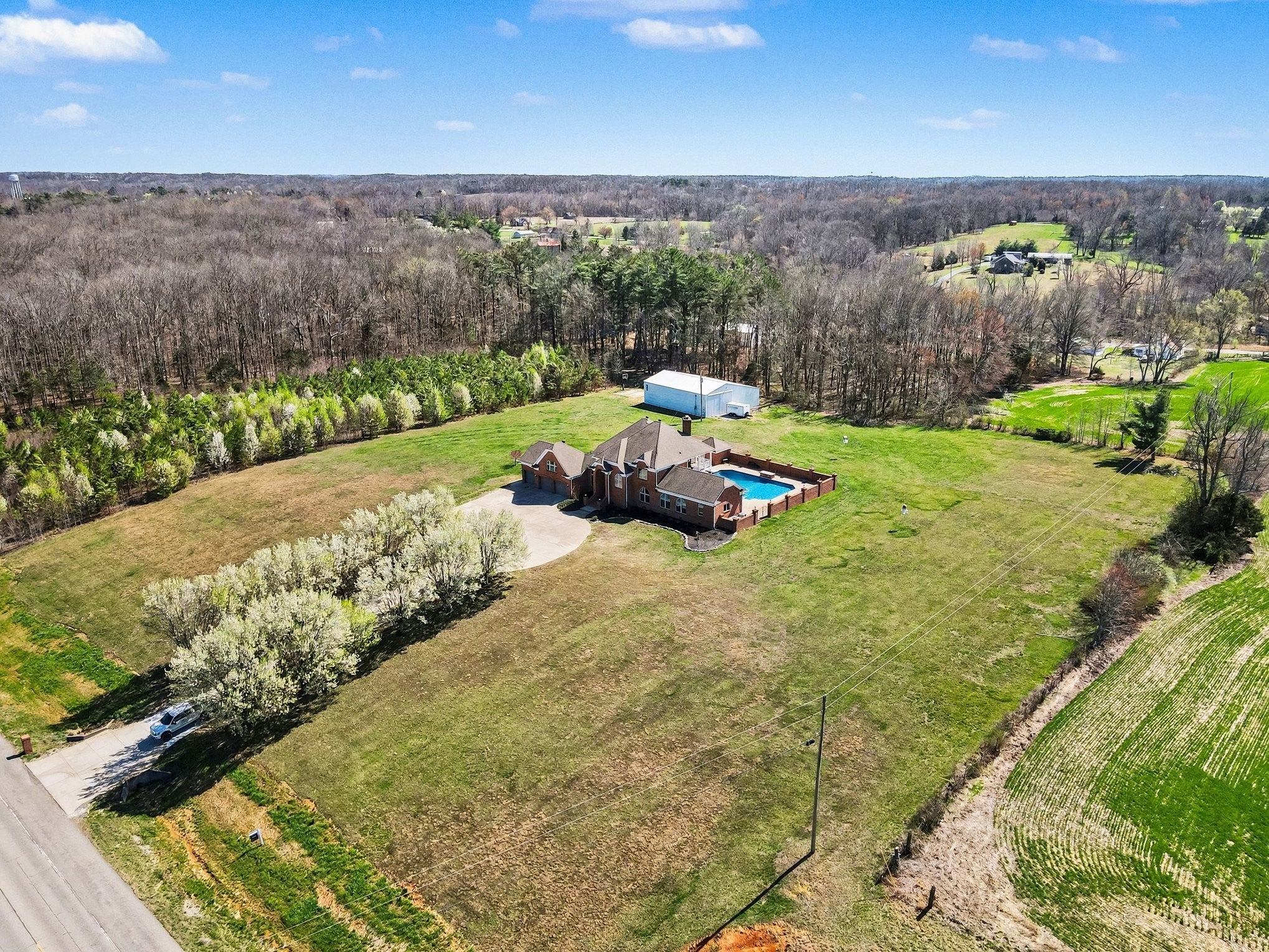Custom-built home offering space, privacy, and endless opportunity to grow! An incredible tree-lined driveway welcomes you home to over 9 acres of flat, usable land and a stunning brick residence. Seller is offering $6,000 carpet allowance + $5,000 paint allowance in credits! The backyard features a 49,000-gallon commercial-size in-ground pool with waterfall feature, expansive patio space, and a pool house complete with a half bath. Inside, the spacious chef’s kitchen showcases custom cabinetry, abundant counter space, and a walk-in pantry. The thoughtfully designed floor plan includes 4 bedrooms, each with its own private ensuite bath, including two true primary suites — one on the main level and one upstairs. Two massive bonus rooms on opposite sides of the home provide flexibility for recreation, home office space, gym, or media rooms. Gorgeous crown molding, baseboards, hardwood flooring, and a spacious 3-car garage add both elegance and function. 60x40 outbuilding/shop with electricity (plus 12x60 lean-to) — complete with a 9,000 lb automotive lift and dedicated man cave space with a wood-burning stove. Additional features include a storm shelter. Enjoy privacy while still being conveniently located near major highways for easy access to surrounding areas.