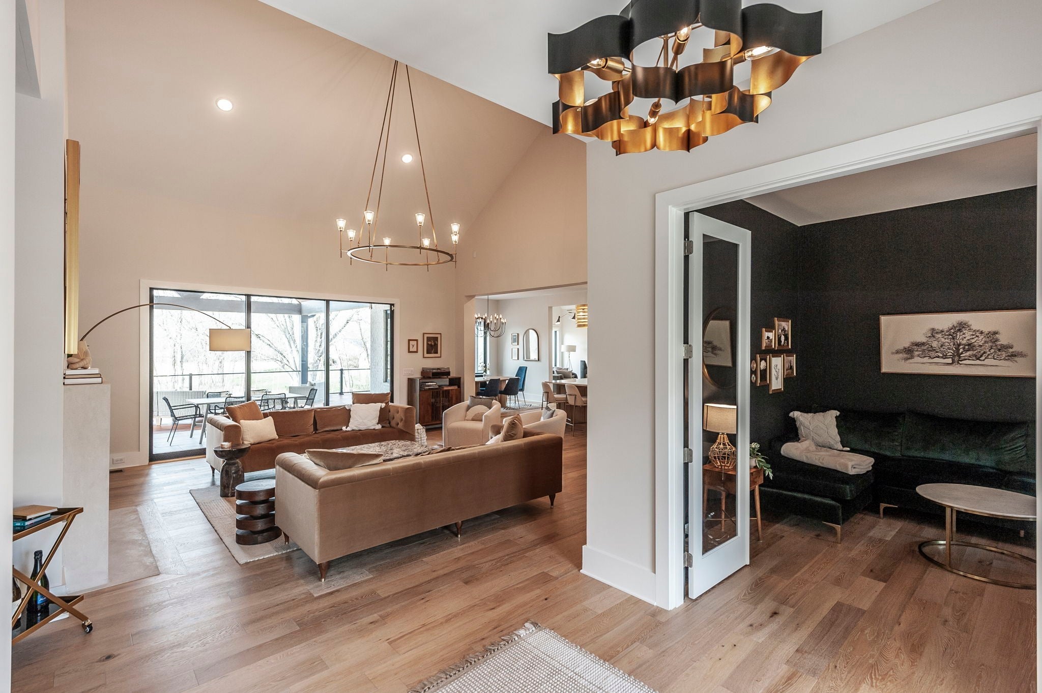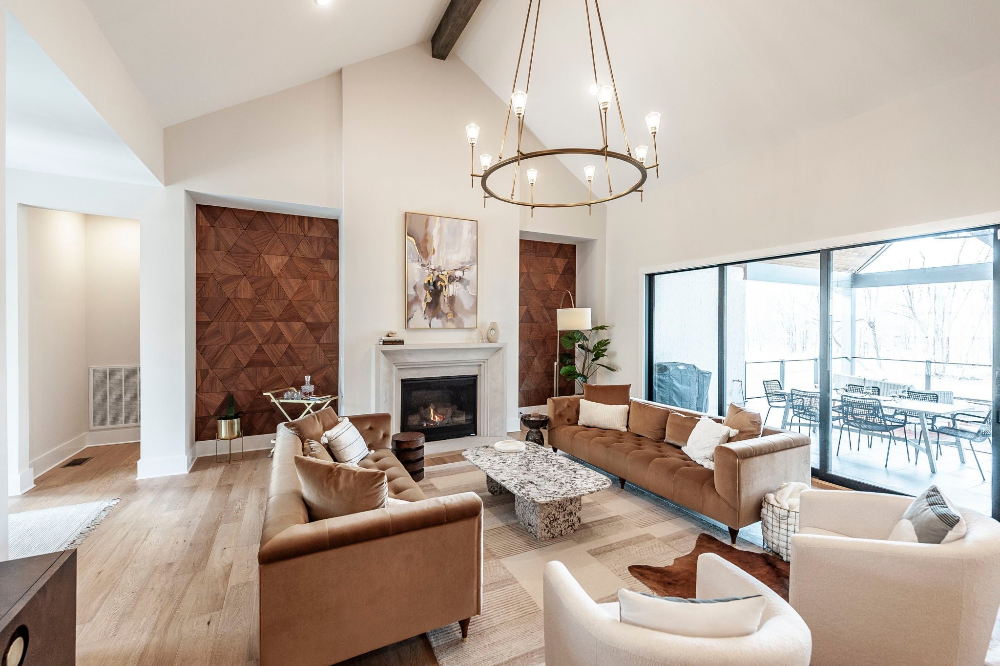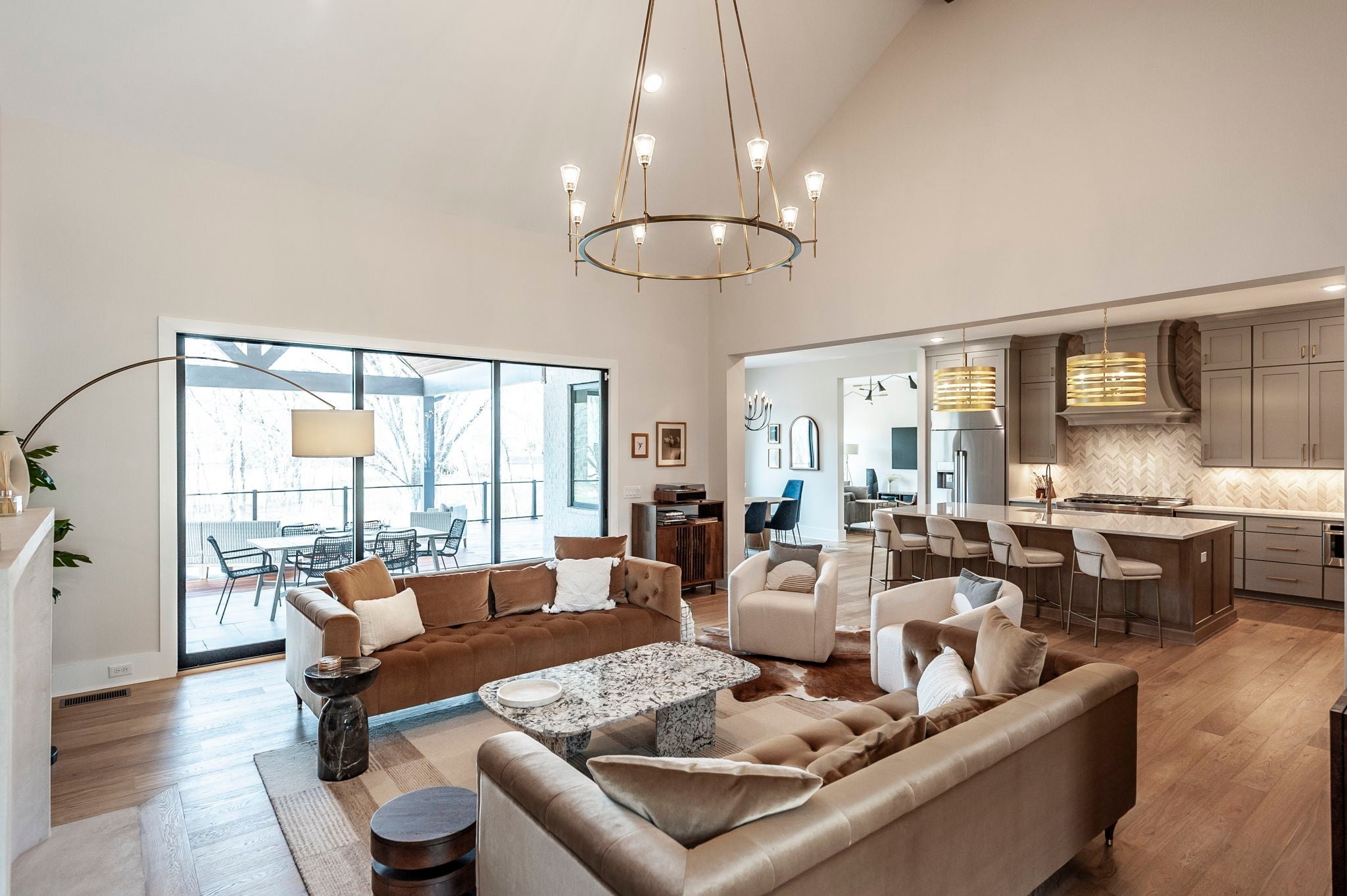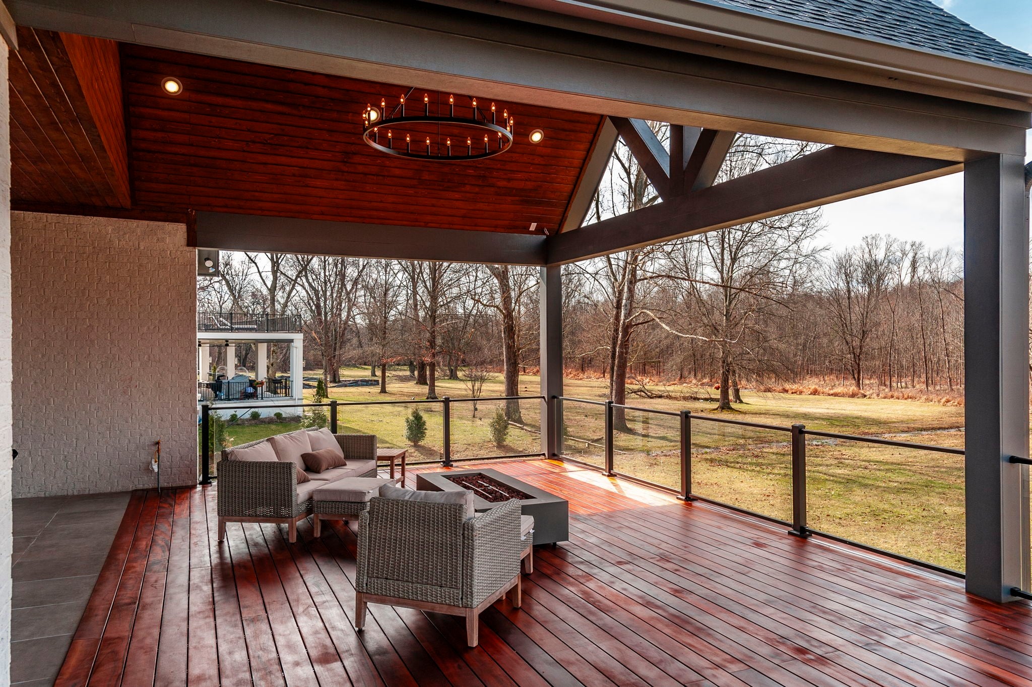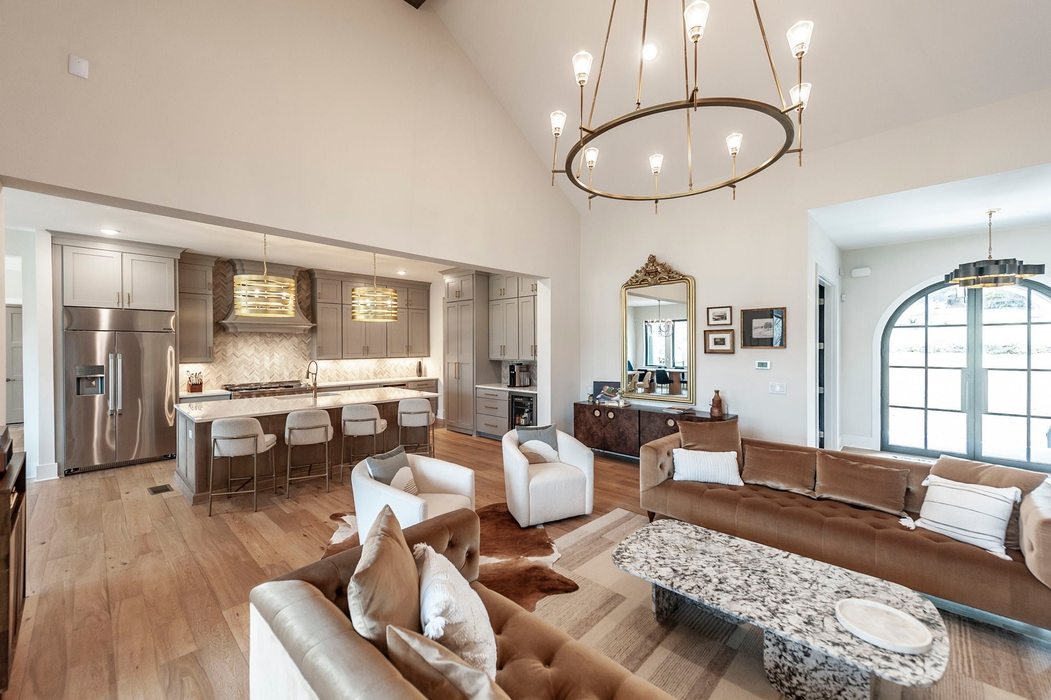 Experience the best of Brentwood luxury in this 2023 modern estate by Partners in Building. Nestled on over an acre that backs to the Crockett Park Greenway, this home offers a peaceful sanctuary immersed in nature with no HOA. Designed for elevated indoor–outdoor living, the home unfolds around an entertainer’s floor plan where kitchen, living, dining, and outdoor spaces flow seamlessly together. The chef’s kitchen anchors the home with a professional range, built-in refrigerator, and a hidden pantry—equally suited for intimate evenings or hosting at scale. Vaulted, beamed ceilings and curated designer lighting add warmth and architectural presence, while three fireplaces—located in the living room, primary suite, and deck—create layers of ambiance throughout. The main-floor primary suite is a private sanctuary, defined by soaring ceilings, a statement chandelier, and a spa-inspired bath with soaking tub and oversized shower. A main-level guest suite offers ideal accommodations for guests, family or multigenerational living. A richly appointed home office provides a quiet, sophisticated space for creativity and work. Each additional bedroom includes a private en-suite bath, and the flexible upstairs space easily adapts as a fifth bedroom, media room, or secondary office. Three-car garage supporting daily life and recreation. This home delivers a rare blend of privacy, natural connection, and refined living with unmatched convenience to I-65 and everything Brentwood has to offer.