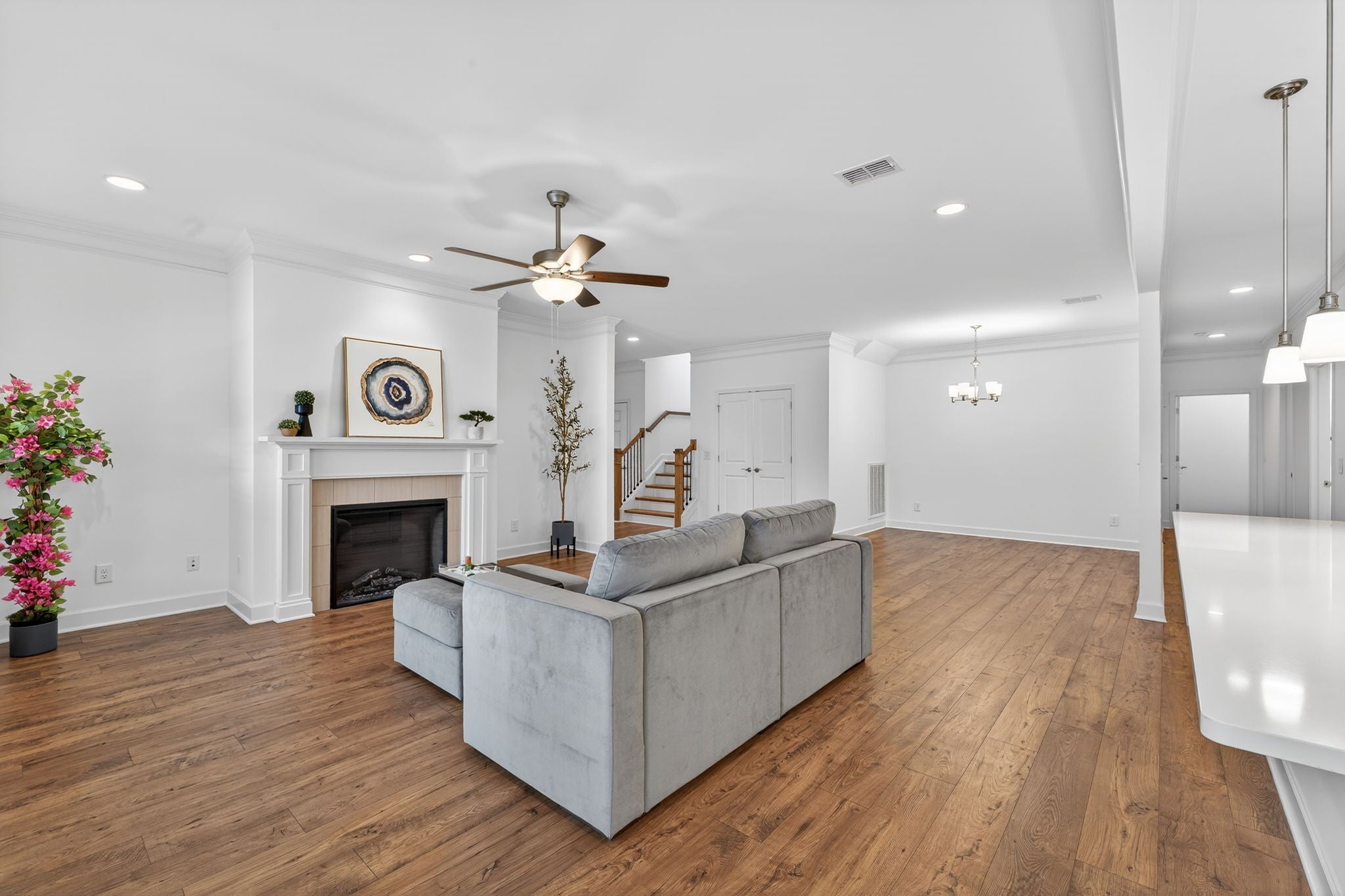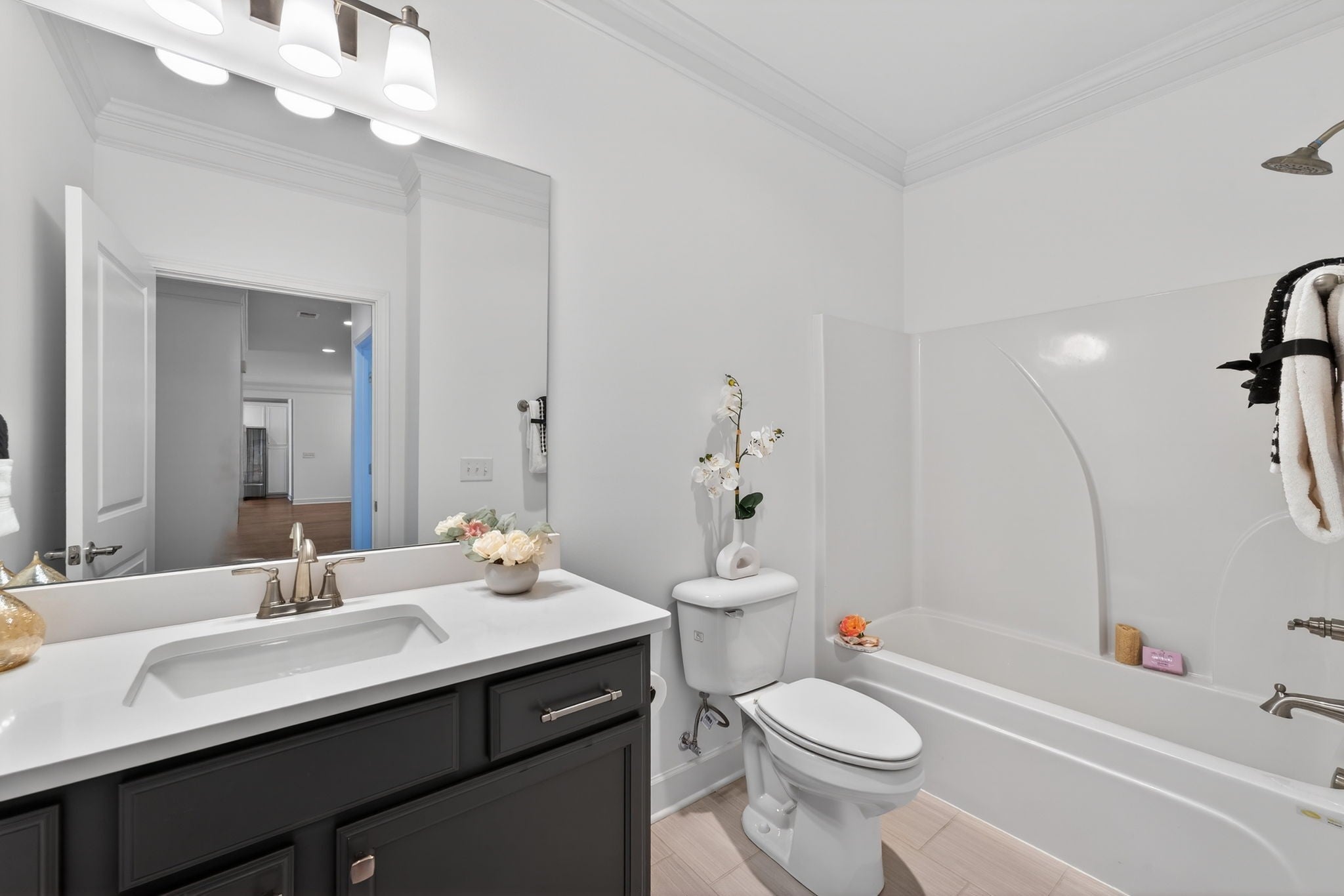 Welcome to Stonebridge at Three Rivers — one of Murfreesboro’s most desirable communities! The Magnolia plan offers nearly 3,000 sq ft of stylish, low-maintenance living with a functional, well-designed layout. Step into a welcoming foyer that opens to a formal dining room, perfect for hosting gatherings. Just beyond, the open-concept kitchen, breakfast nook, and spacious living room create the heart of the home. The kitchen features an 11-ft island with white Zen Quartz countertops, Alpine White soft-close cabinetry with pull-out drawers, under-cabinet lighting, and stainless steel appliances. The large living room showcases an electric fireplace and French doors leading to an oversized covered back porch overlooking a private, tree-lined backyard — ideal for relaxing or entertaining. The main-level primary suite is privately positioned and offers a tiled shower, double vanity, garden tub, linen closet, water closet, and a spacious walk-in closet. Two additional bedrooms a full bath and a powder room are also located on the main floor. A generous laundry room with freestanding sink, extra storage closets, and walk-in attic storage add everyday convenience. Upstairs, a massive bonus room with its own full bath and two closets provides flexible space for a theater room, hobby area, guest suite, or second primary suite. With over $20,000 in upgrades—including LVP flooring, crown molding, 5¼" baseboards, White Zen quartz throughout, recessed lighting, and epoxy garage flooring—this home stands out. HOA amenities include a clubhouse, fitness center, pool, pond with fountain, walking trails, water, sewer, trash pickup, landscaping, sprinkler maintenance, plus exterior and roof insurance. Luxury finishes, privacy, and easy living—all in one exceptional home.