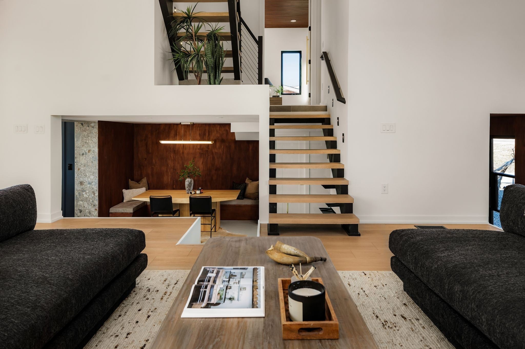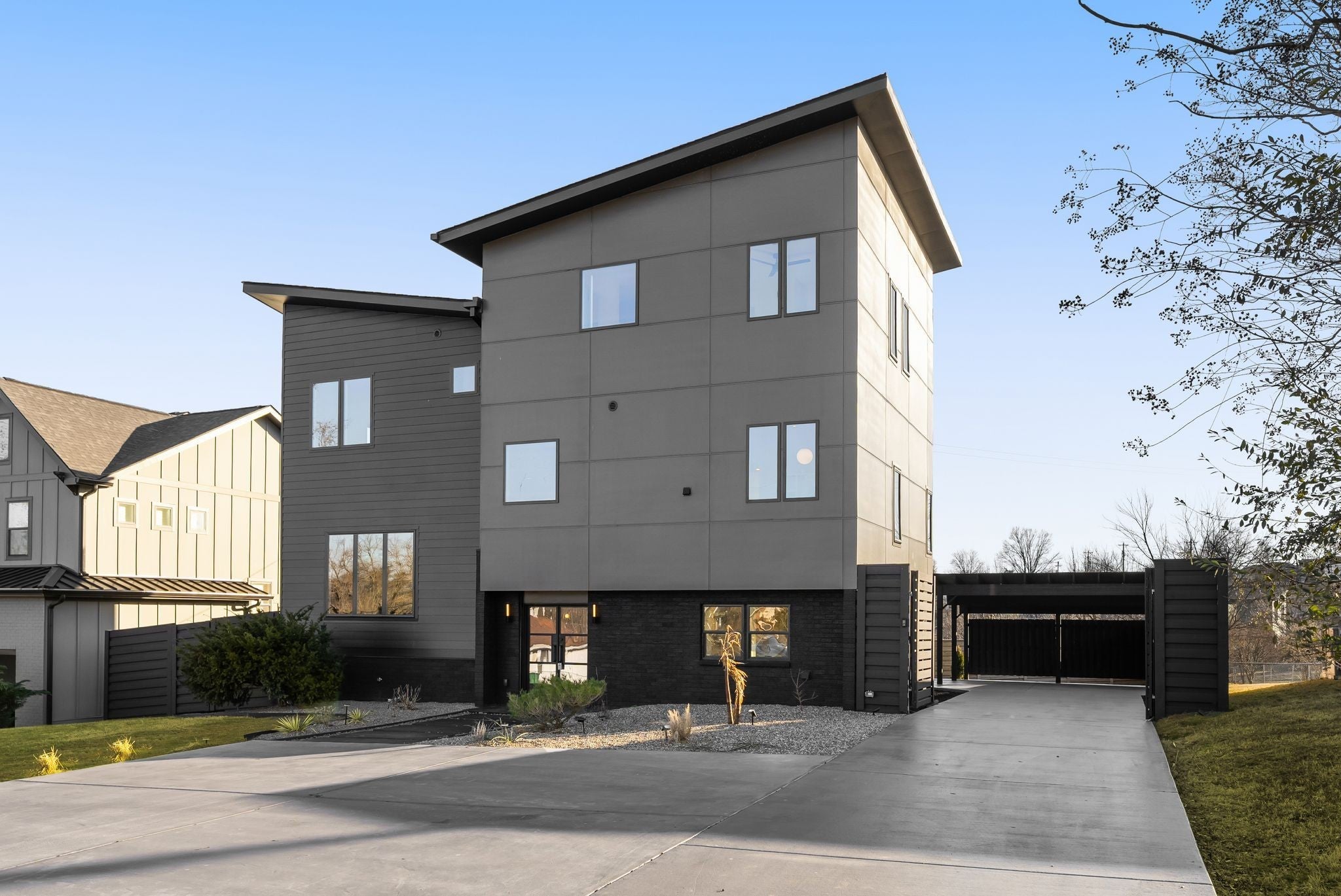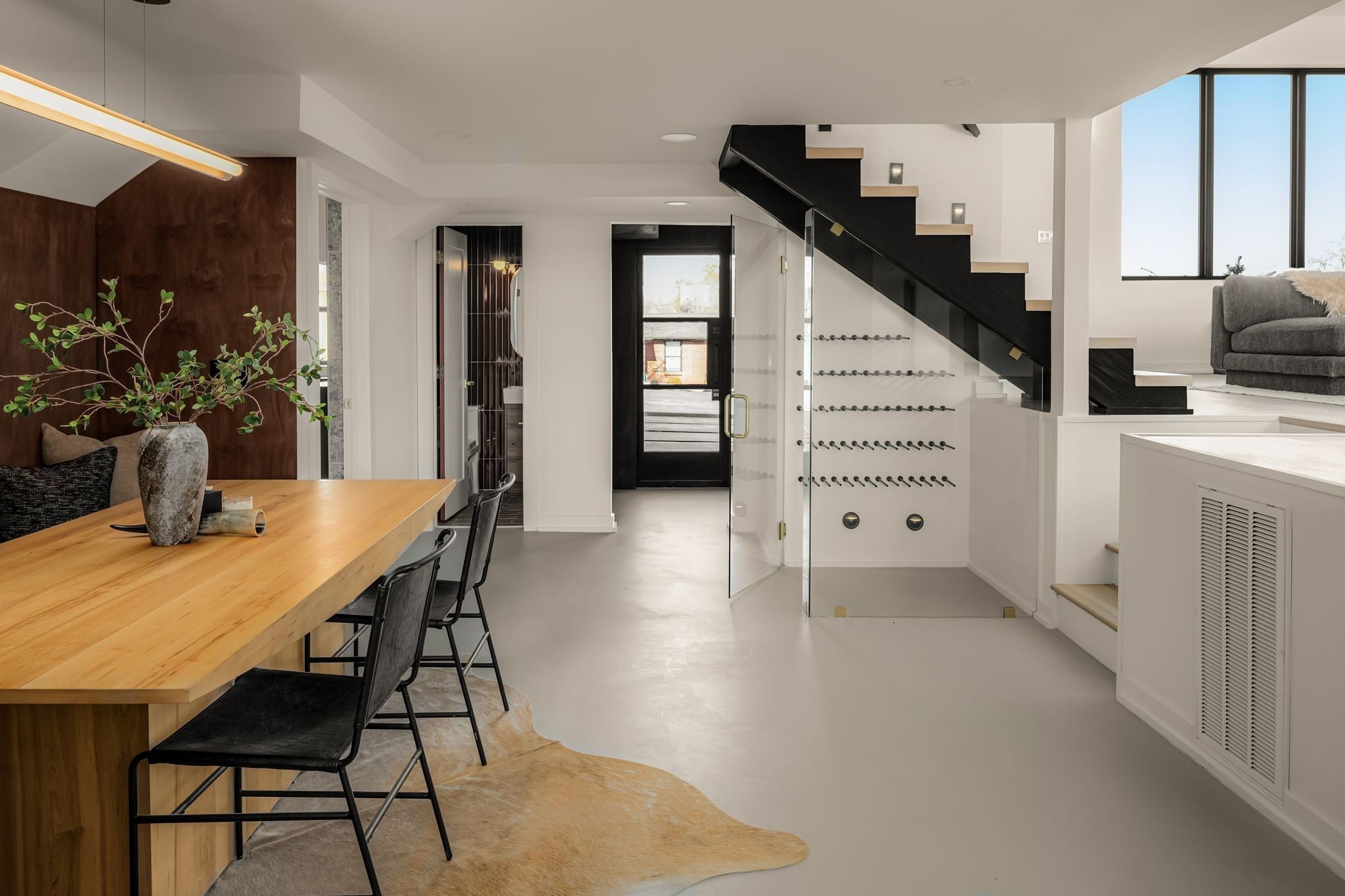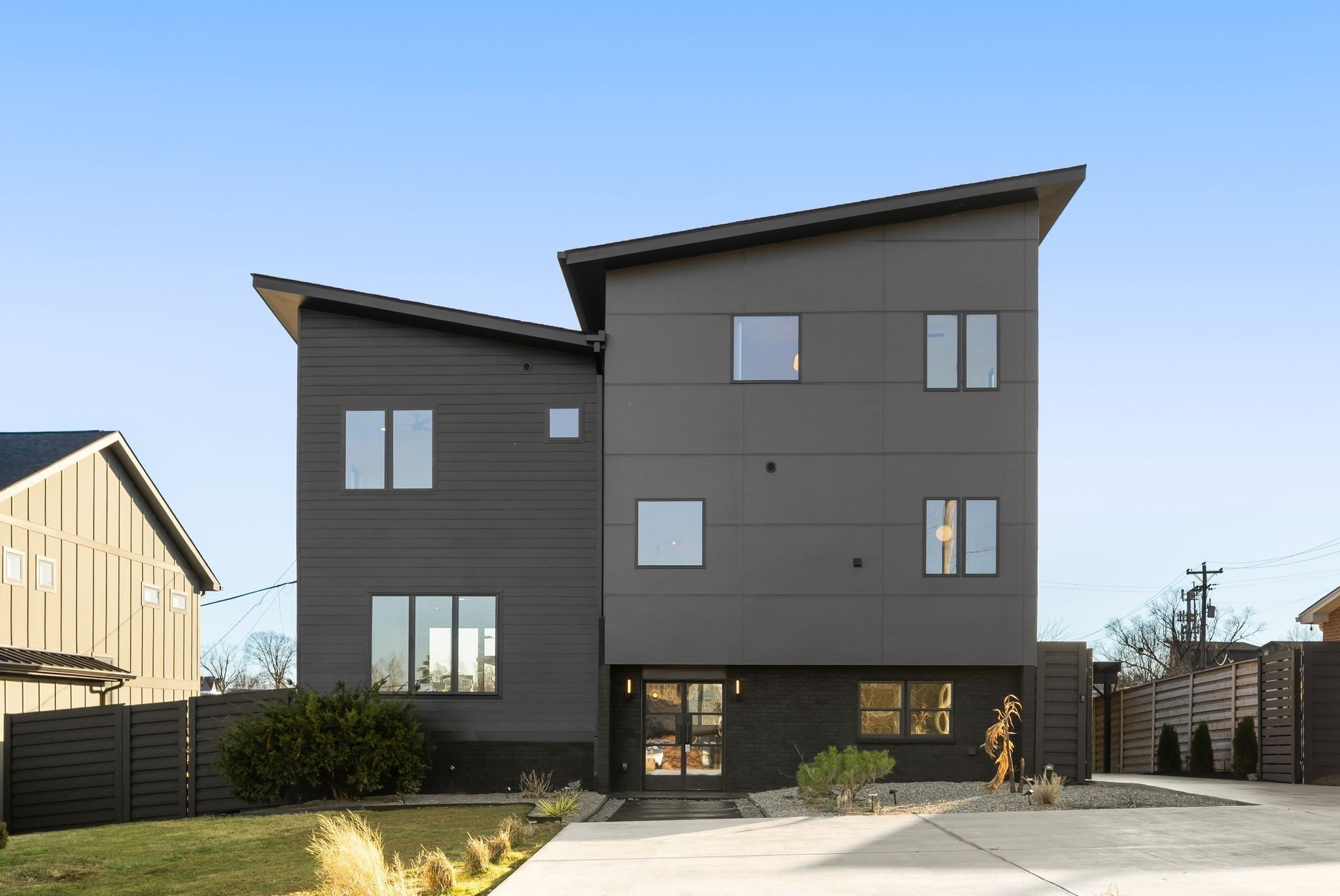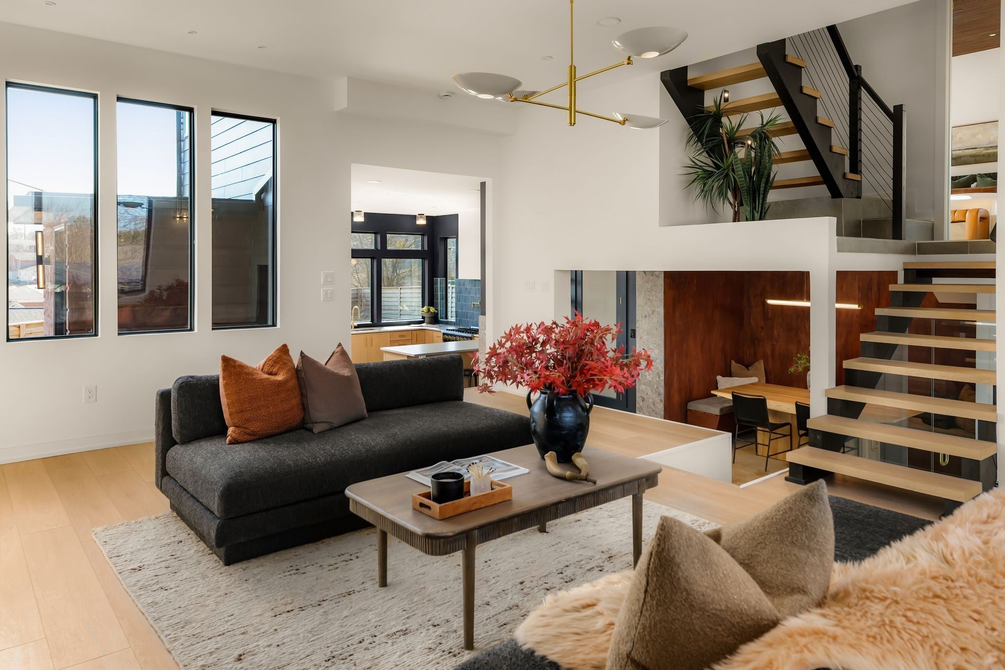 Welcome to House Nexus by Archie & Boyd. A warm, light-filled modern home designed for everyday living and elevated entertaining, House Nexus blends sculptural architecture with comfort, privacy, and timeless materials in one of East Nashville’s most desirable settings. A private electric gate creates a quiet sense of arrival, setting the tone for the thoughtfully curated spaces beyond. Inside, natural light pours through oversized windows into a striking living room anchored by a sleek gas fireplace. Sculptural floating stairs rise through the space, creating a dramatic yet welcoming architectural moment—ideal for slow mornings, intimate evenings, and effortless hosting. At the heart of the home, the architectural kitchen balances clean geometry with true functionality. Luxury FORNO appliances, a full gas range, custom cabinetry, refined surfaces, and terrazzo flooring selected for durability and texture create a chef-caliber environment that feels both elevated and livable. Just beyond, a sculptural dining space unfolds with custom wood detailing, built-in seating, and an intimate wine cellar—an inviting setting designed for gathering and conversation. The primary suite follows as a private retreat, featuring a naturalistic spa-inspired bath with sculptural fixtures, custom tilework, earthy finishes, a soaking tub, dual closets, and a discreet all-in-one washer and dryer within the dressing wing. One flight above, a secondary living room offers a flexible, light-filled retreat with a wet bar and direct access to a private balcony overlooking East Nashville. An adjacent guest suite and discreet office complete the level, creating an inspiring indoor–outdoor environment suited for visitors, work, or quiet moments of pause. Steps from Shelby Park, Shelby Golf Course, and top restaurants, House Nexus offers architectural distinction without sacrificing warmth, livability, or ease.