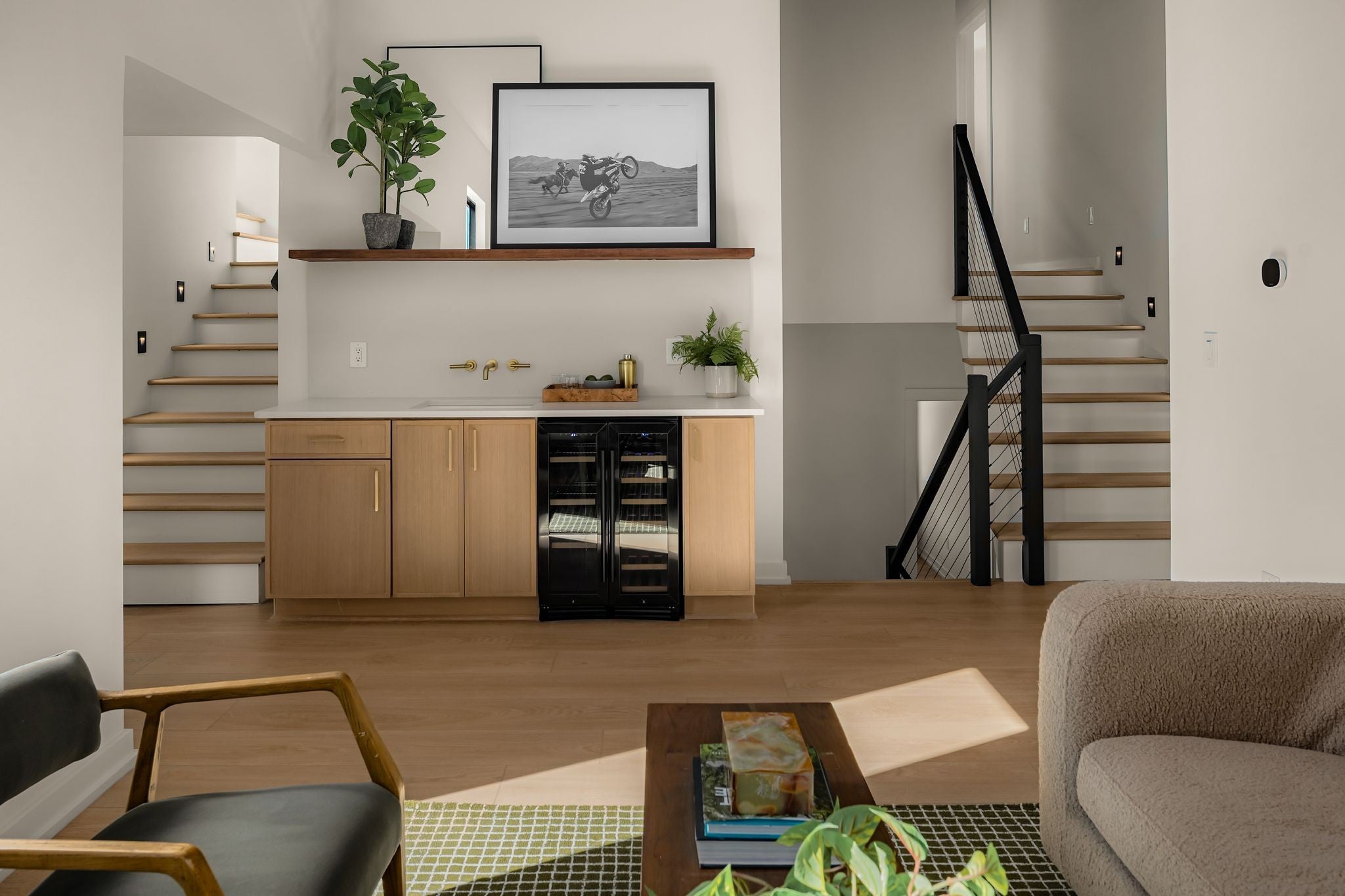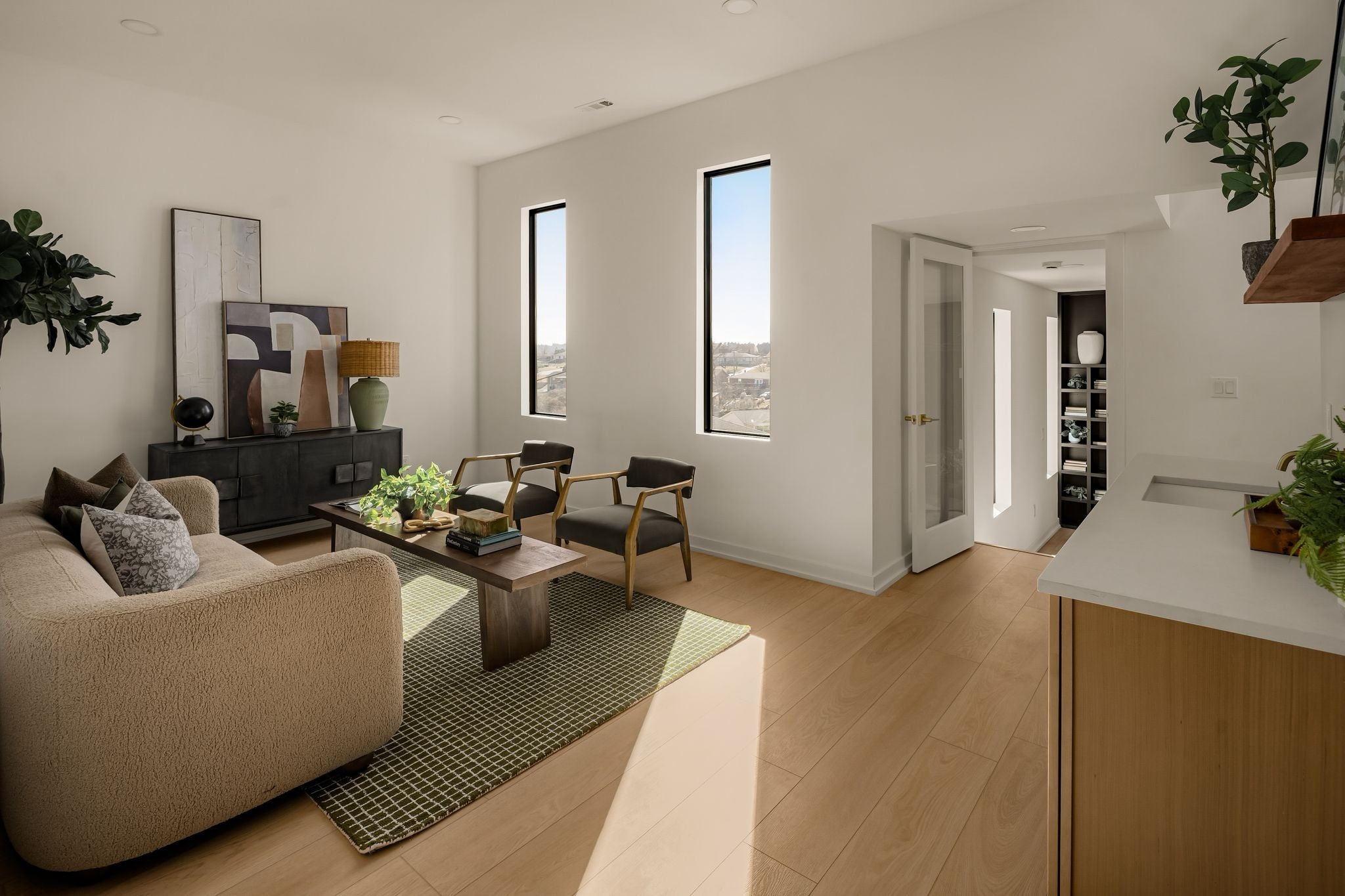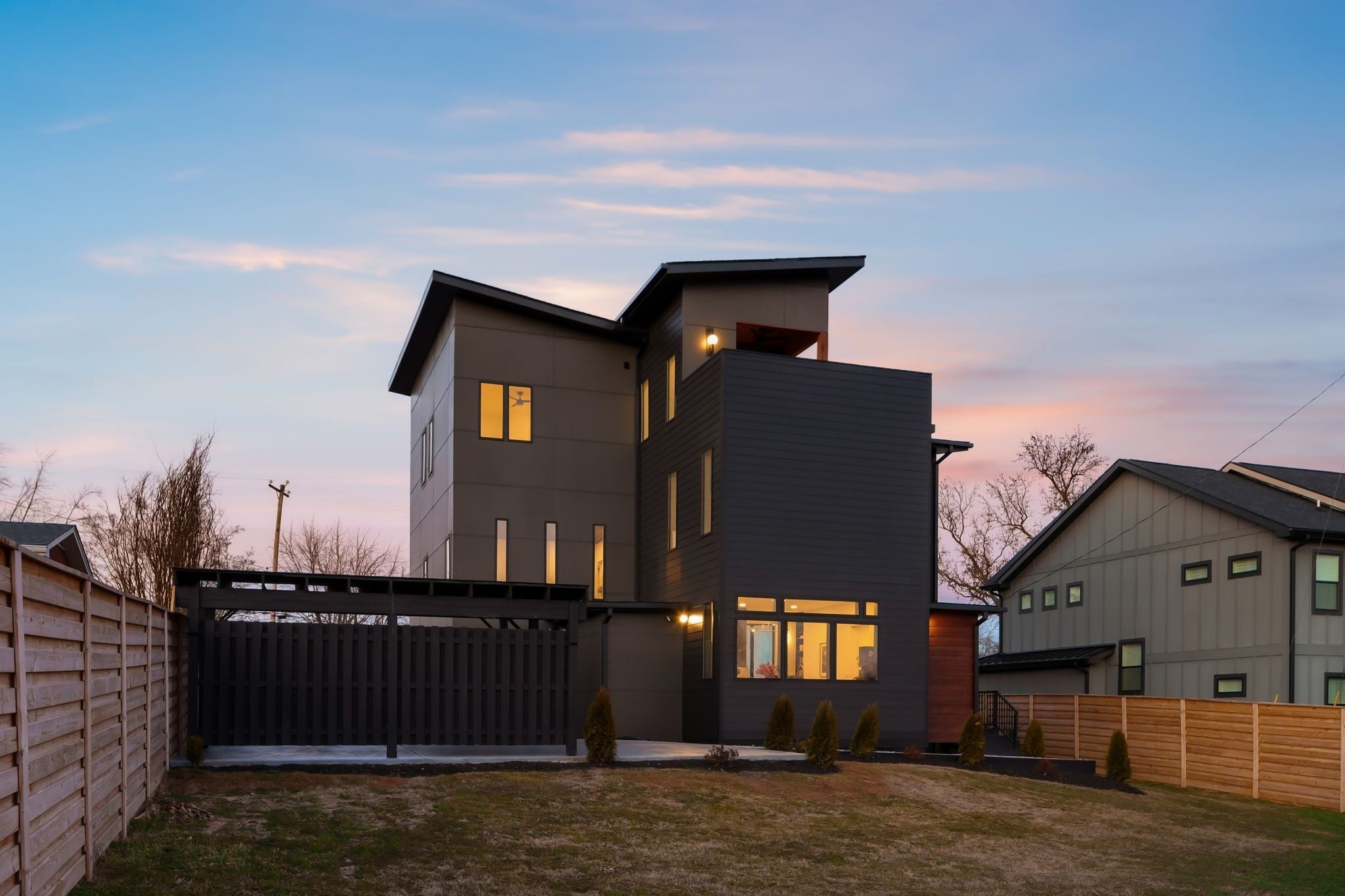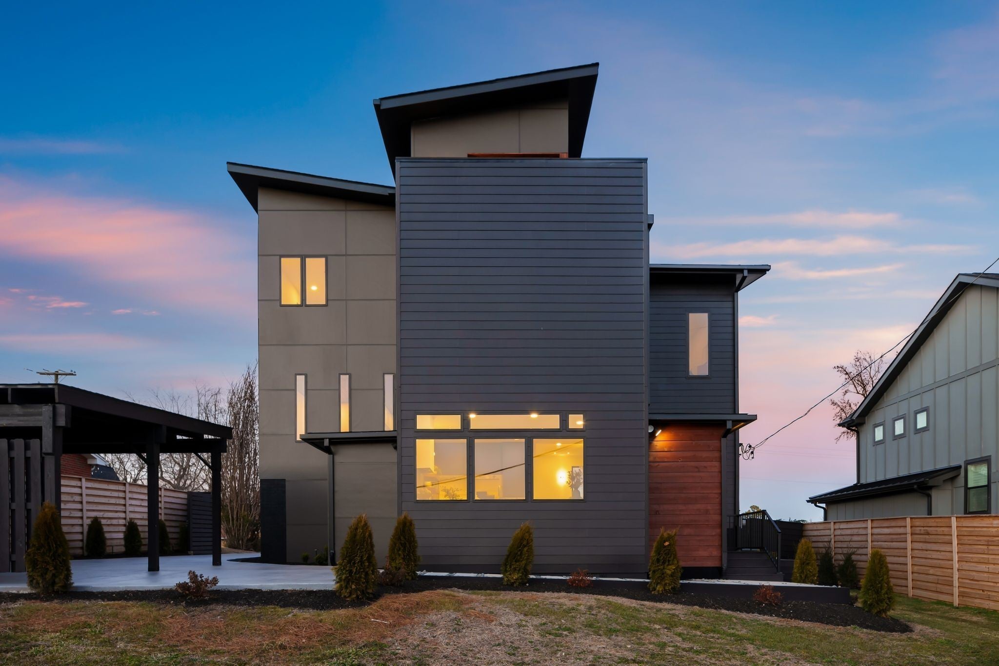 Welcome to House Nexus by Archie & Boyd. A warm, light-filled modern home designed for everyday living and elevated entertaining, House Nexus blends sculptural architecture with comfort, privacy, and timeless materials in one of East Nashville’s most desirable settings. A private electric gate creates a quiet sense of arrival, setting the tone for the thoughtfully curated spaces beyond. Inside, natural light pours through oversized windows into a striking living room anchored by a sleek gas fireplace. Sculptural floating stairs rise through the space, creating a dramatic yet welcoming architectural moment—ideal for slow mornings, intimate evenings, and effortless hosting. At the heart of the home, the architectural kitchen balances clean geometry with true functionality. Luxury FORNO appliances, a full gas range, custom cabinetry, refined surfaces, and terrazzo flooring selected for durability and texture create a chef-caliber environment that feels both elevated and livable. Just beyond, a sculptural dining space unfolds with custom wood detailing, built-in seating, and an intimate wine cellar—an inviting setting designed for gathering and conversation. The primary suite follows as a private retreat, featuring a naturalistic spa-inspired bath with sculptural fixtures, custom tilework, earthy finishes, a soaking tub, dual closets, and a discreet all-in-one washer and dryer within the dressing wing. One flight above, a secondary living room offers a flexible, light-filled retreat with a wet bar and direct access to a private balcony overlooking East Nashville. An adjacent guest suite and discreet office complete the level, creating an inspiring indoor–outdoor environment suited for visitors, work, or quiet moments of pause. Steps from Shelby Park, Shelby Golf Course, and top restaurants, House Nexus offers architectural distinction without sacrificing warmth, livability, or ease.