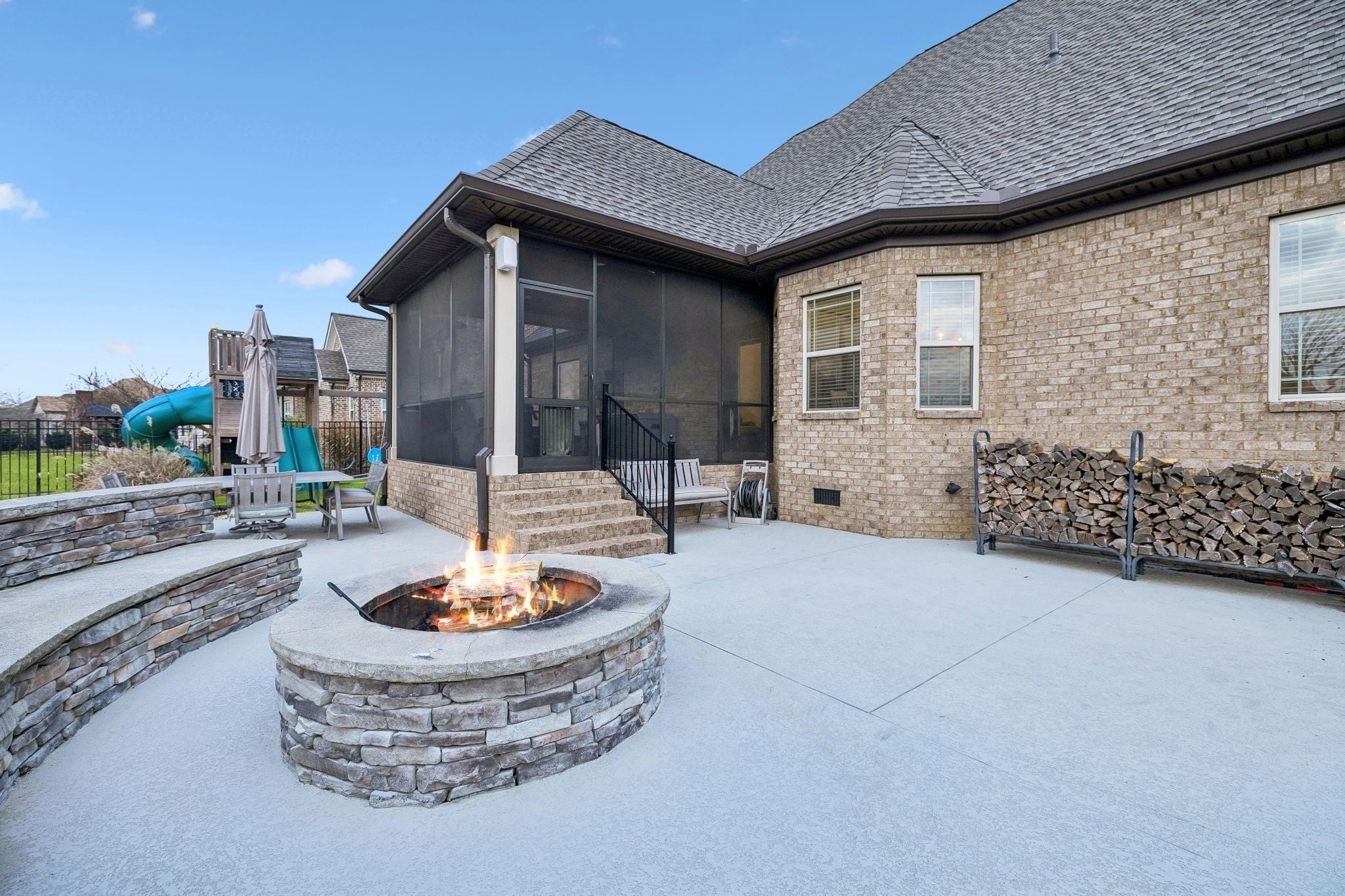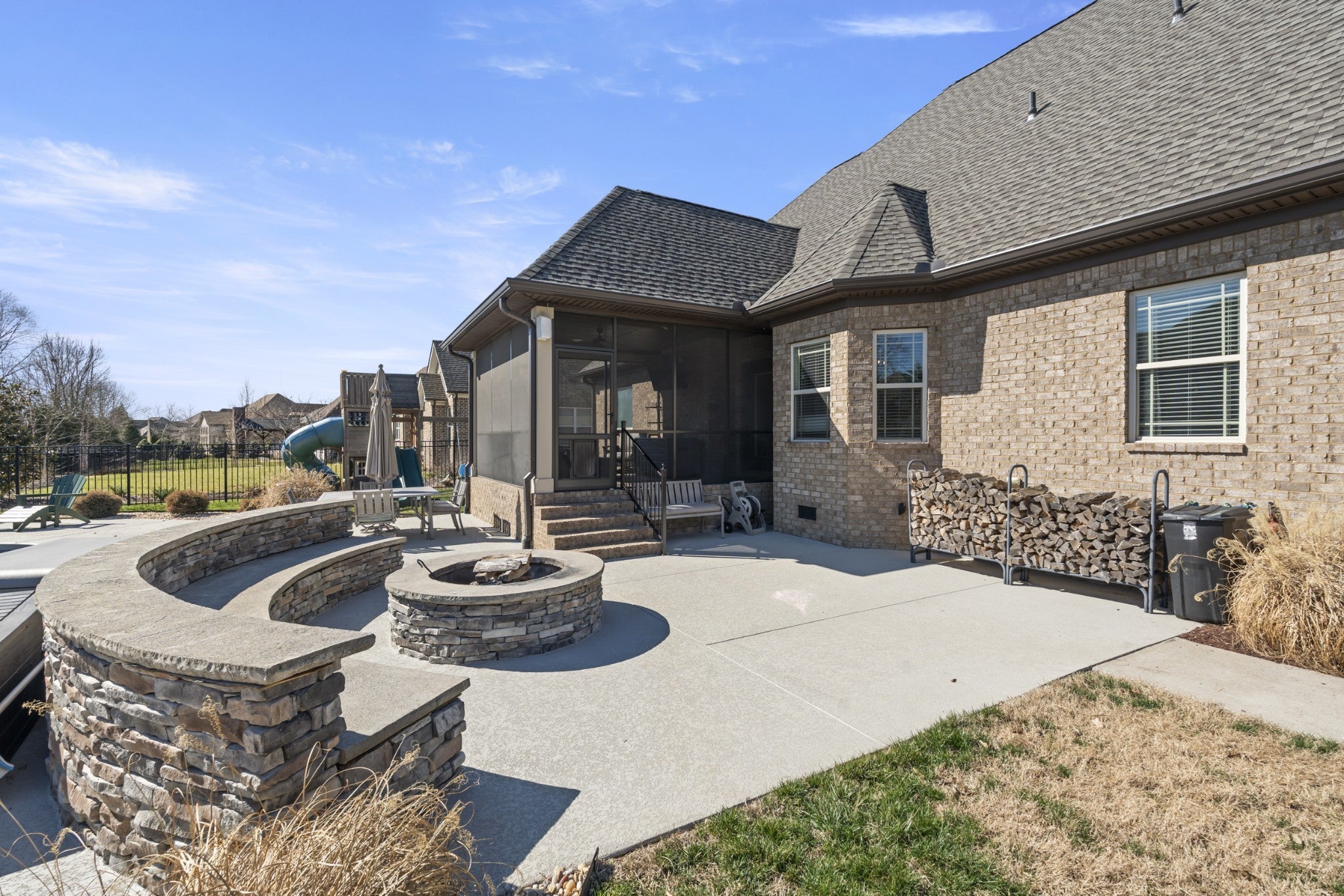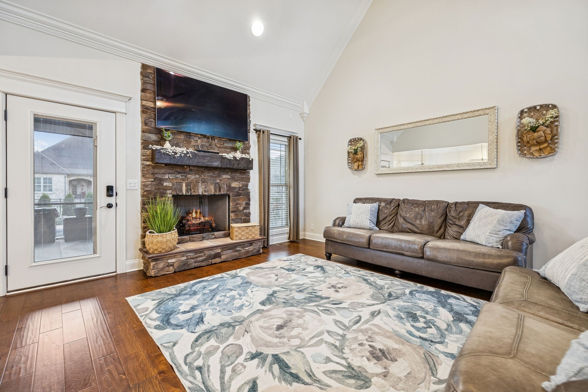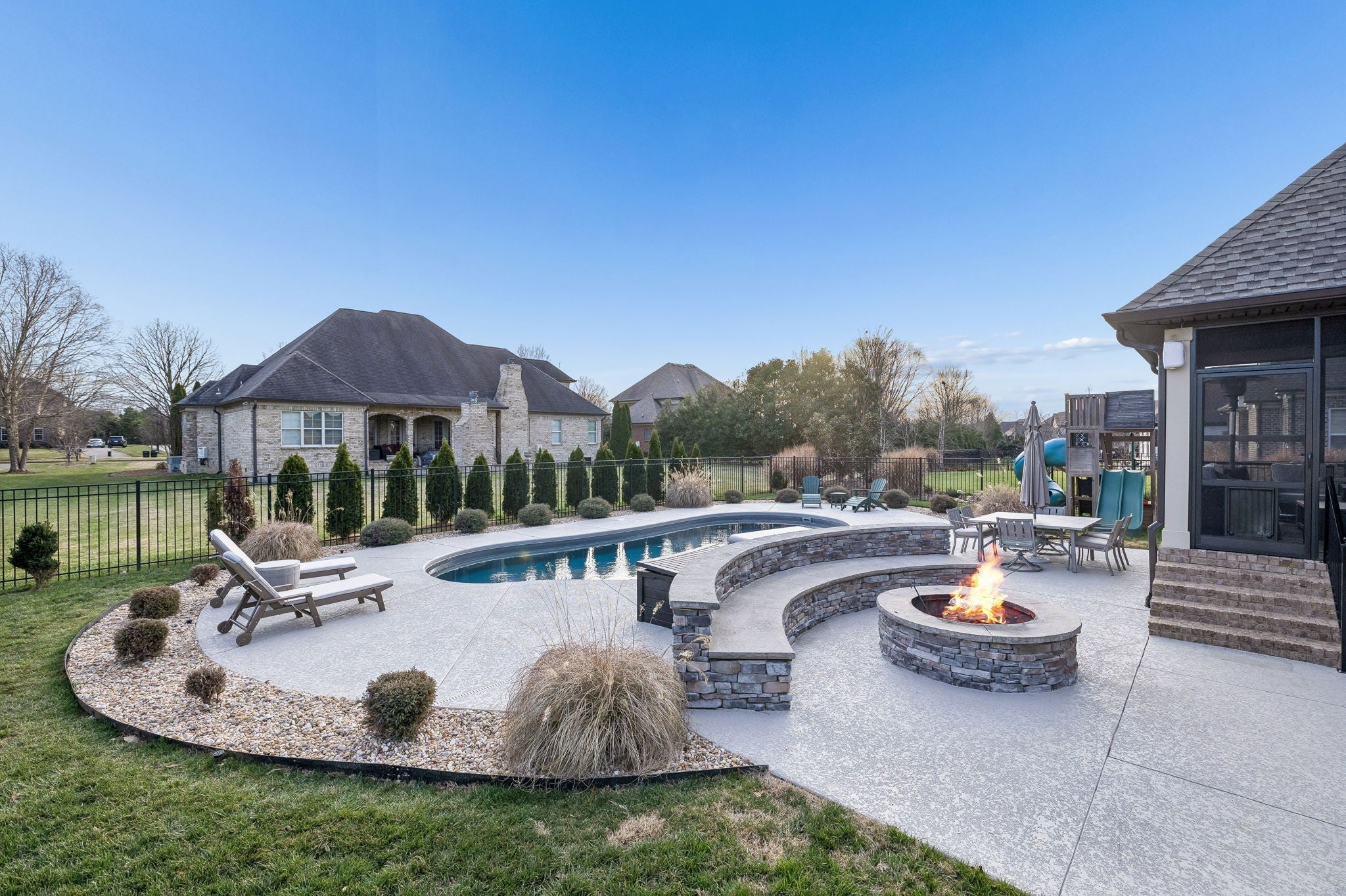 This beautifully updated home offers four bedrooms and three full bathrooms, thoughtfully designed for both elegant entertaining and everyday family living. The main floor features a spacious primary suite, an additional bedroom, and a second full bathroom, creating an ideal layout for guests, a home office, or multigenerational living. Upstairs, two bedrooms share a Jack and Jill bathroom and are complemented by a large recreation room and a versatile landing area that provides flexible living space. A formal dining room sets the stage for special gatherings, while the kitchen serves as the heart of the home with refreshed finishes, updated lighting, and updated appliances that flow seamlessly into the main living areas. Throughout the home, updated flooring, new lighting, surround sound wiring, and smart home features add comfort and convenience. The primary suite is anchored by a completely remodeled, spa-inspired bathroom that was taken down to the studs and redesigned with luxury in mind. High-end finishes, custom cabinetry, quartz countertops, and a stunning glass-enclosed shower create a retreat that feels both timeless and indulgent, offering a level of quality rarely found at this price point. Set on a large lot, the outdoor living spaces create a true private retreat. Enjoy a screened-in porch with TV mount, expansive patio areas, a built-in fire pit with stone seating, and a resort-style saltwater pool with smart controls, LED lighting, and generous space for entertaining. A wired hot tub area, new Sundek coating, upgraded irrigation, and professionally maintained landscaping complete this exceptional property, blending refined luxury with warm, family-friendly comfort. This luxury home in a gated community showcases exceptional curb appeal with a brand-new roof and professionally designed landscaping that creates a stunning first impression. Thoughtfully maintained and beautifully presented, every detail adds comfort, value, and timeless style.