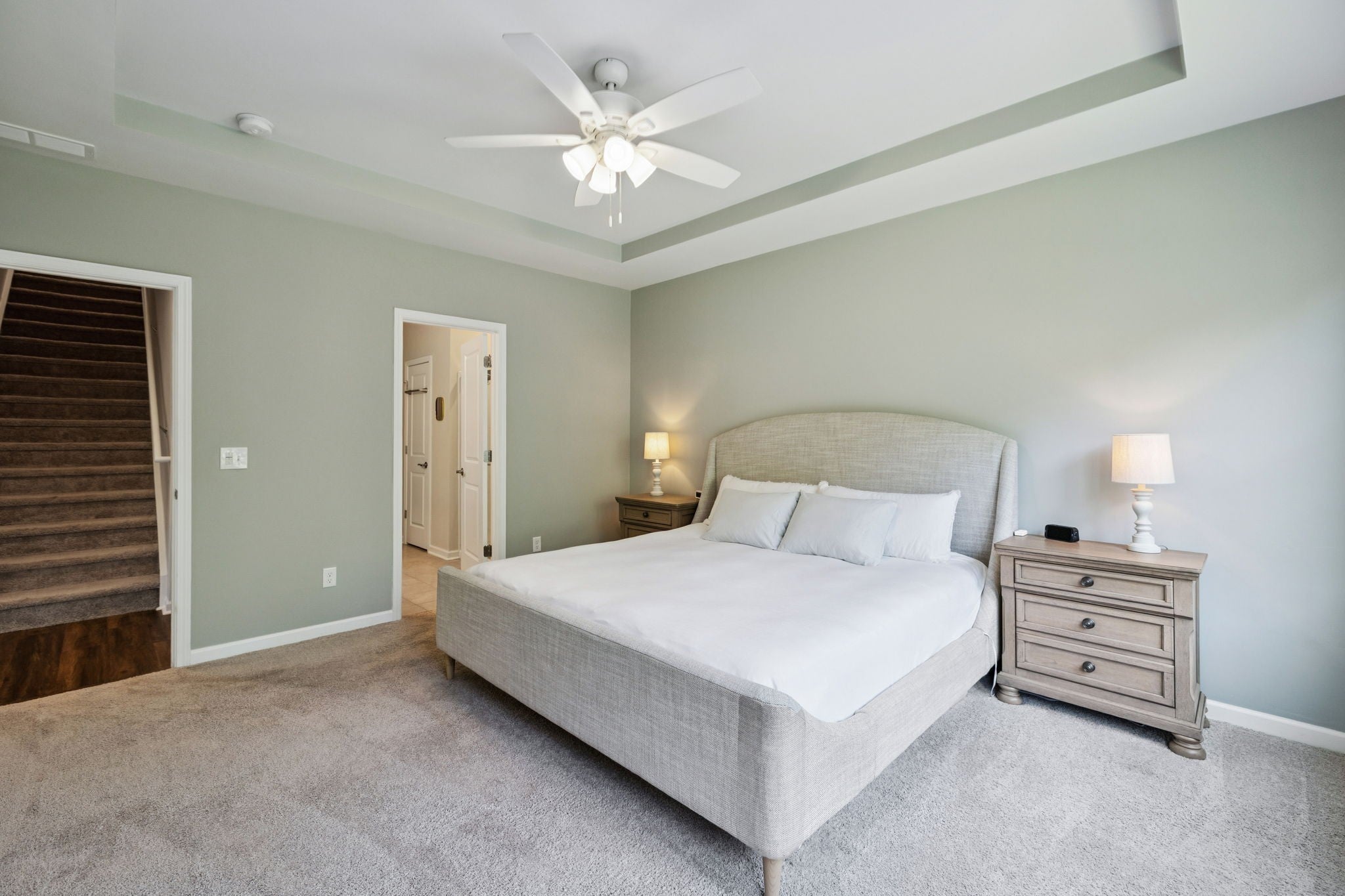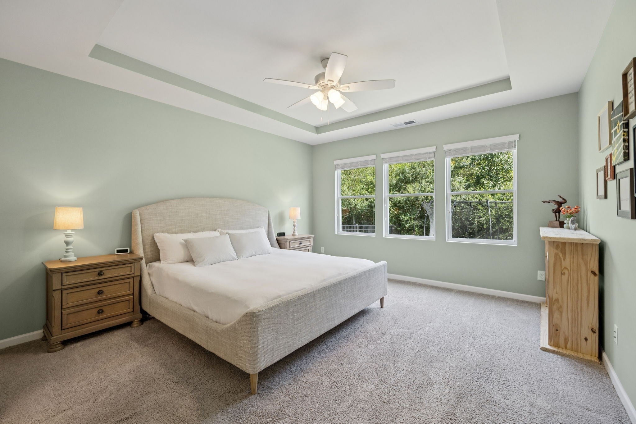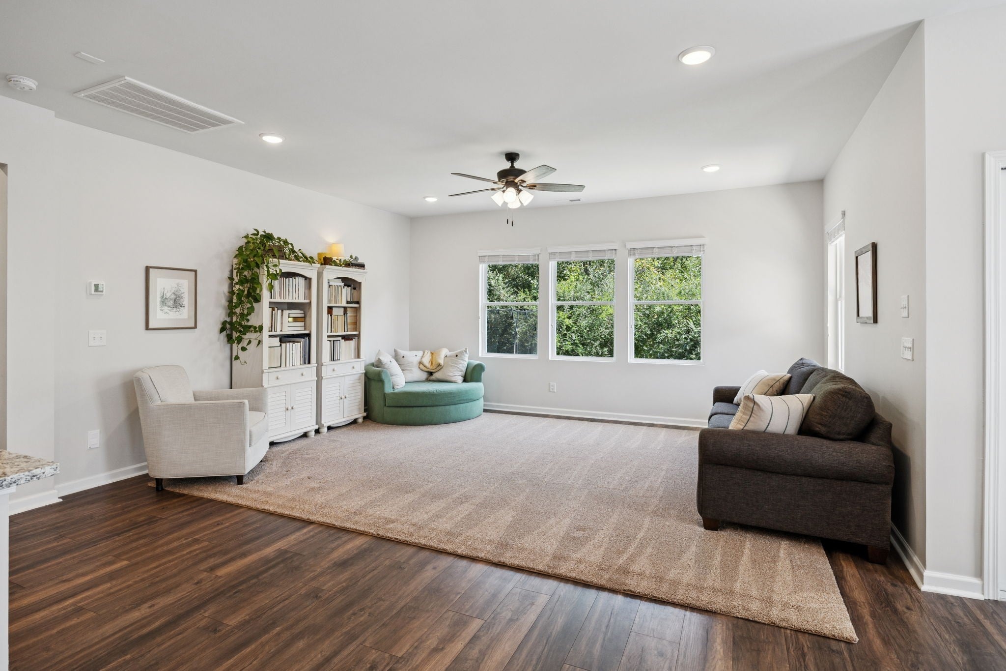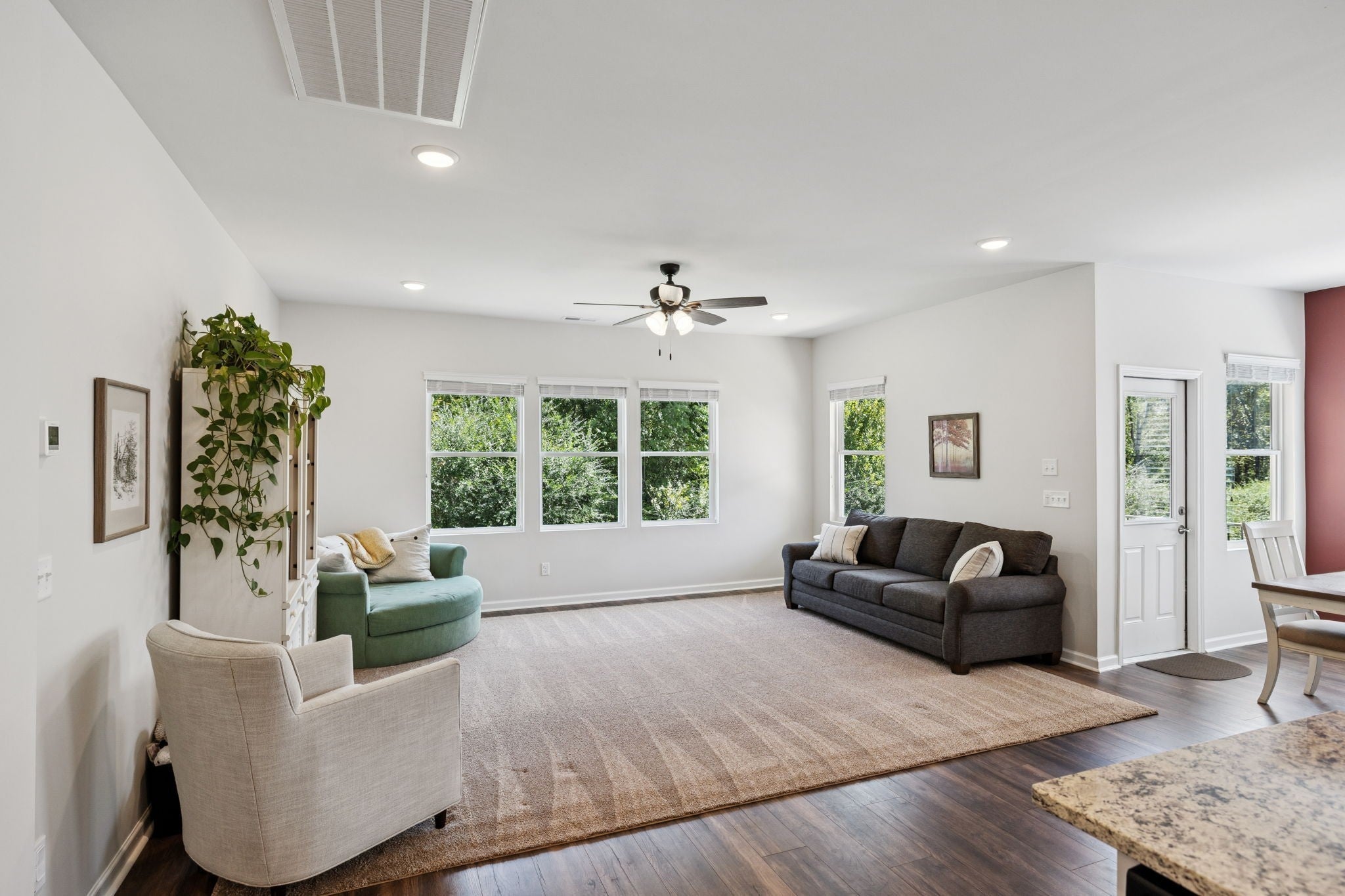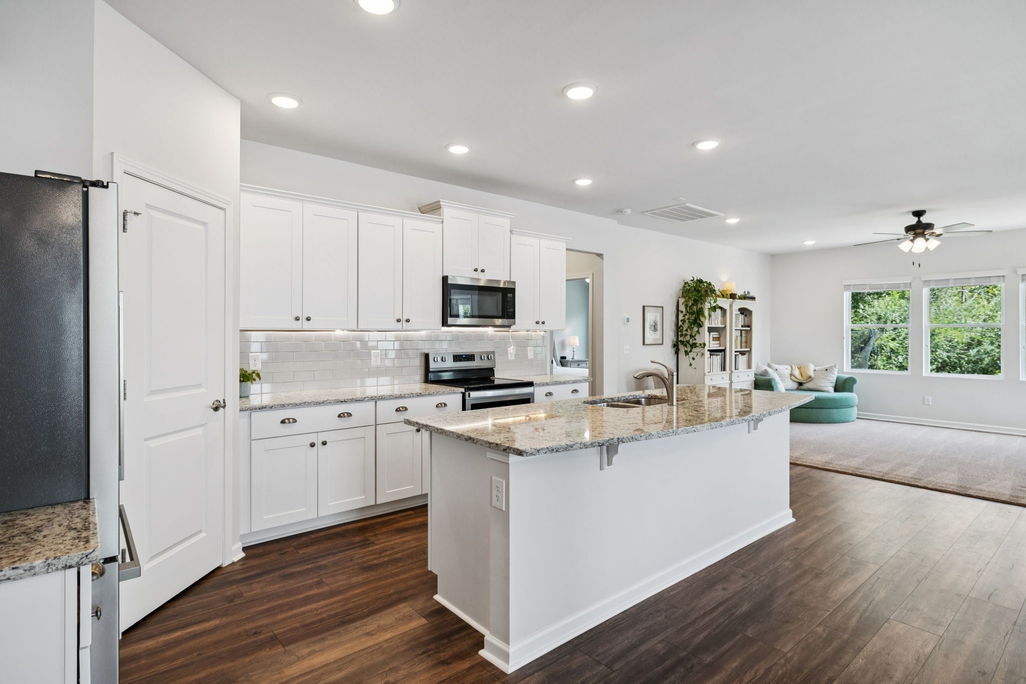 Move-in ready- Open layout with 3 BRs on the Main level! This like-new home sits on a spacious, Fenced lot and backs to mature TREES! Located in the section with POOL access included. The generous kitchen shines with granite counters, crisp white cabinetry, and a sprawling island — perfect for cooking and entertaining. The dining area walks out to a covered back porch for easy indoor/outdoor living. The primary suite is a retreat with a trey ceiling, a roomy shower, and a walk-in closet, plus peaceful backyard views from the window. Two secondary bedrooms nicely situated with easy access to a full bath. Spacious drop zone, laundry area and open hallway. Upstairs you will find an exceptionally large recreation room with a walk-in storage closet. This part of the neighborhood offers access to the beautiful, community pool, plenty of lounge space, and a firepit to enjoy sunsets. Very walkable neighborhood- parks, dog park, sidewalks and close to retail/restaurants! Hop over to Spring Hill for dining/shopping or spend the afternoon in Columbia historic square!