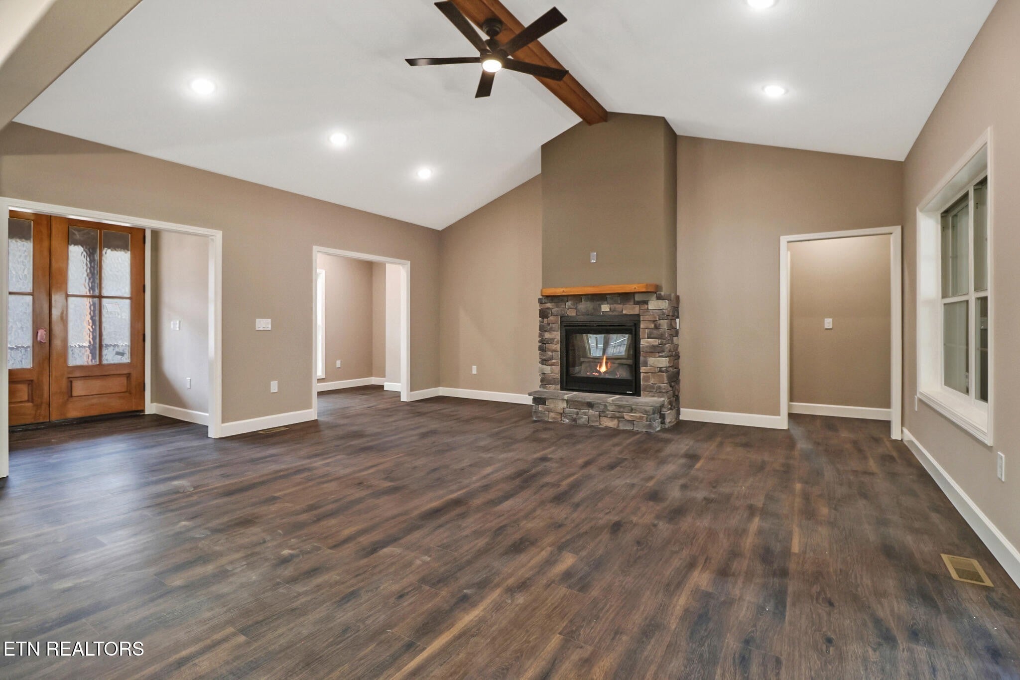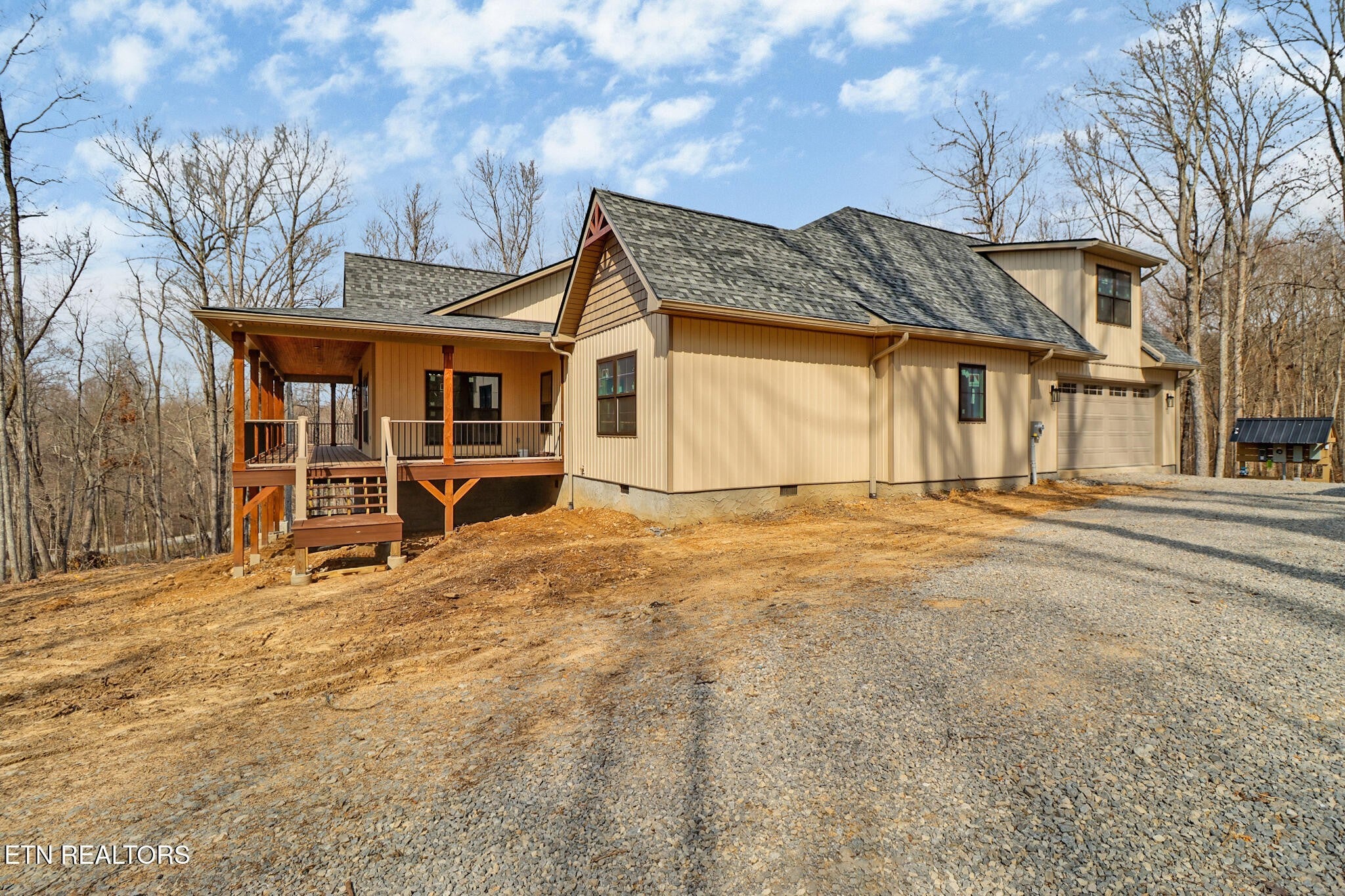 Discover Peaceful Acreage Living in the Desirable Cumberland Cove - Your Private Wooded Retreat Awaits! Nestled on a serene 4-acre wooded parcel, this thoughtfully designed single-family home offers the perfect blend of modern comfort and natural tranquility. Spanning 2,596 square feet of thoughtfully finished living space, (which includes a versatile 370-sf bonus room over the garage with its own mini-split HVAC, making it a great space for a hobby, media room, or just storage), the 3-bedroom, 2.5-bath with oversized 2 car garage home delivers ample room for family, work, and relaxation--ideal for today's buyers seeking space without sacrificing privacy. Step inside the Grand Double Entry Doors into an expansive Great Room featuring soaring vaulted ceilings and a cozy Natural Gas Log Fireplace surrounded by stone--the heart of the home for gatherings year-round. Bathed in natural light, an adjacent dedicated office/study provides a quiet, productive workspace with easy access to the main living areas. The Chef's kitchen is a standout, boasting a massive island with abundant storage on one side, including a built-in trash cabinet, and casual dining on the other. The kitchen features an oversized porcelain farm sink, elegant, white-veined quartz countertops (throughout the home), and crown-molded upper cabinets with soft-close drawers and doors. A generous walk-in pantry offers space for future shelving and organization. The kitchen flows into a bright, spacious dining room perfect for hosting. The split-bedroom layout ensures privacy. The luxurious primary suite is a true retreat, featuring a private en-suite bath with a large walk-in tiled shower with dual showerheads, a deep free-standing soaker tub with a large casement window for natural light, and an oversized walk-in closet complete with built-in linen storage.