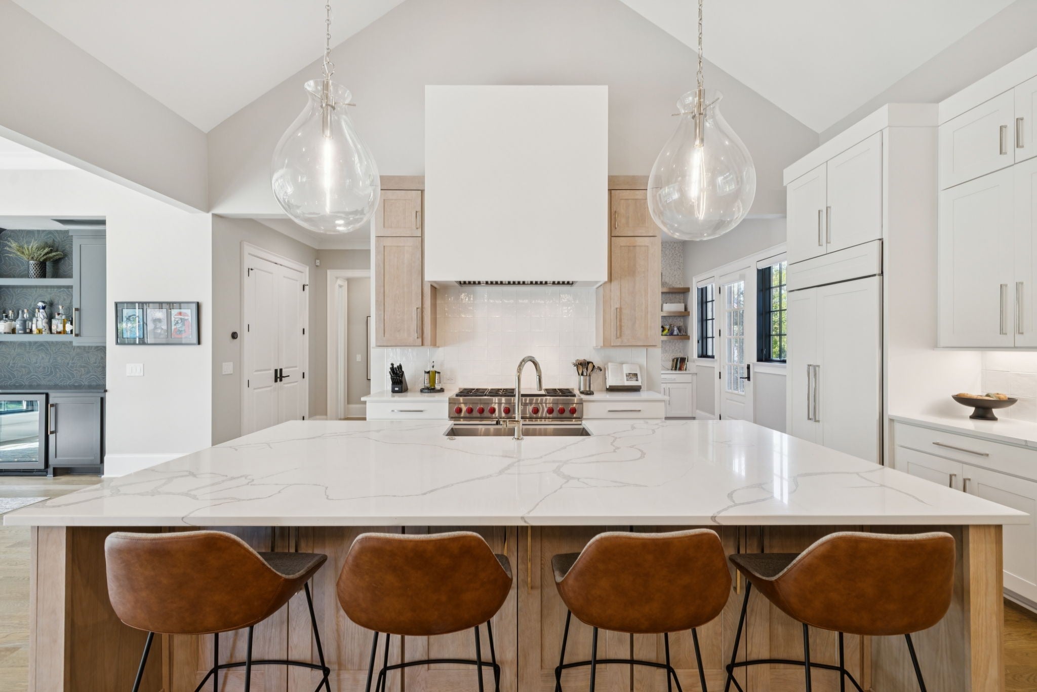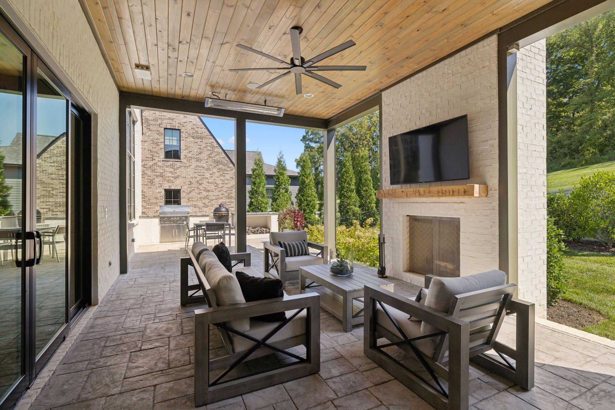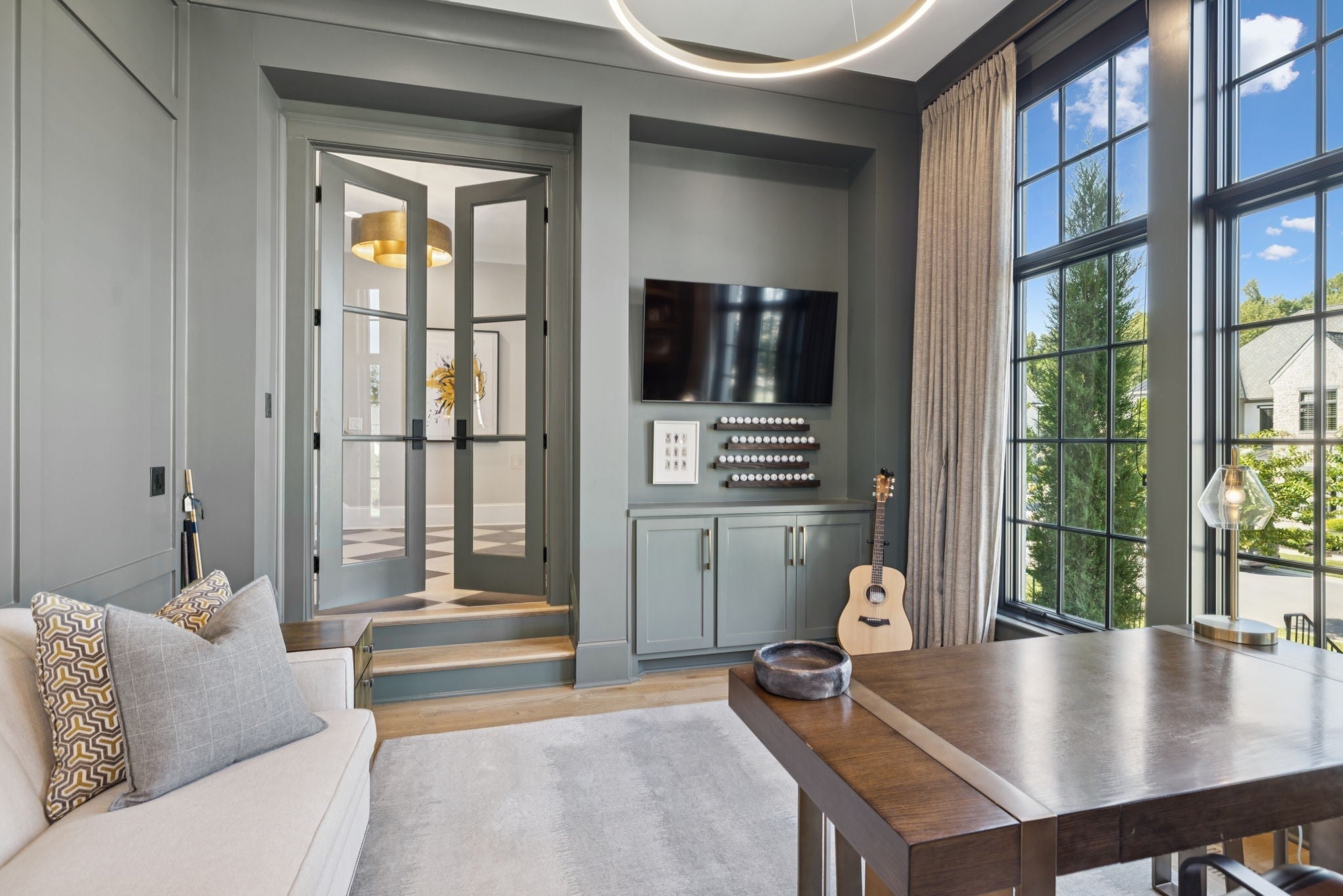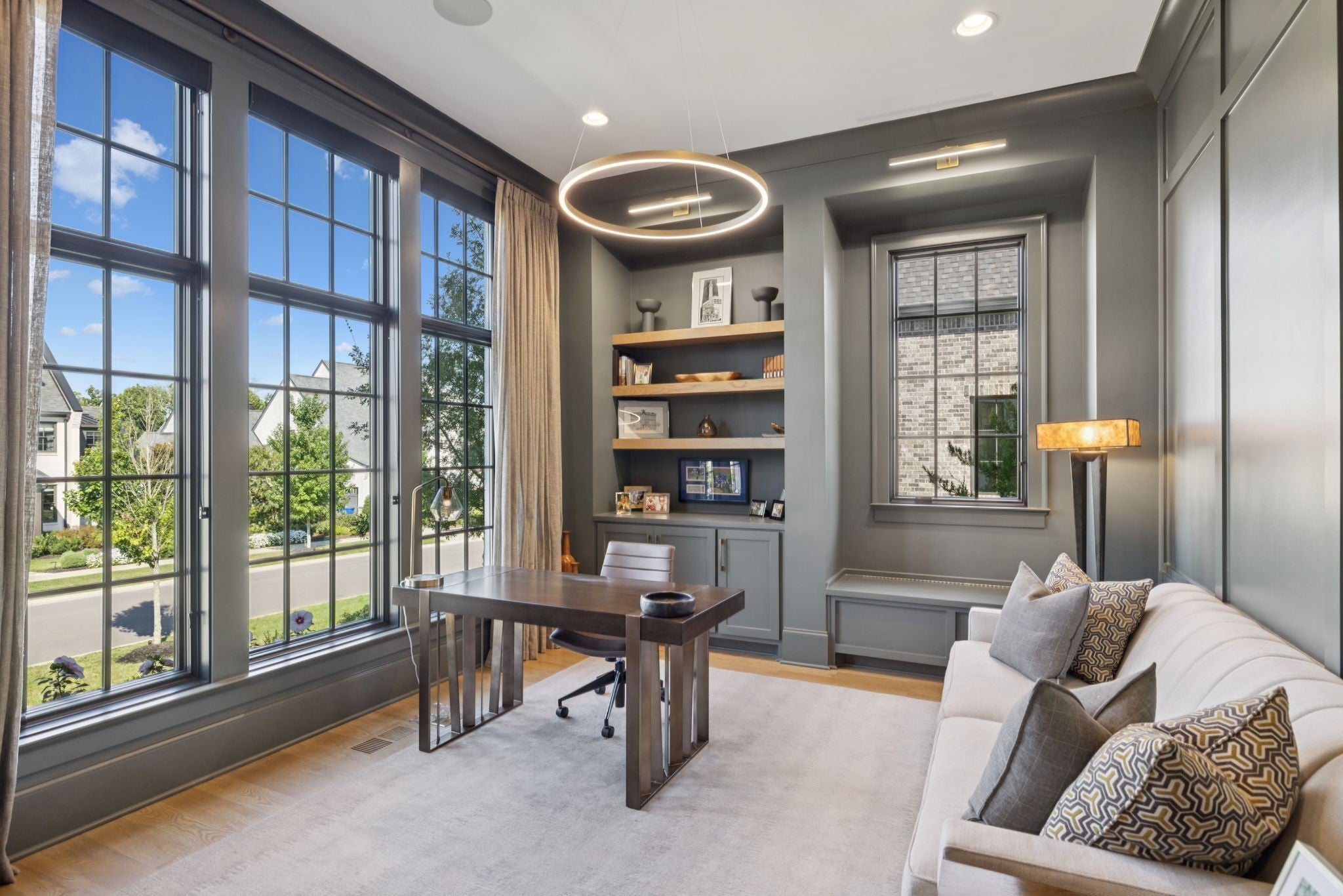 Set within the prestigious community The Grove, this stunning Modern Tudor by award-winning Stonegate Homes blends timeless architecture with elevated modern living. Thoughtfully designed for both comfort and sophistication, this private 4-bedroom residence showcases exceptional craftsmanship and high-end finishes throughout. Soaring ceilings anchor the dramatic great room, creating a light-filled space ideal for entertaining or everyday living. The chef’s kitchen is equally impressive, featuring vaulted ceilings, premium Wolf appliances, an oversized island, and a spacious walk-in pantry—perfect for both hosting and function. The serene primary suite is conveniently located on the main level, offering a luxurious retreat with spa-inspired finishes. A private den on the main floor provides flexible space for a home office or cozy lounge. Upstairs, enjoy a generous bonus room, with custom bunks designed for fun and function, and a stylish study lounge—ideal for work, play, or relaxation. Each secondary bedroom is thoughtfully appointed, maintaining the home’s sense of refined comfort. With privacy, architectural character, and luxury at every turn, this exceptional home offers an elevated lifestyle in one of the area’s most sought-after communities.