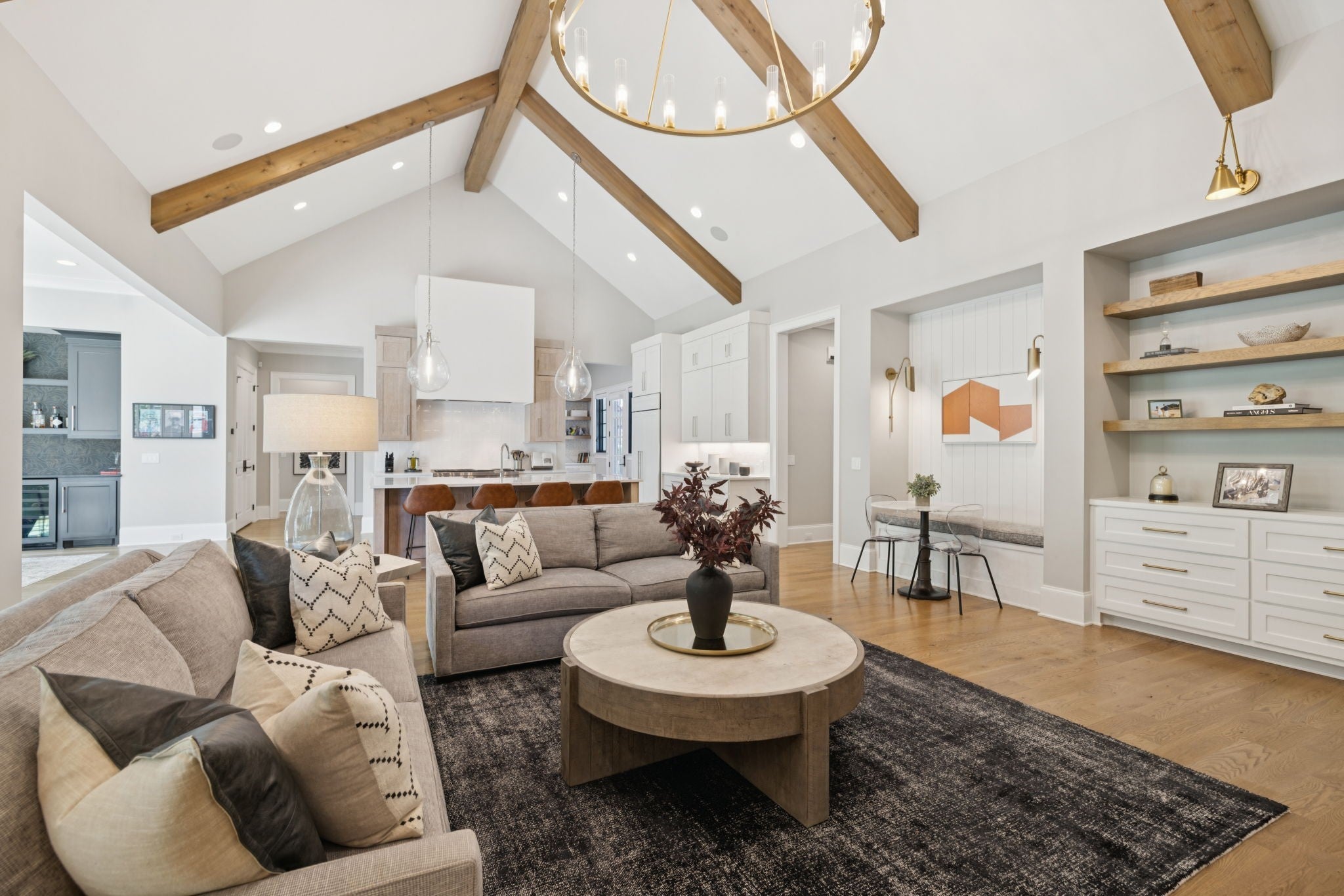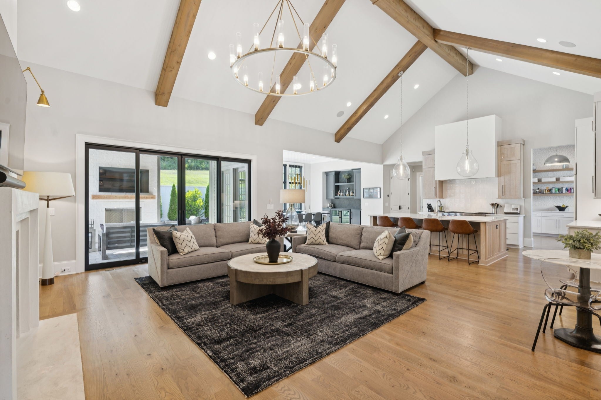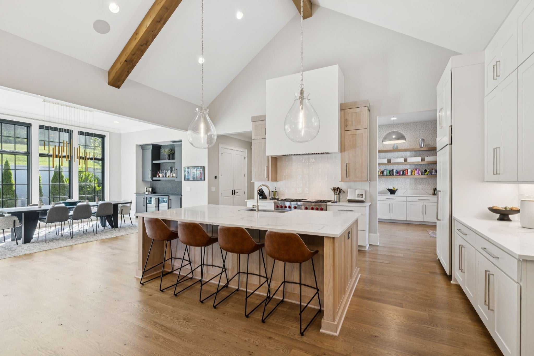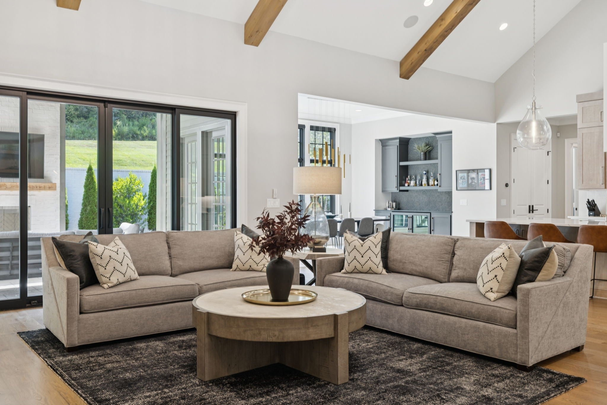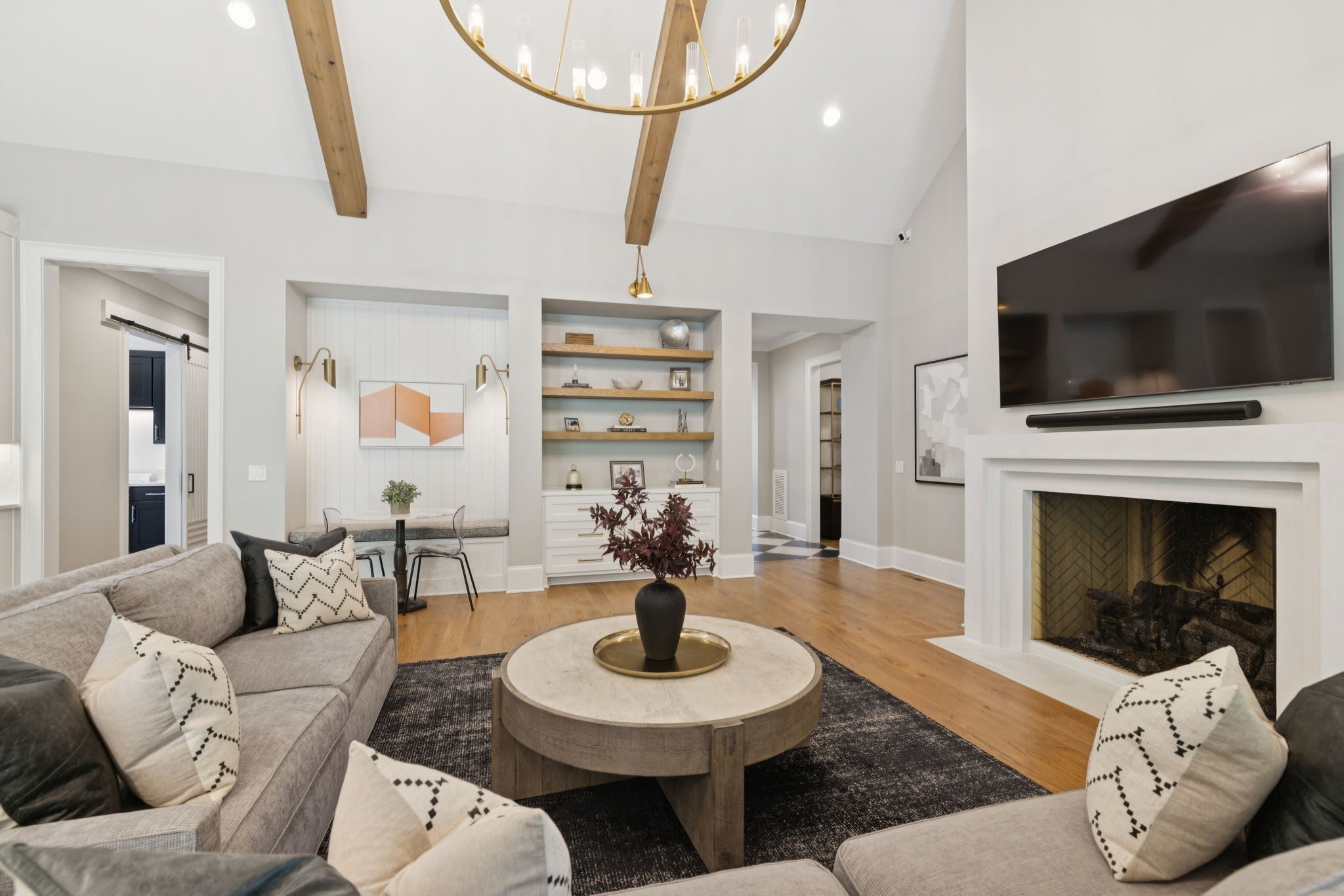 Set within the prestigious community The Grove, this stunning Modern Tudor by award-winning Stonegate Homes blends timeless architecture with elevated modern living. Thoughtfully designed for both comfort and sophistication, this private 4-bedroom residence showcases exceptional craftsmanship and high-end finishes throughout. Soaring ceilings anchor the dramatic great room, creating a light-filled space ideal for entertaining or everyday living. The chef’s kitchen is equally impressive, featuring vaulted ceilings, premium Wolf appliances, an oversized island, and a spacious walk-in pantry—perfect for both hosting and function. The serene primary suite is conveniently located on the main level, offering a luxurious retreat with spa-inspired finishes. A private den on the main floor provides flexible space for a home office or cozy lounge. Upstairs, enjoy a generous bonus room, with custom bunks designed for fun and function, and a stylish study lounge—ideal for work, play, or relaxation. Each secondary bedroom is thoughtfully appointed, maintaining the home’s sense of refined comfort. With privacy, architectural character, and luxury at every turn, this exceptional home offers an elevated lifestyle in one of the area’s most sought-after communities.