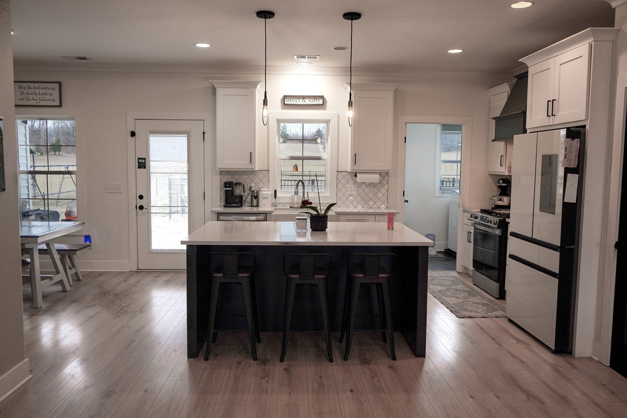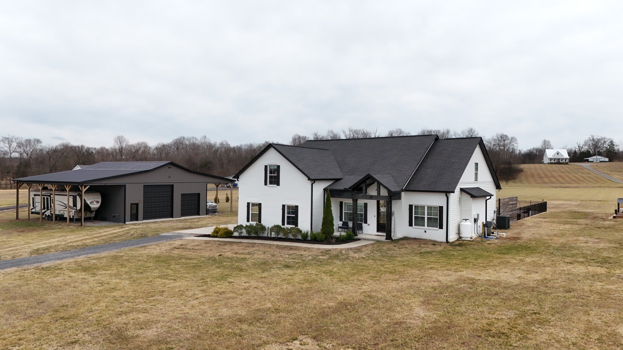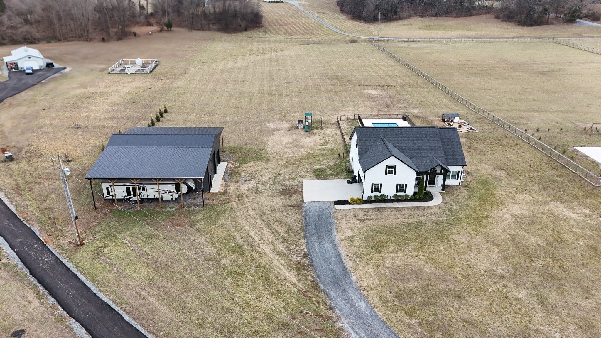 Tucked away on a flat, secluded 5-acre lot just off the road, this beautiful property offers the perfect blend of peaceful country living and convenient access to town. Designed for both comfort and entertaining, the home features a modern open floor plan with stunning exposed beams throughout the main level, creating a warm and inviting atmosphere. Step outside to enjoy an in-ground pool and a spacious back patio—ideal for hosting gatherings, summer barbecues, or relaxing evenings outdoors. The property also includes a 40x50 workshop with two 16-foot lean-tos, providing ample space for equipment, hobbies, or storage. Additional highlights include upstairs bonus room for flexible living space, spacious primary suite with a walk-in shower, small garden area for homegrown produce, and private setting with a country feel, yet close to town conveniences. This property offers the rare combination of space, privacy, functionality, and modern style—perfect for those seeking a peaceful lifestyle without sacrificing accessibility. Samsung Bespoke fridge to convey with property. Chicken coop does not convey Under Contact. Accepting additional offers. (1st right of refusal)
