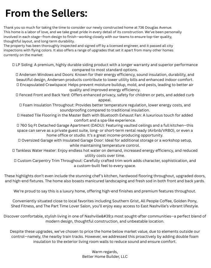 LUXE NEW HOME w/ FULL GUEST HOUSE (Approx. 700 Additional Square Feet Living Area!) *DETACHED GARAGE/WORKSHOP*Watch the Interior/Exterior Video*It's Nashville Baby and This Home is the Epitome of All Things Nashville****Approx. 7 Minutes to Downtown Nashville/The Gulch because Convenience is the ULTIMATE LUXURY***This Douglas Avenue Location is a TOTAL VIBE***NEXT LEVEL NEW HOME by Luxury Building Group w/ One of the Top Designers in Nashville and You WILL NOT be Disappointed*Fabulous Open Concept Design*Immense Quality Throughout*HIGH END Design Selections on this Home are STUNNING*Estate Style "Arched" Front Door Sets the Tone to what Awaits Inside*Attention to the Details with Every Selection from Statement Lighting, Custom Wall Accents, Fixtures + Hardware*Impressive Great Room w/ Fireplace, High Ceilings, Fluted Wall Accents + Full Length Windows with View of the Backyard Oasis*LARGE MEDIA ROOM/Home Theater Room/5th Space*Professional Grade Kitchen w/ Spectacular Cabinet Package w/ Custom Layout including a FULL PANTRY WALL with Floor to Ceiling Cabinets*Upgraded Stainless Steel Appliance Package*Gas Stove Upgrade*Custom "Drop Down" Vent Vent*MASSIVE Quartz Island/Breakfast Bar*SLAB Backsplash*California Gold Potfiller + Hardware*PRIMARY SUITE OF YOUR DREAMS on the Main Level w/ Spa Worthy Primary Bathroom*Floating Tub + Incredible Double Shower*The Tilework in this Home is a Work of Art*Upgraded Wide Plank Luxury Flooring (No Carpet at All)*Tile Bathrooms**Upgraded Foam Insulation for Energy Efficiency*Professionally Staged + Shows Like a Model Home*1 Year New Home Warranty for Peace of Mind*FABULOUS OUTDOOR ENTERTAINMENT AREA...This Home is Perfect for Parties + Hosting*This Back Yard is calling for String Lights*The Private Back Yard has a Fully Fenced PRIVATE Courtyard*LOTS OF PARKING-Oversized Detached Garage plus PRIVATE Concrete Drive Parking*PERFECT FOR MULTI-GENERATIONAL LIVING*No Hoa Fees Here*00-STR Option-Buyer to Confirm*