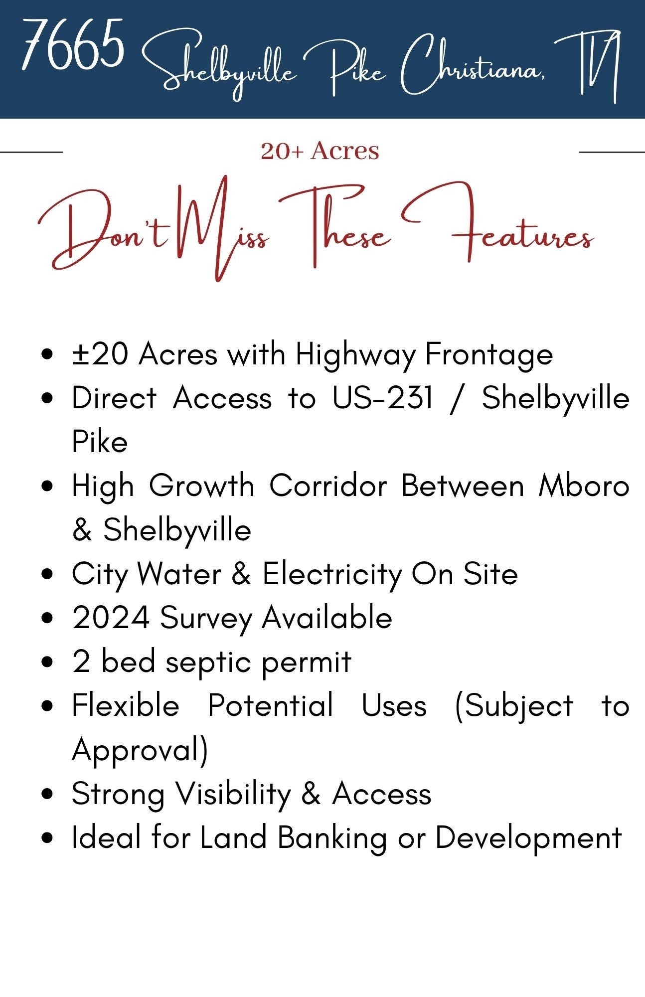 Prime 20± acre opportunity with substantial frontage along highly traveled Shelbyville Pike (US-231) in the growing corridor between Murfreesboro and Shelbyville. Excellent visibility and access make this an ideal land investment with long-term upside. City water and electricity on site. A 2-bedroom septic permit is on file. Ideal for investors, developers, or buyers looking to secure land in a high-growth area. A survey was completed in 2024. Preliminary meetings have been completed with Rutherford County and TDOT regarding potential future development and ingress/egress planning. Property features a mix of open and wooded terrain with rolling topography and existing access off the highway. The property benefits from substantial highway frontage, strong visibility, and direct access in a corridor experiencing continued residential, industrial, and commercial expansion. Do not enter the house it is not safe.