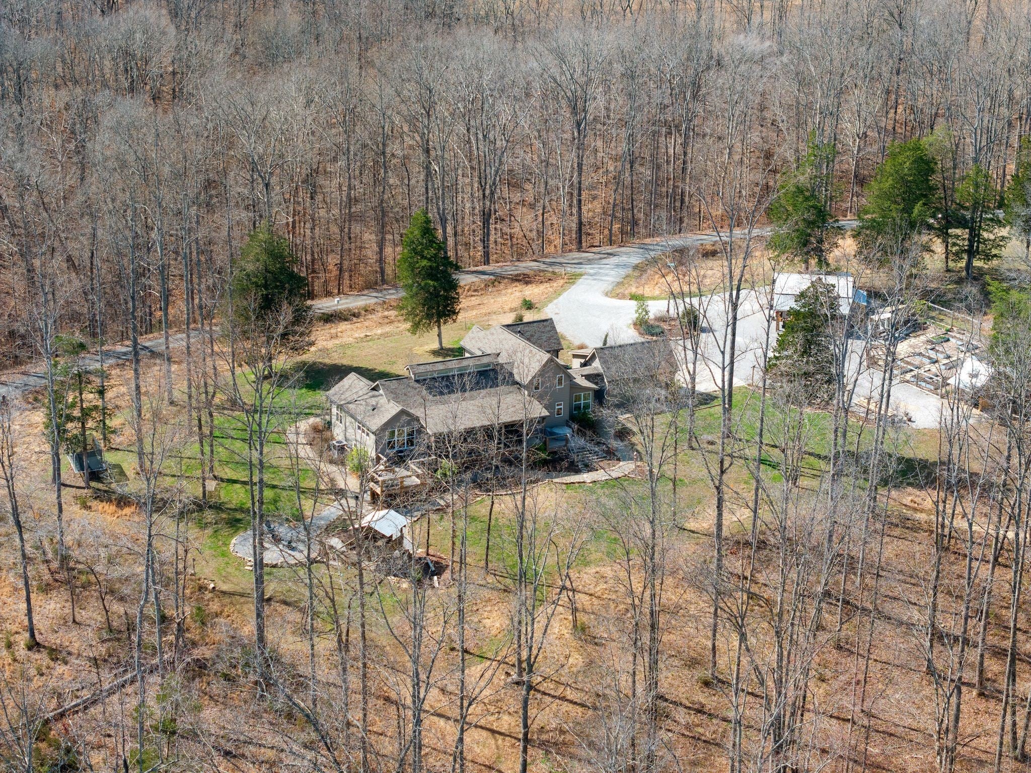 Beautiful home on 5 acres located on a private dead-end road in Williamson County. Surrounded by forest & a native prairie, this property is entirely landscaped with native trees, grasses, and wildflowers. Master and a guest bedroom on the main level and 2 bedrooms up with a shared bath & common space. Large windows & a clerestory in the main living room & dining room, letting in light & the natural surroundings. White oak hardwood floors. Home office with custom wood shelving & desk. Large front porch & screened porch off back with 2 side decks for grilling or hot tub. Outside, the property includes a large garden with raised beds, a garden shed, greenhouse & grape arbor. A wooden barn with attached workshop is located off the driveway, allowing for extra parking or equipment storage. Includes an RV hookup. A whimsical treehouse & firepit are nestled in the back corner. Beautifully situated above a year-round spring fed creek with multiple trails & a recently built deck. A nature lovers paradise. Definitely a must to see.