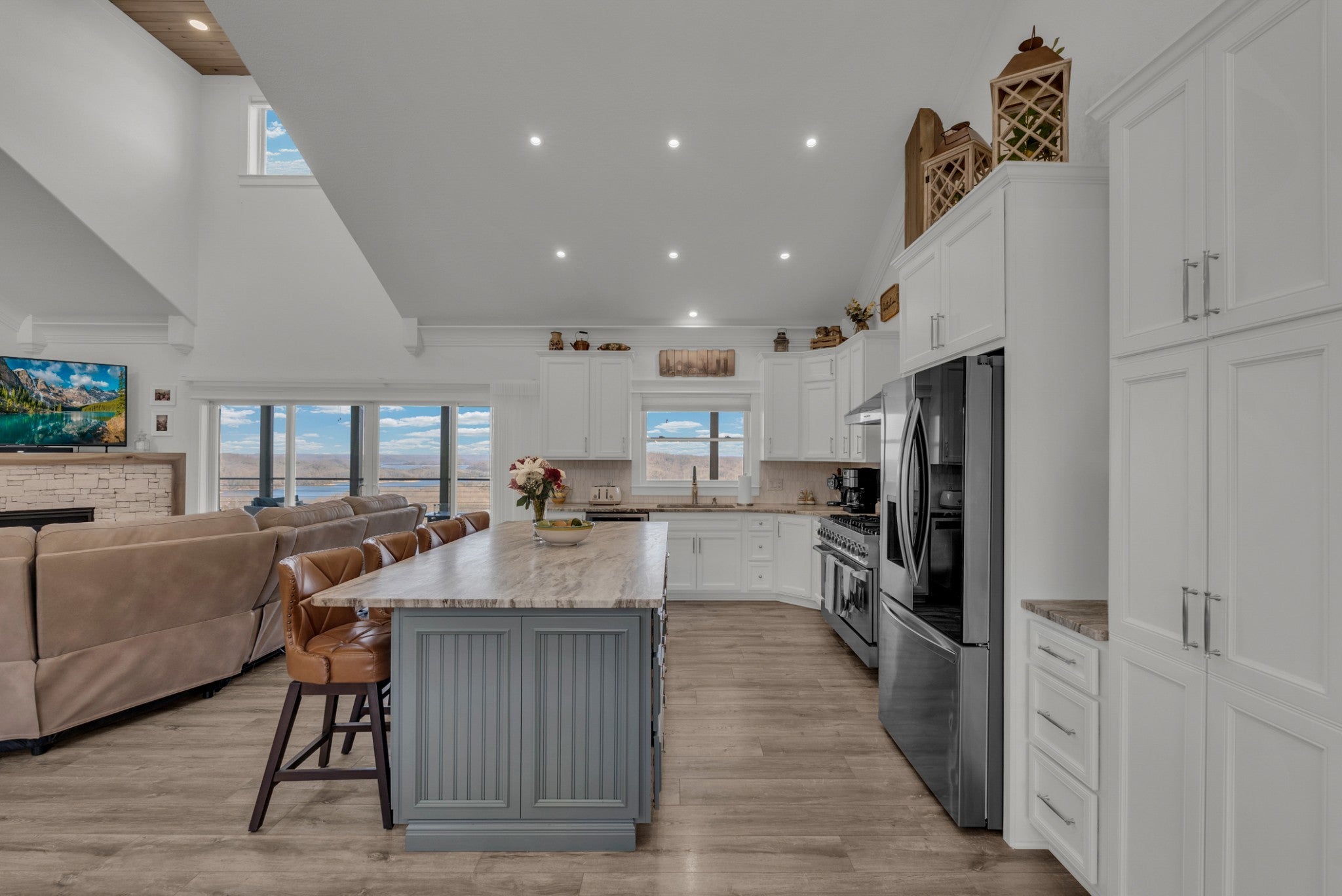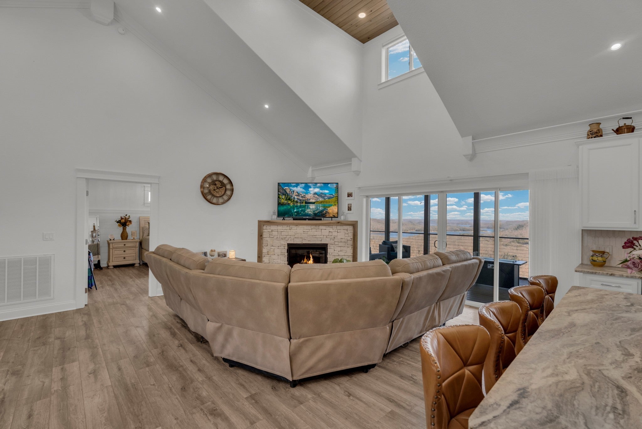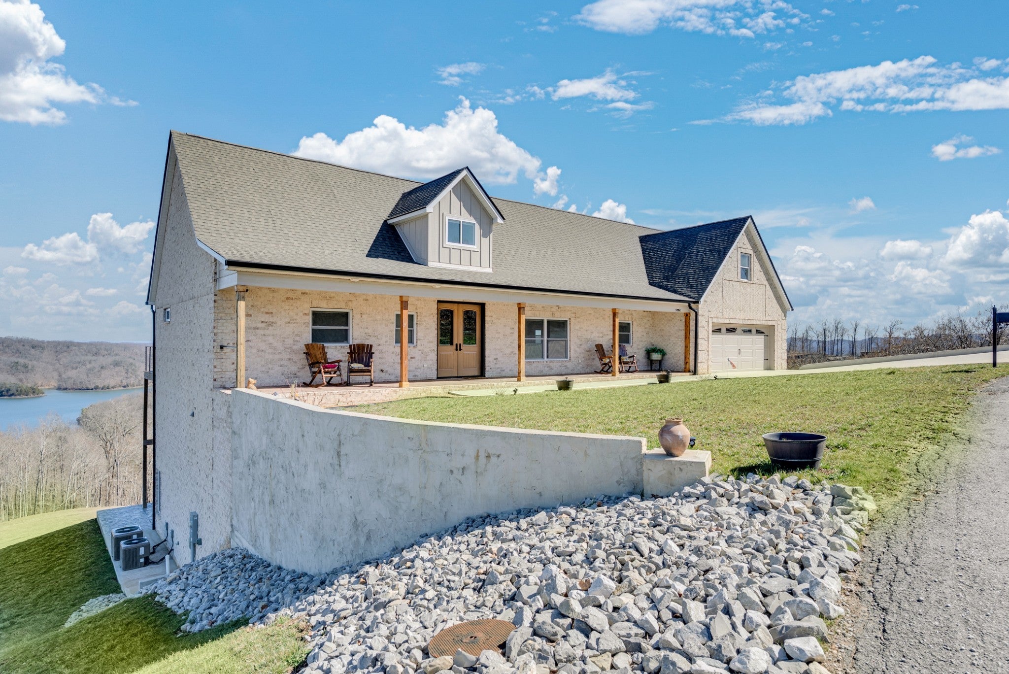 Classy, luxurious comfort with panoramic views of Dale Hollow Lake! Situated on over 1 acre, this stunning home offers 3 bedrooms plus a flex room (currently used as a 4th bedroom or ideal office) and 3.5 bathrooms. Two master suites each have private deck access, connected by a screened-in porch off the living room. The walkout basement features 2 bedrooms, a full bath, spacious living area, bar, and abundant storage. Enjoy the full-length concrete patio overlooking the lake. Concrete finishes and Trex decking add durability and style. Certain personal items negotiable. Community clubhouse includes an inground pool, exercise room, fireplace gathering space, game room, and an entertainer’s pavilion with fireplace, picnic tables, and rocking chairs—all overlooking beautiful Dale Hollow Lake.