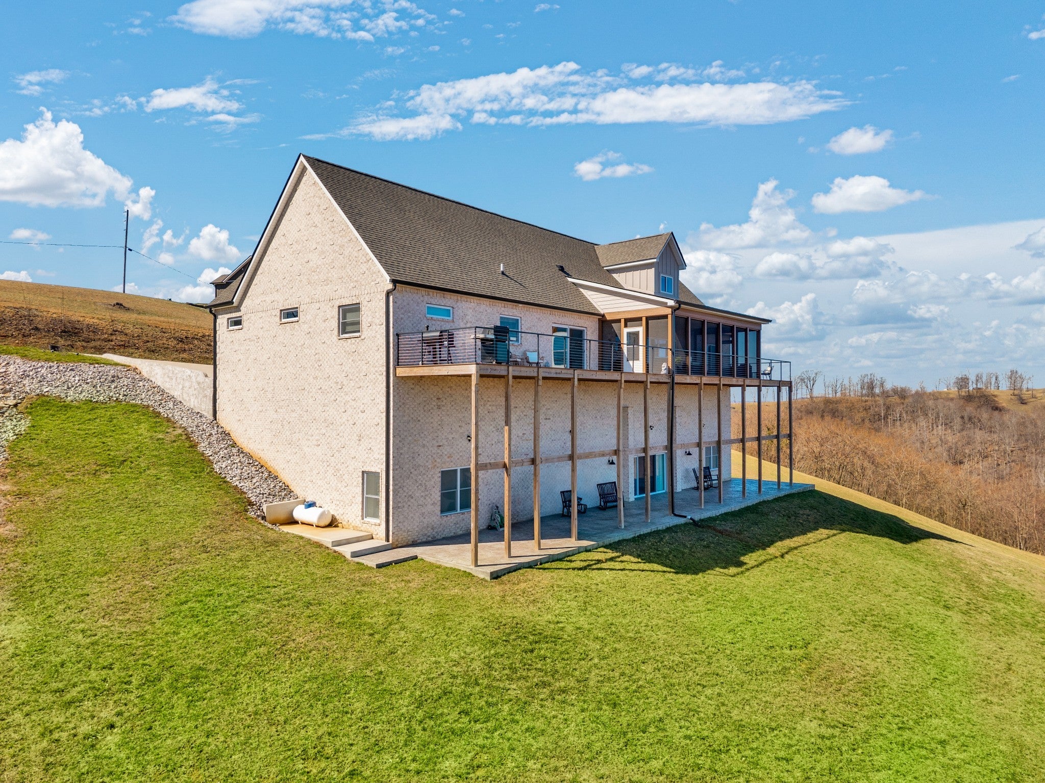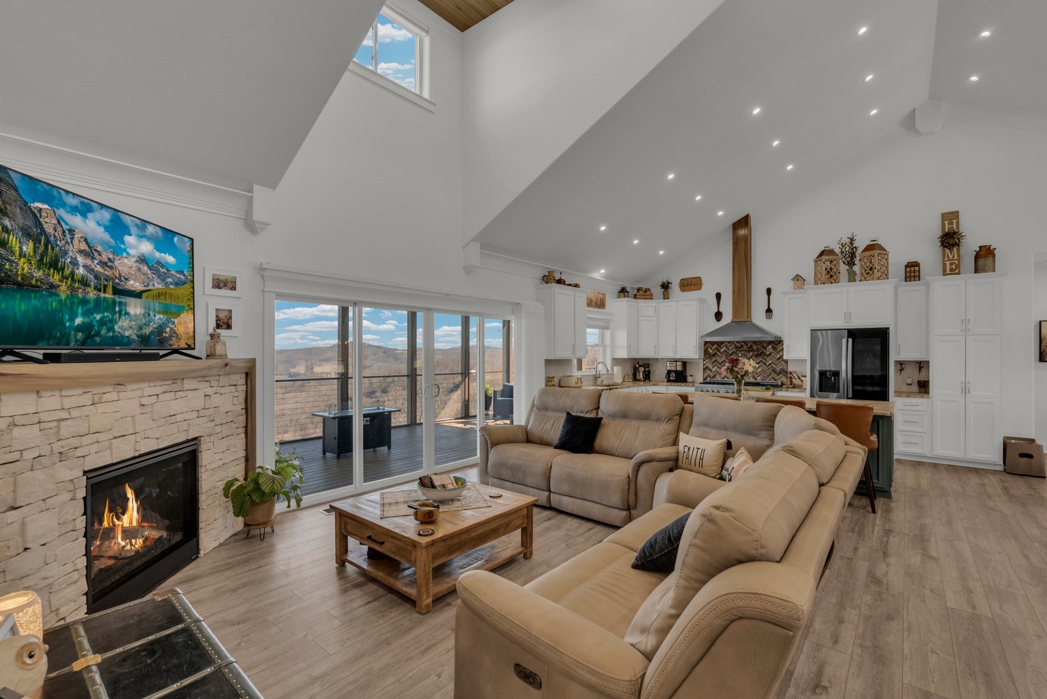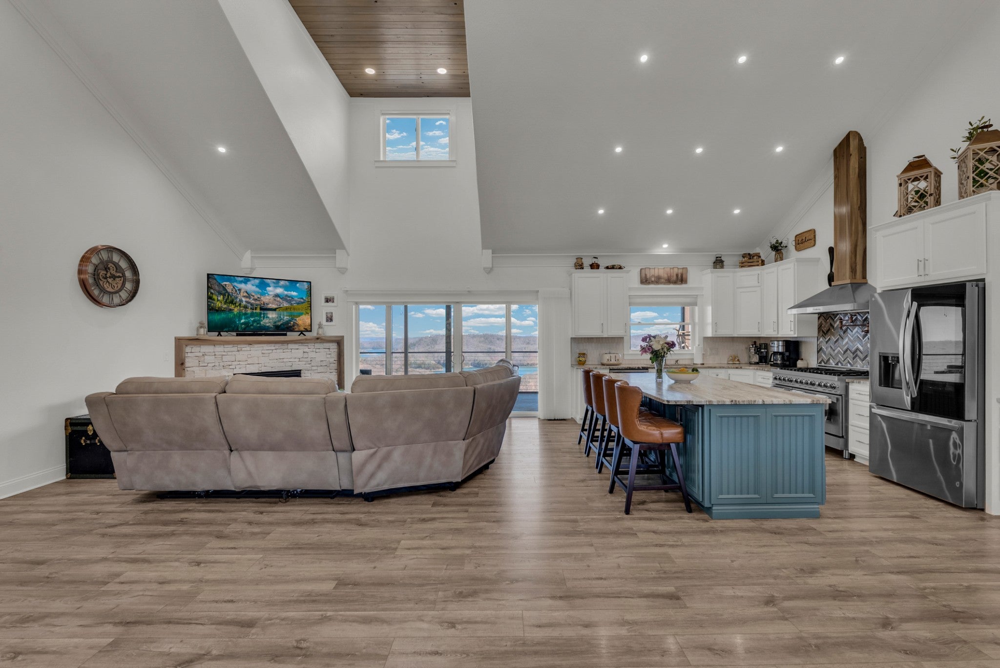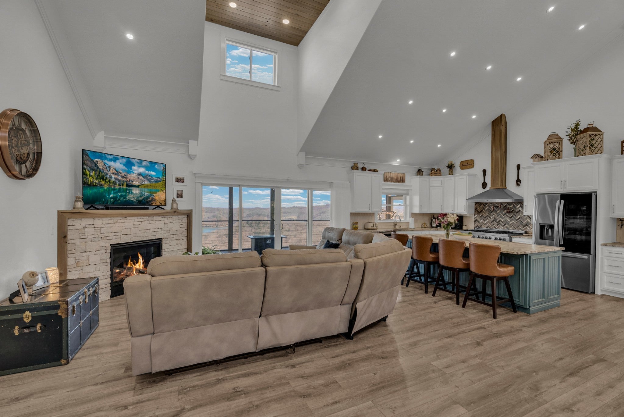 Classy, luxurious comfort with panoramic views of Dale Hollow Lake! Situated on over 1 acre, this stunning home offers 3 bedrooms plus a flex room (currently used as a 4th bedroom or ideal office) and 3.5 bathrooms. Two master suites each have private deck access, connected by a screened-in porch off the living room. The walkout basement features 2 bedrooms, a full bath, spacious living area, bar, and abundant storage. Enjoy the full-length concrete patio overlooking the lake. Concrete finishes and Trex decking add durability and style. Certain personal items negotiable. Community clubhouse includes an inground pool, exercise room, fireplace gathering space, game room, and an entertainer’s pavilion with fireplace, picnic tables, and rocking chairs—all overlooking beautiful Dale Hollow Lake.