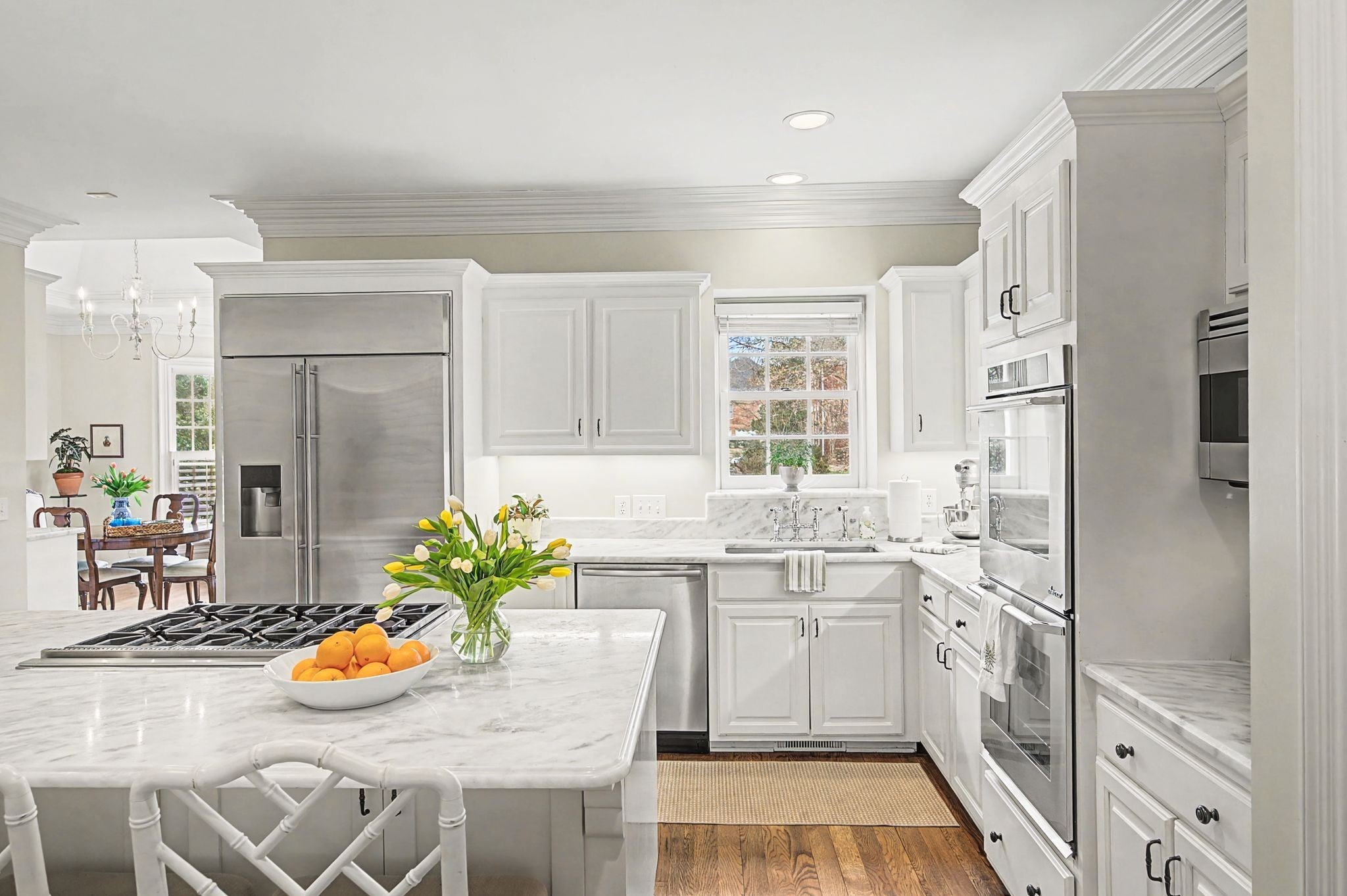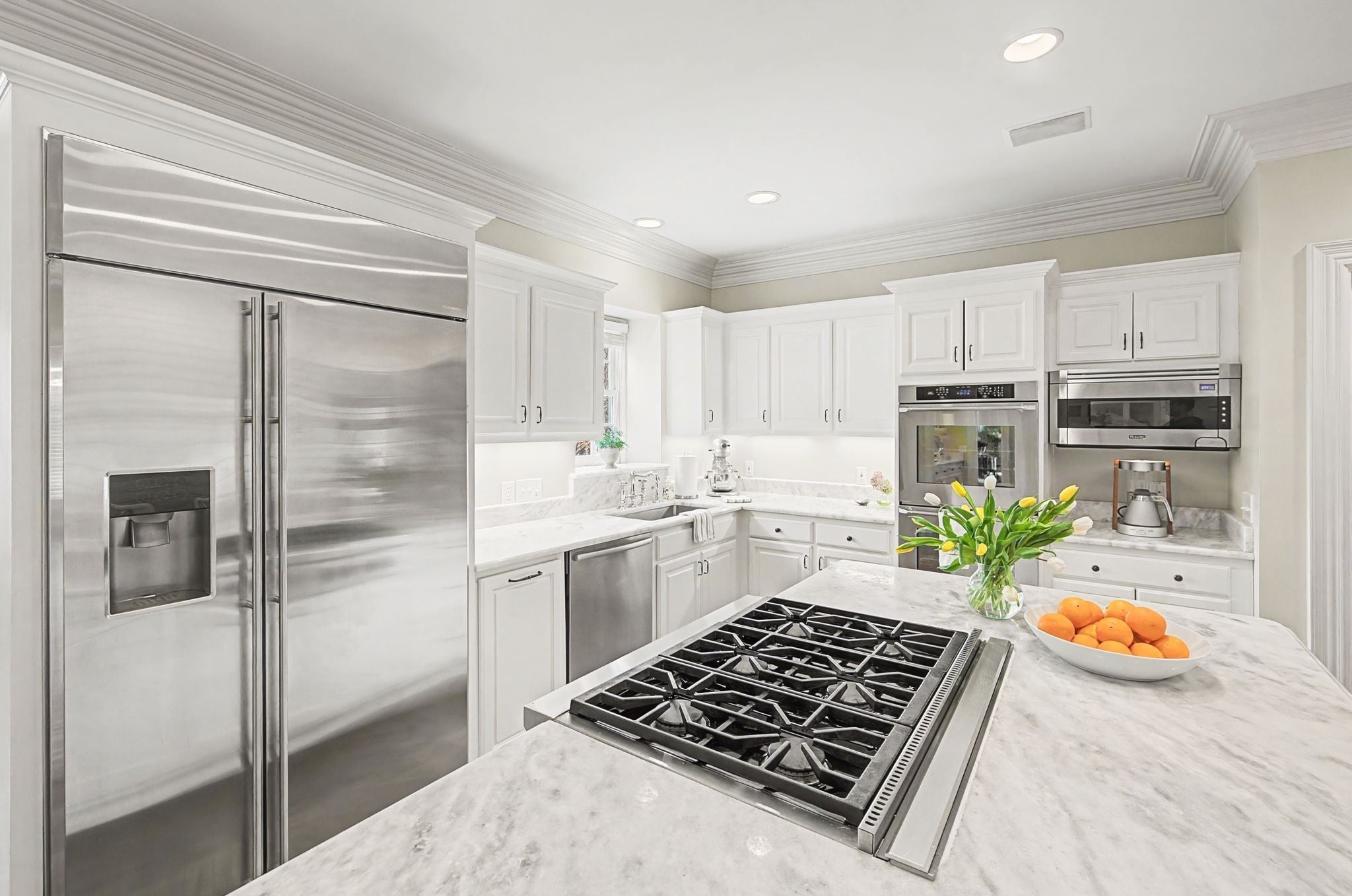 - Built-In Electric Oven, Double Oven, Cooktop, Gas Range, Dishwasher, Disposal, Microwave, Refrigerator, Stainless Steel Appliance(s)