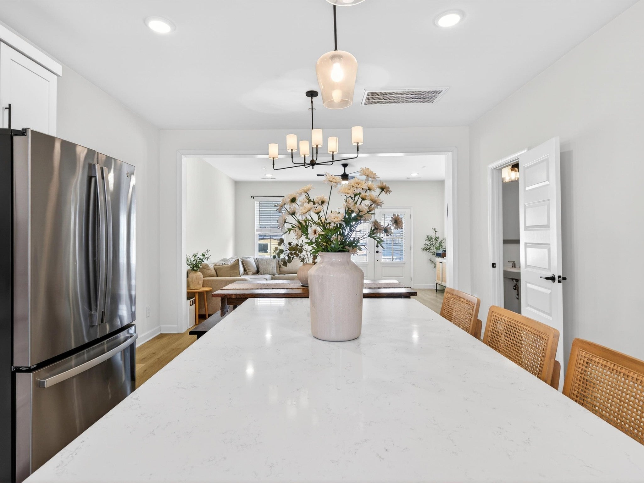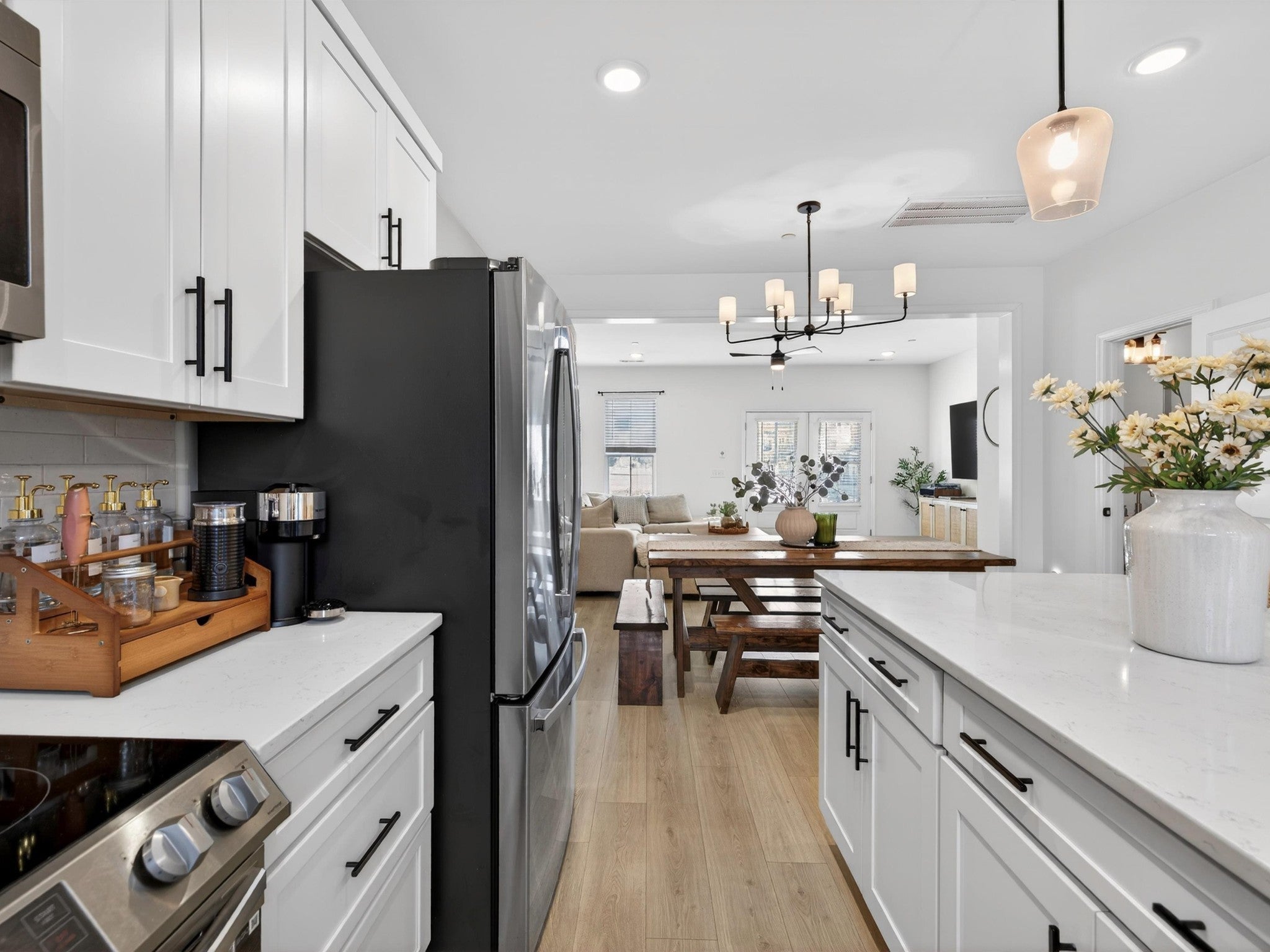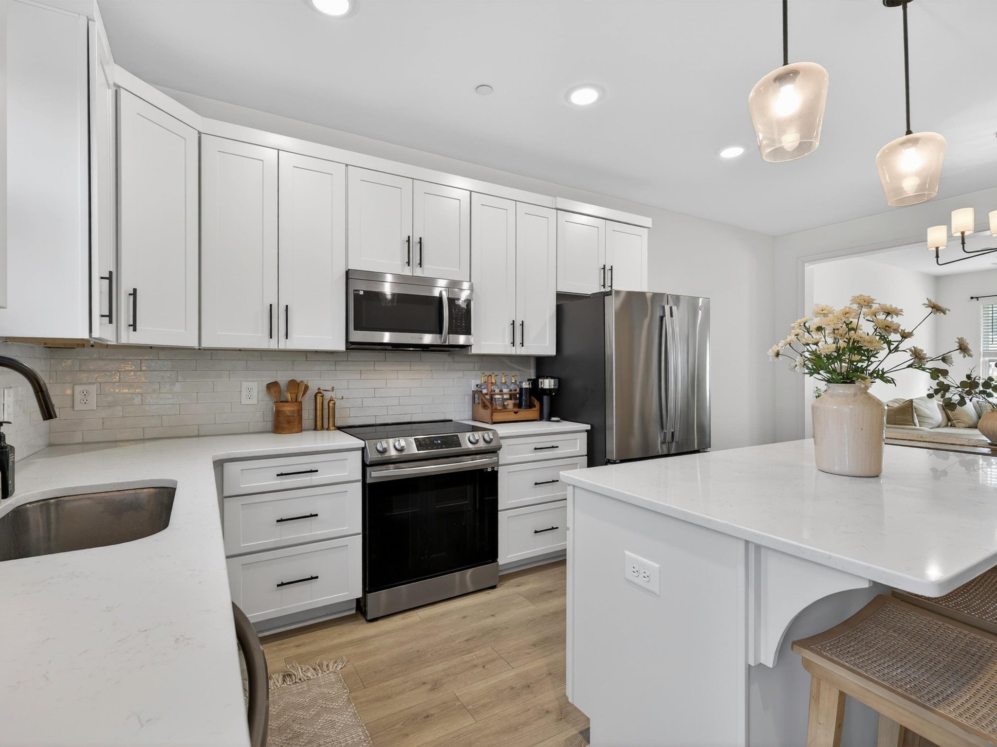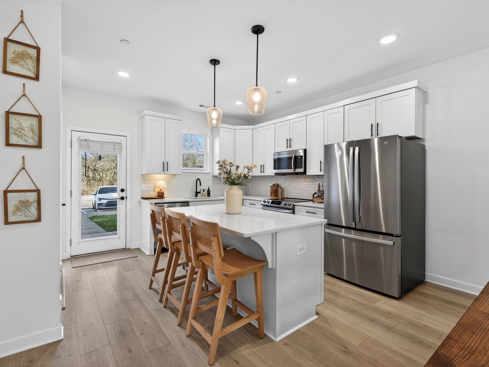 Welcome to 1945 Amacher Dr, a stunning newer construction townhome in the heart of Spring Hill, built in 2023 and designed with modern comfort and style in mind. This beautifully appointed 2-bedroom, 2.5-bath home offers 1,330 square feet of thoughtfully designed living space across two levels. The main living area features rich hardwood floors and hardwood stairs, creating a warm and upscale feel throughout. The open-concept kitchen is a true highlight, complete with sleek quartz countertops, crisp white cabinets, stainless steel appliances, a spacious center island, and large pantry—perfect for everyday living and entertaining. The kitchen flows seamlessly into the living and dining areas, filled with natural light. Upstairs, the primary bedrooms offer a private en-suite bathroom with quartz countertops, double sinks, and large walk-in shower. The second bedroom offers an en-suite bathroom and covered balcony extending the living space outdoors ideal for morning coffee or evening relaxation. Located just steps away from shopping and restaurants, this home offers unmatched walkability while still providing a low-maintenance lifestyle. With contemporary finishes, a prime Spring Hill location with top rated schools, and easy access to major commuter routes, this property is ideal for first-time buyers, young professionals, downsizers, or investors alike. Don’t miss this opportunity to own a nearly new home in one of Middle Tennessee’s most desirable and fast-growing communities.