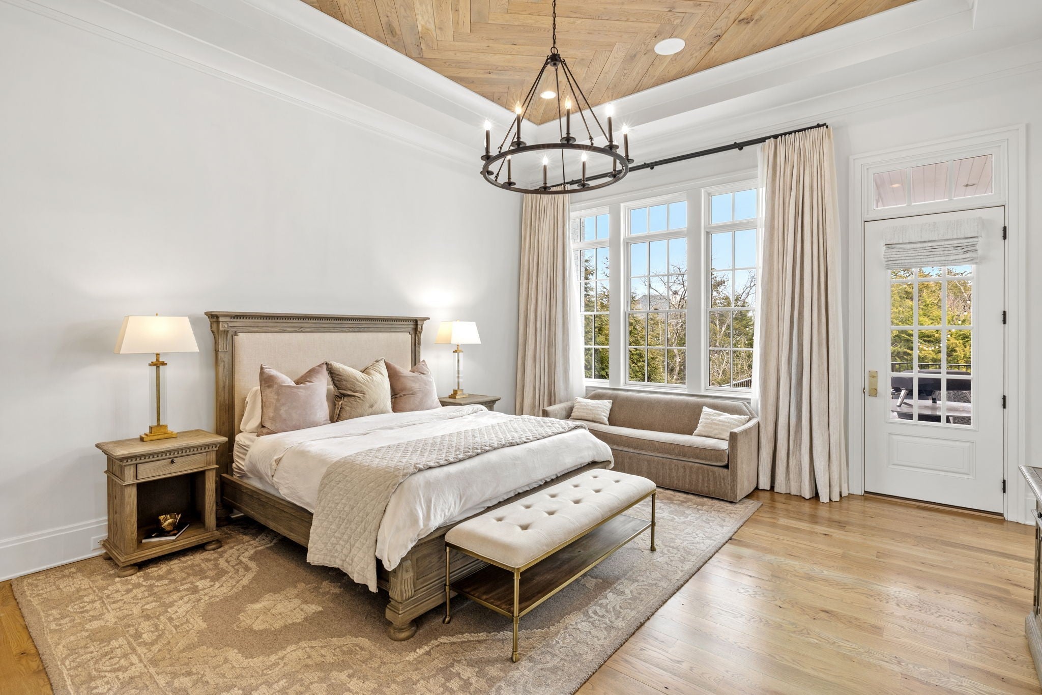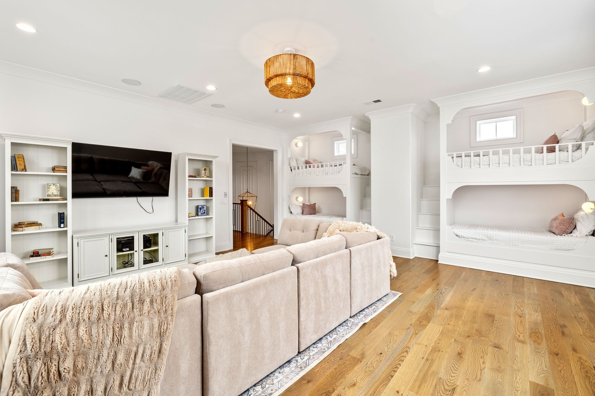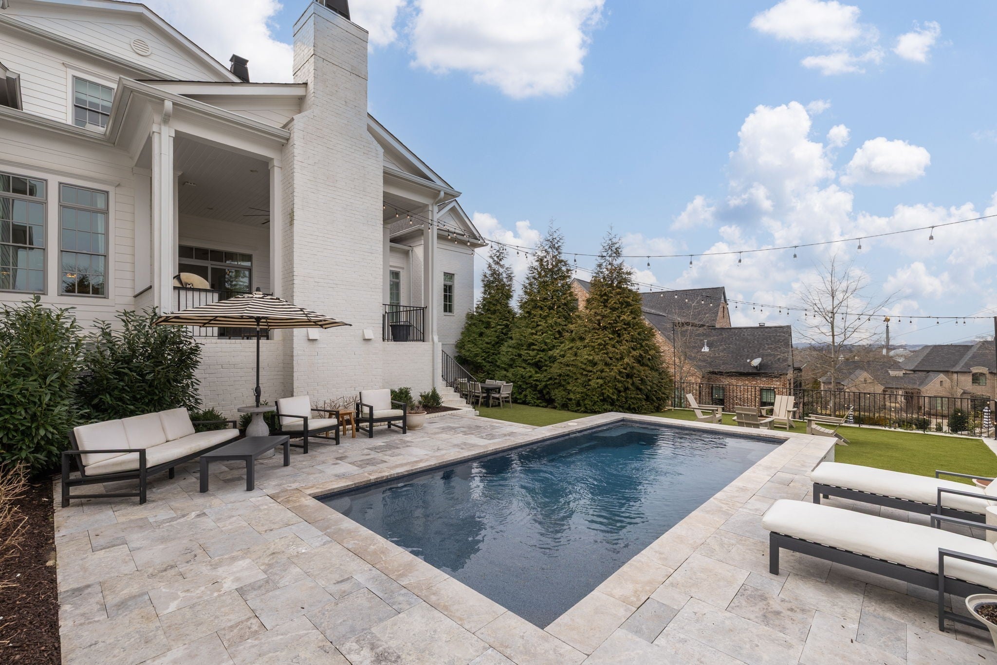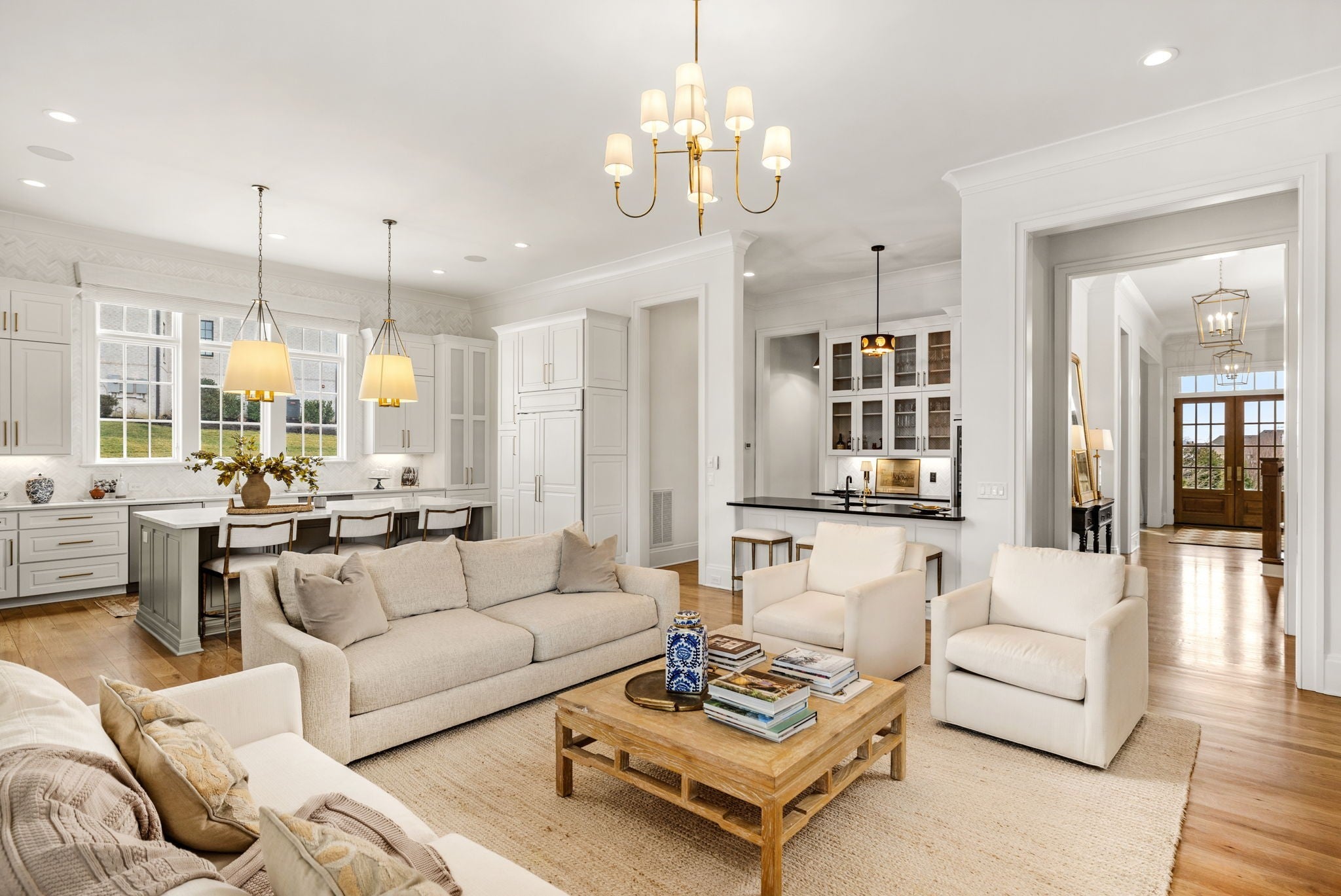An exceptional custom residence by Stonegate Homes, set within Witherspoon - one of Brentwood’s most desirable communities - and thoughtfully positioned to capture expansive views. Welcoming double covered front porches set the tone for the exceptional craftsmanship found throughout. The main level showcases 12-foot ceilings and a chef’s kitchen designed for effortless hosting. Anchored by a 60” range and featuring a large wet bar, the kitchen offers generous natural light and an open, well-proportioned layout. The primary suite on the main level features elegant tray ceiling details and a spa-like bath with dual vanities, walk-in closets, and dual water closets, offering exceptional privacy and convenience. The second level offers 10-foot ceilings and an expansive bonus room with built-in bunk beds, complemented by en suite baths for all bedrooms. A separate back staircase leads to a thoughtfully reimagined home wellness suite with professional-grade gym flooring, custom wood paneling, a spa-inspired bath, and a custom steam sauna. The outdoor living space is elevated with a covered rear porch featuring a fireplace and grilling area. Overlooking the pool and manicured turf, multiple entertaining areas designed for both relaxation and gatherings are set against the backdrop of a tree-lined common area that offers privacy. The home has been further enhanced with numerous high-end upgrades, including a whole-home water filtration and soft-water system, Waterstone unlacquered brass kitchen fixtures and pot filler, and a majority of lighting replaced with premium Visual Comfort designer fixtures. Additional improvements include many thoughtful touches that enhance both comfort and functionality.