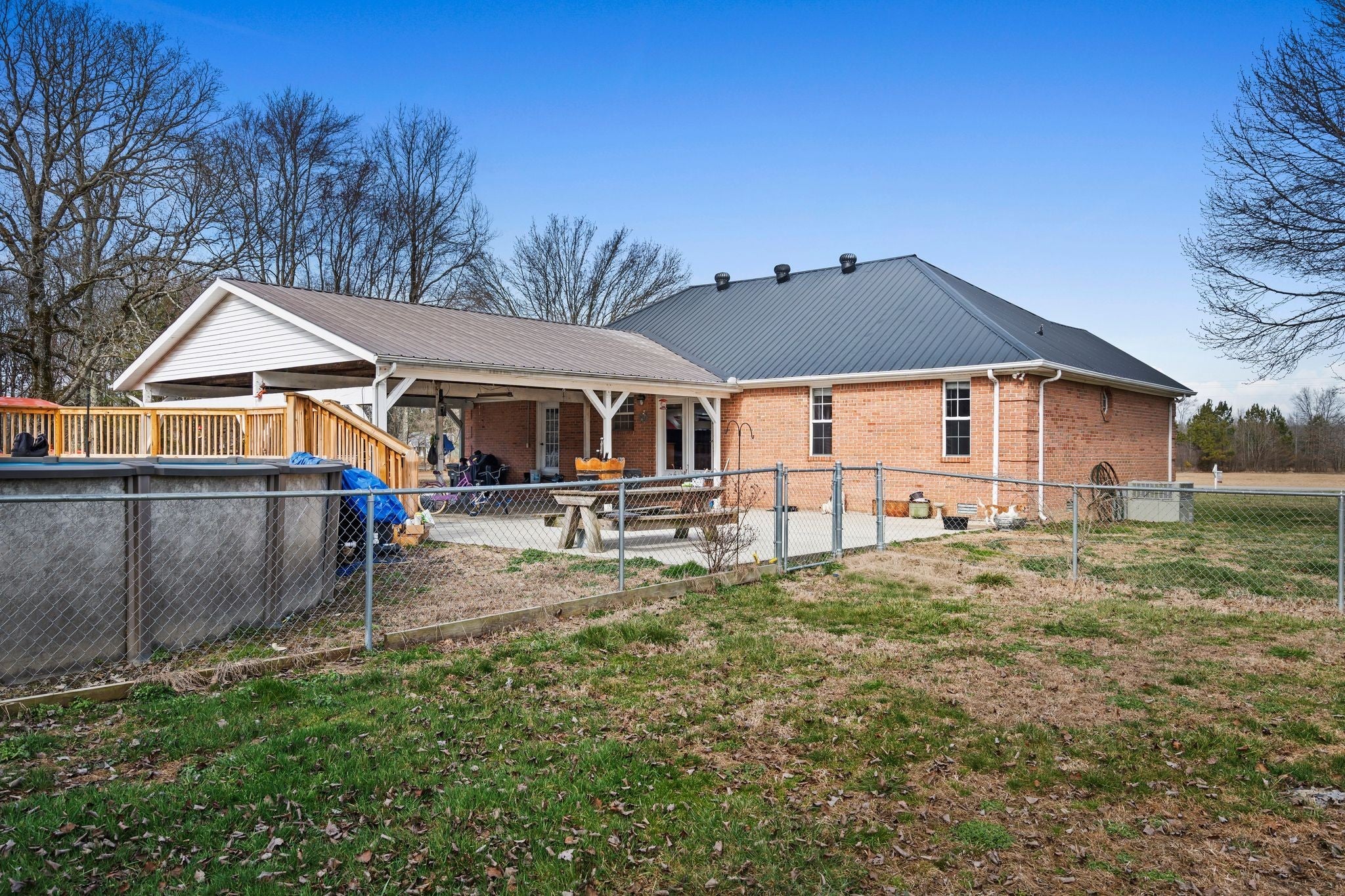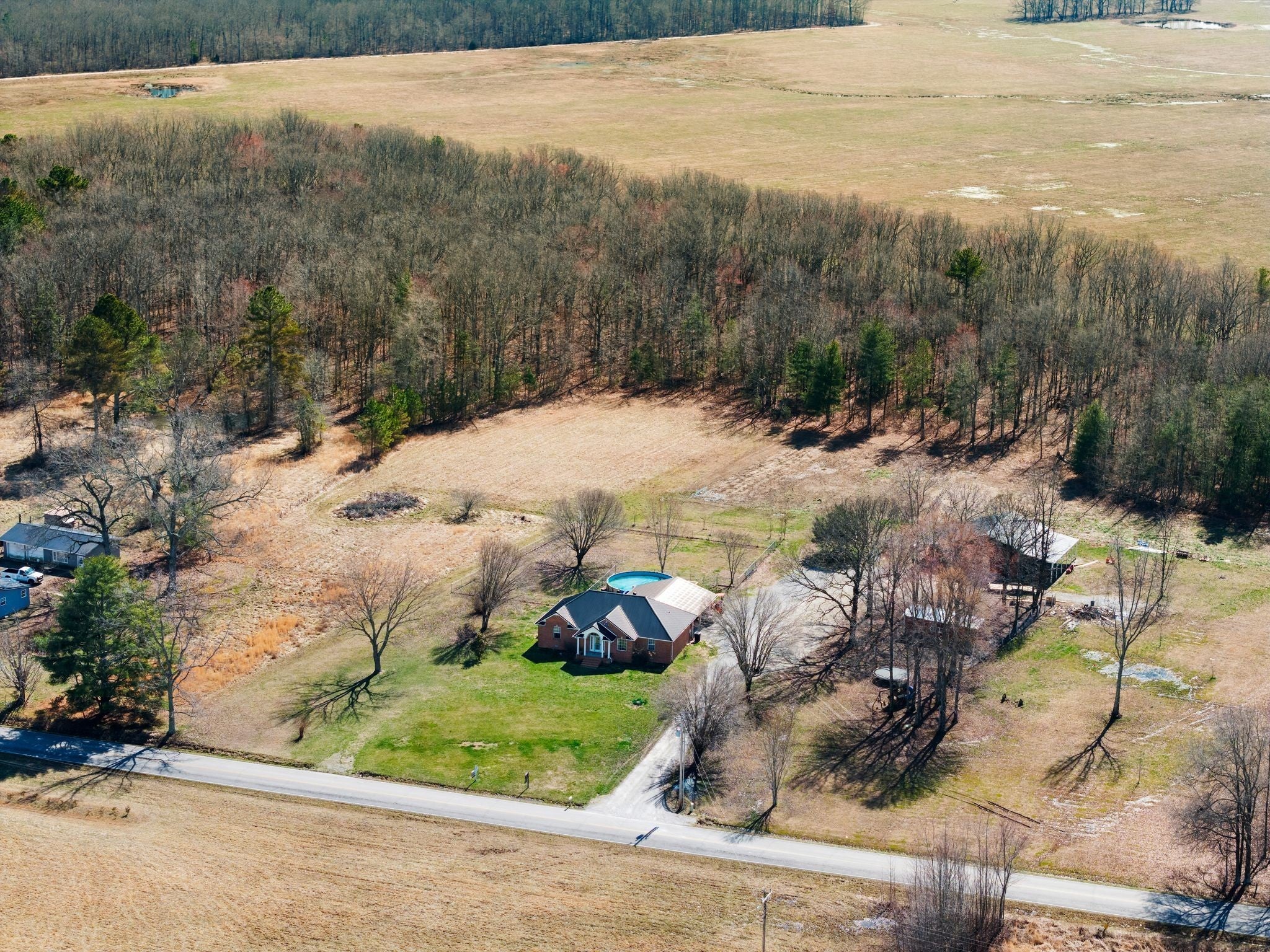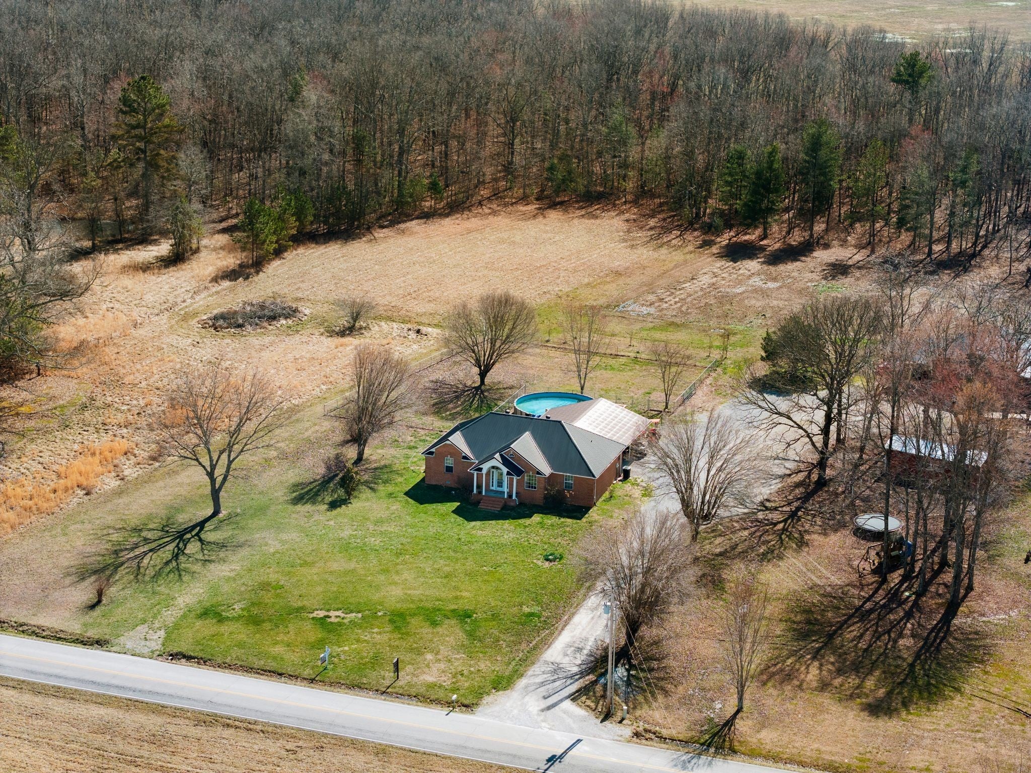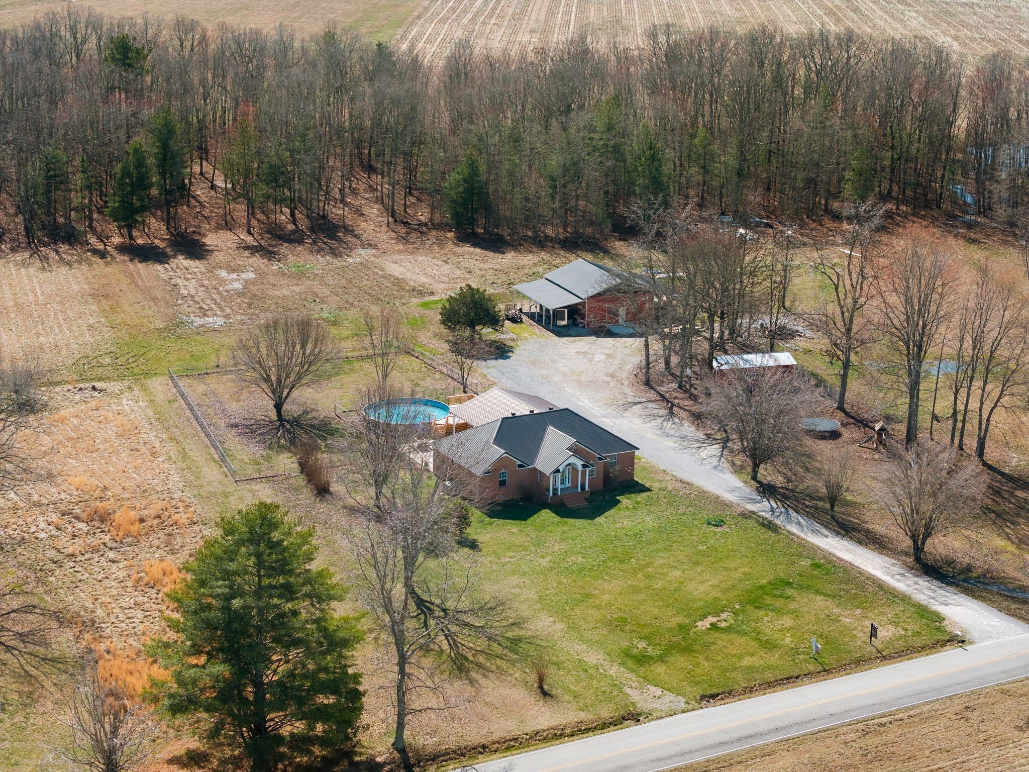 Welcome to a rare opportunity to own a true homestead-ready property offering 16.5 level, usable acres, a large workshop, fenced chicken coop area and the infrastructure needed for farm, hobby, or rural living. This all brick, 3 bedroom, 2 bath ranch-style home provides an open floor plan perfect for everyday country life. The upstairs area of this ranch home offers a large attic/storage area that is partially drywalled already for future expansion. A substantial (30'x40') shop building with tall ceiling and concrete floor supports equipment storage, livestock, and serious workshop use. Shop has separate electric meter. Covered areas and fenced spaces allow for immediate use for animals, gardens, or expansion of a working homestead. A fenced chicken coop with dedicated water spigot supports easy, everyday homestead living, while the above-ground pool with newer deck offers a perfect place to unwind and enjoy peaceful country views. Outdoor features include a covered rear area, large concrete pad, and an above-ground pool with surrounding deck—ideal for relaxing after a day on the land. Mature fruit trees (apple and pear) and a 1-acre garden patch are established for your enjoyment. The acreage offers privacy, flexibility, and room to grow, whether your vision includes farming, recreation, or simply slowing down. Properties with this combination of land, infrastructure, and versatility are increasingly hard to find. Wonderfully low taxes! Schedule your showing soon to experience the full potential this property offers.