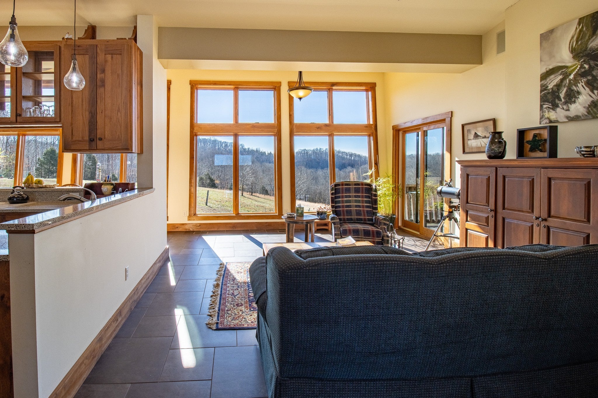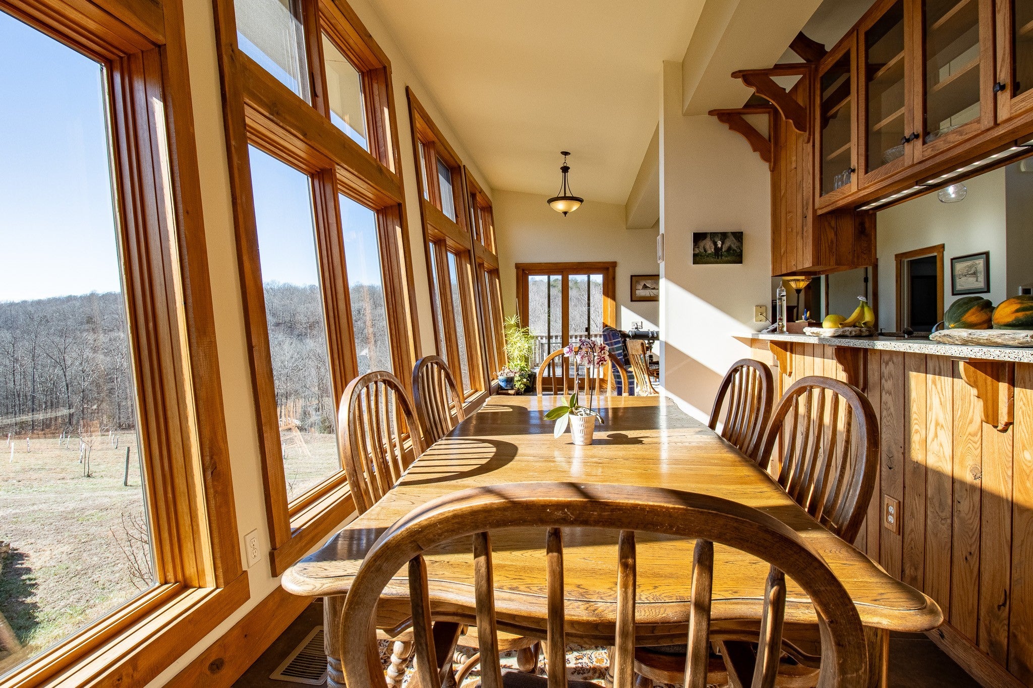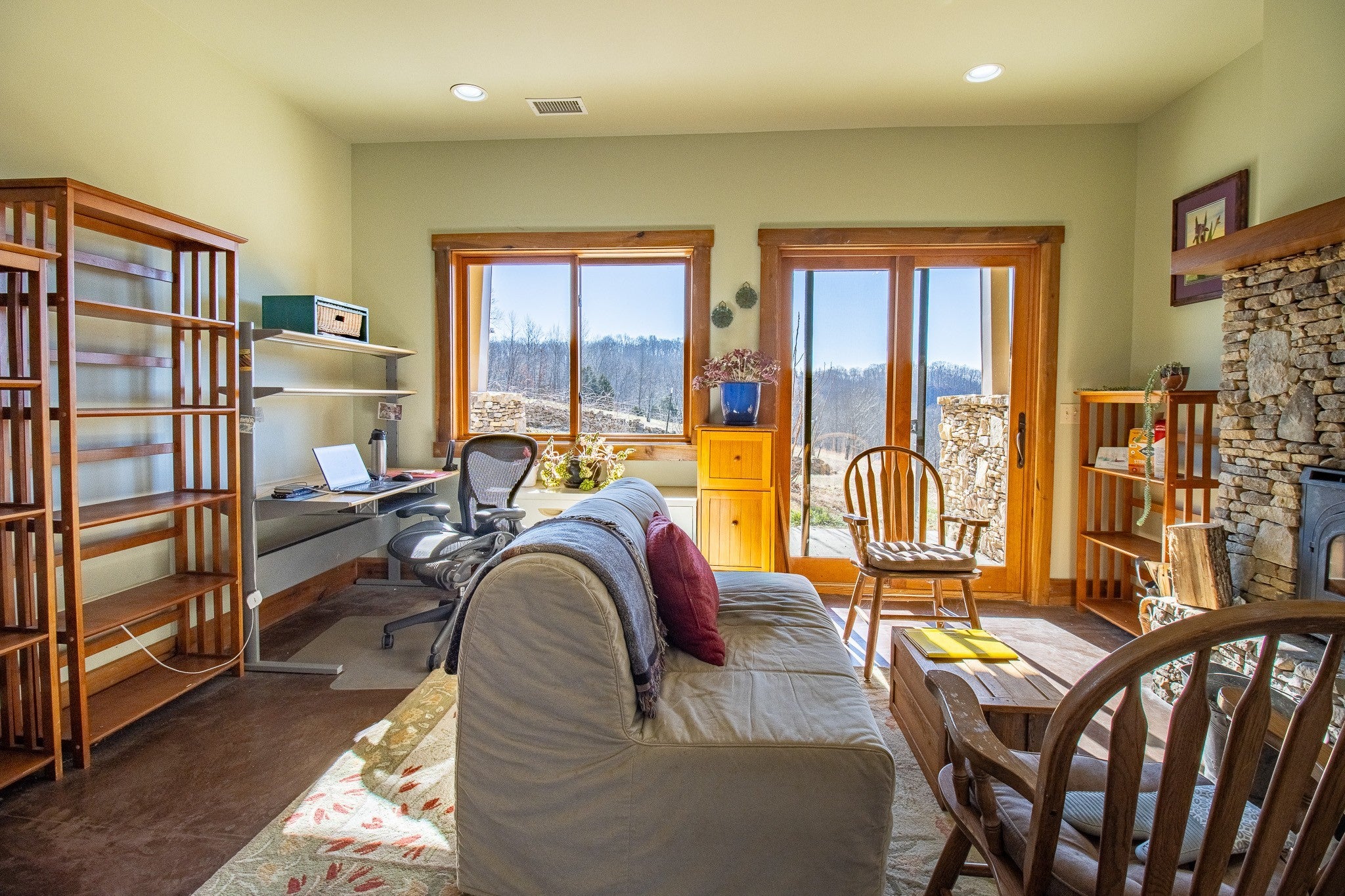 Grow Your Own Food. Produce Your Own Power. Live Exceptionally Well, Nestled in Nature. This LEED Platinum–certified home blends sustainability, craftsmanship, and agricultural abundance. Designed by Exoterra Architects and built by Ryan Nichols with Green Home, it exemplifies stewardship focusing on resource efficiency, resilience, and cultivates an intimate connection with the land. The main level features a vaulted ceiling, open floor plan, and expansive views of rolling hills and pasture. The primary suite on the main level offers dual vanities, tiled walk-in shower, and a south-facing porch overlooking dry-stacked stone terraces and gardens. Constructed with reclaimed materials throughout, the home showcases custom oak kitchen cabinetry, oak flooring and recycled glass countertops. The lower level opens to grade and includes a sitting room with a Morso wood-burning stove, laundry room, ~300sf built-in root cellar (could easily be converted to a 3rd bedroom), full bath, and second bedroom with walk-out patio. Exterior finishes include locally harvested fieldstone and Nichiha siding. This home works WITH nature and resource resilience is built in with solar array, geothermal HVAC system, three EV charging stations, Ford home integration system (use a compatible Ford truck as backup power), passive solar design that captures winter sun and stays shaded in summer, rainwater harvesting system and energy star appliances. A rare highlight is the mature blueberry grove, producing hundreds of pounds annually. The property also features a 5-year-old chestnut orchard with 25 trees, fenced fields, muscadine grape vines, and established gardens—ideal for farm-to-table living. A 20' x 40' two-bay farm shed with an enclosed shipping container provides excellent storage or workshop space. See 3D tour. Listing agent can meet for a guided tour of the home and land with advanced scheduling.