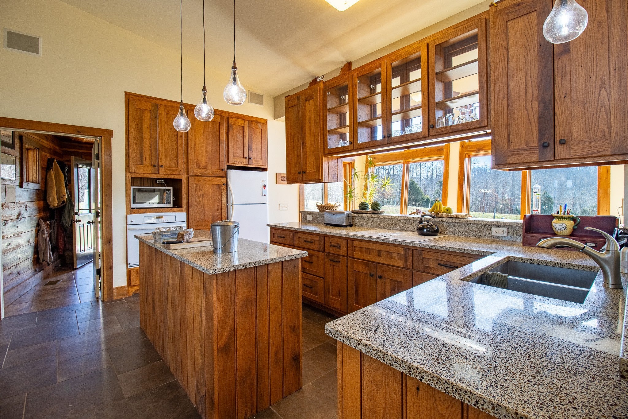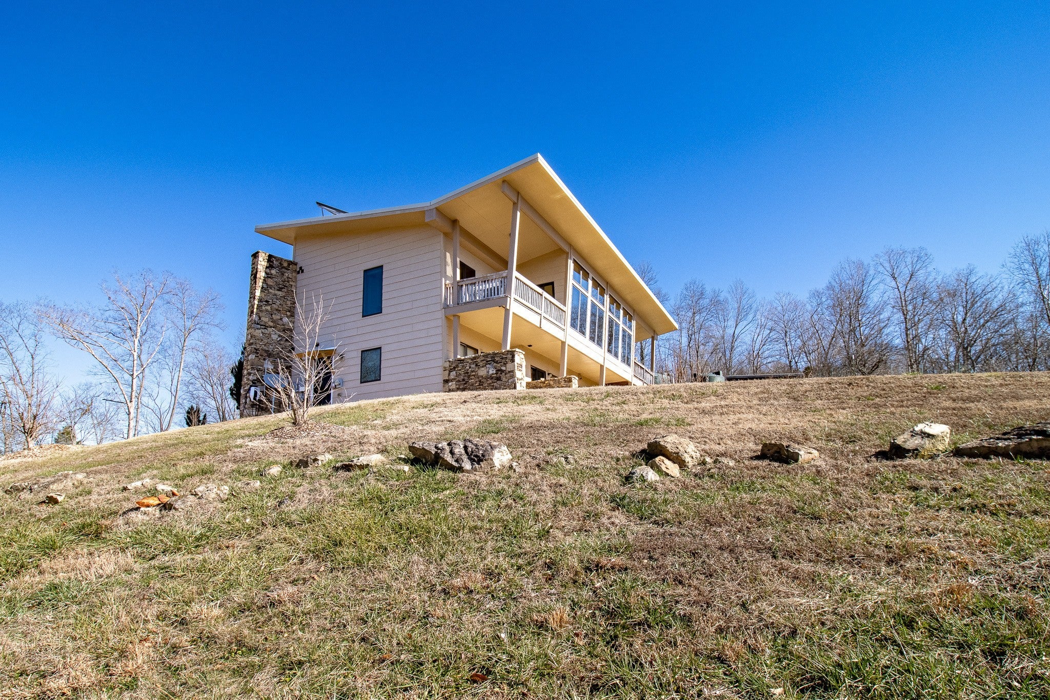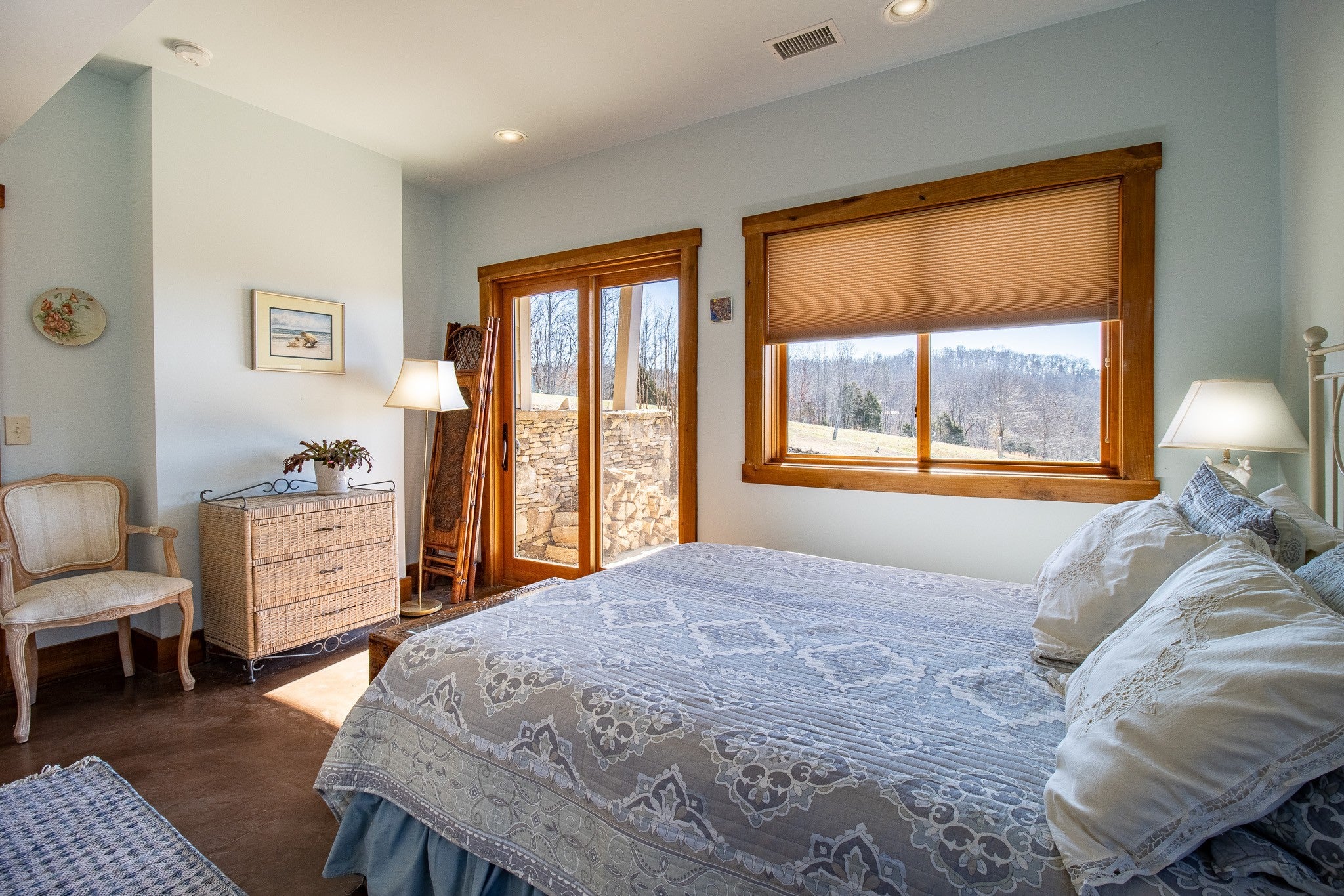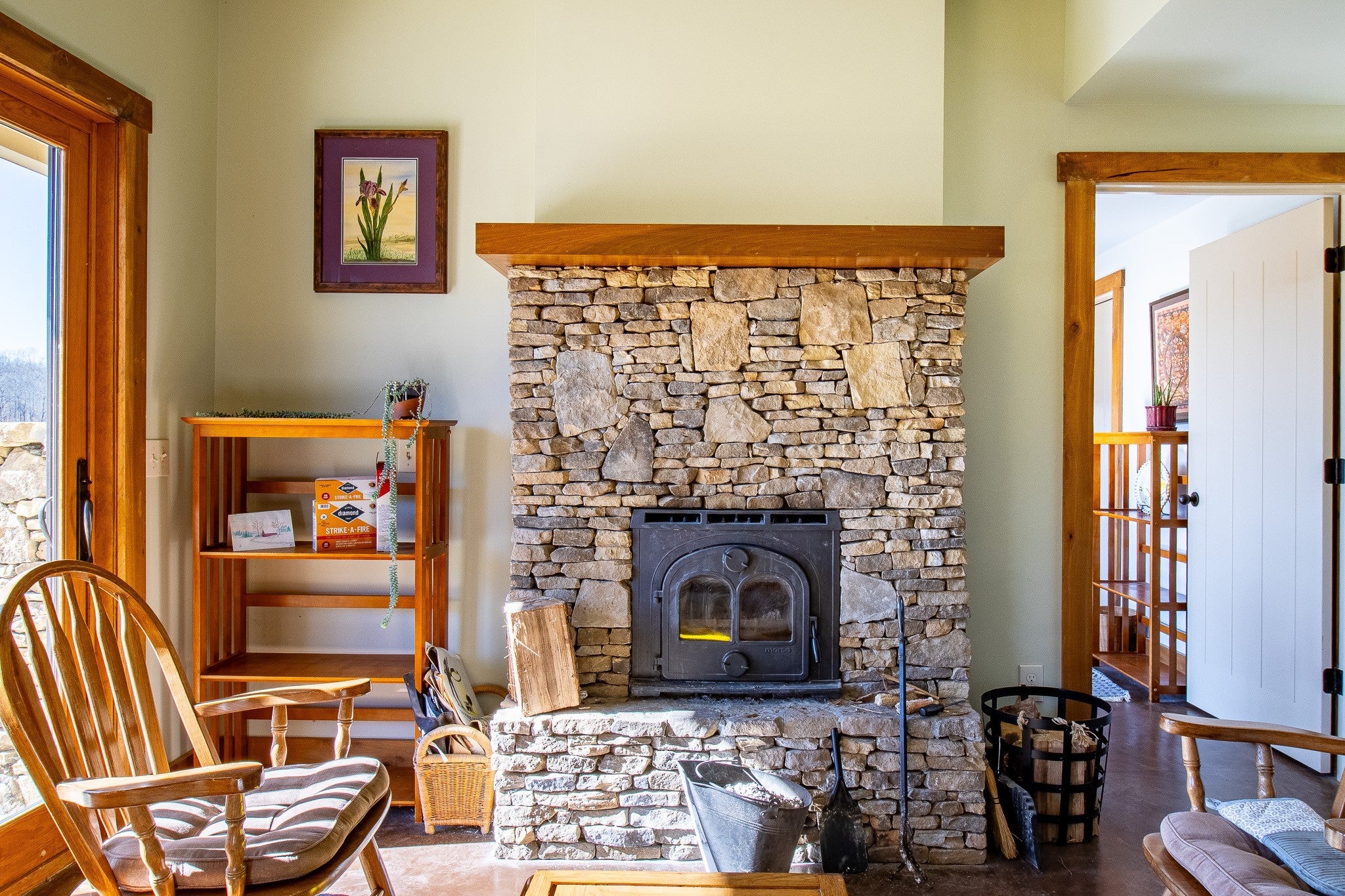 Grow Your Own Food. Produce Your Own Power. Live Exceptionally Well, Nestled in Nature. This LEED Platinum–certified home blends sustainability, craftsmanship, and agricultural abundance. Designed by Exoterra Architects and built by Ryan Nichols with Green Home, it exemplifies stewardship focusing on resource efficiency, resilience, and cultivates an intimate connection with the land. The main level features a vaulted ceiling, open floor plan, and expansive views of rolling hills and pasture. The primary suite on the main level offers dual vanities, tiled walk-in shower, and a south-facing porch overlooking dry-stacked stone terraces and gardens. Constructed with reclaimed materials throughout, the home showcases custom oak kitchen cabinetry, oak flooring and recycled glass countertops. The lower level opens to grade and includes a sitting room with a Morso wood-burning stove, laundry room, ~300sf built-in root cellar (could easily be converted to a 3rd bedroom), full bath, and second bedroom with walk-out patio. Exterior finishes include locally harvested fieldstone and Nichiha siding. This home works WITH nature and resource resilience is built in with solar array, geothermal HVAC system, three EV charging stations, Ford home integration system (use a compatible Ford truck as backup power), passive solar design that captures winter sun and stays shaded in summer, rainwater harvesting system and energy star appliances. A rare highlight is the mature blueberry grove, producing hundreds of pounds annually. The property also features a 5-year-old chestnut orchard with 25 trees, fenced fields, muscadine grape vines, and established gardens—ideal for farm-to-table living. A 20' x 40' two-bay farm shed with an enclosed shipping container provides excellent storage or workshop space. See 3D tour. Listing agent can meet for a guided tour of the home and land with advanced scheduling.