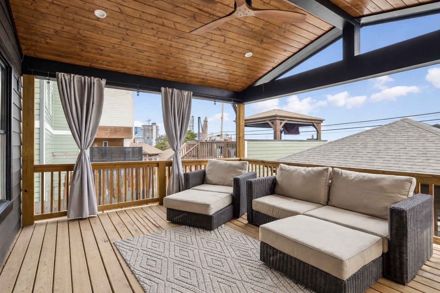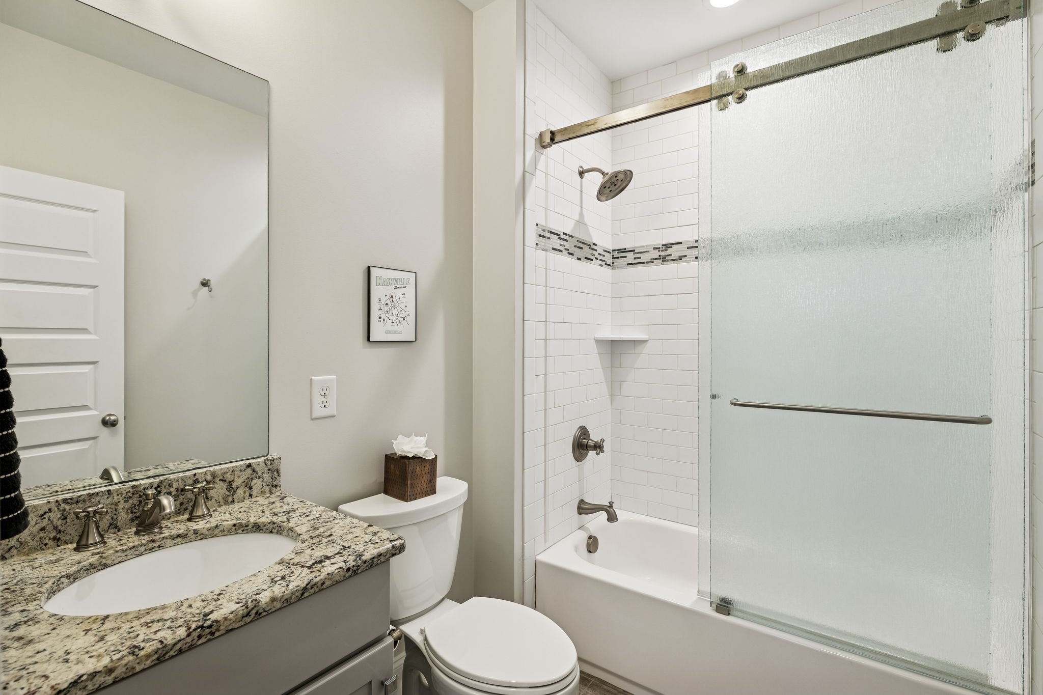 Within blocks of The Gulch and just minutes from downtown Nashville, this 3 bedroom, 3 bath home features an open floor plan with a dedicated dining area and a large upstairs flex space. Hardwood floors run throughout, and the entire home has been freshly painted. The kitchen offers gas cooking, an oversized 8-foot island with seating, granite countertops, stainless appliances, a tile backsplash with chevron detail behind the stove, a built-in coffee bar, and a pantry. The living room is anchored by a fireplace, and all bedrooms include walk-in closets. The primary suite features dual walk-in closets, dual vanities, and a walk-in shower with a rain head and handheld fixture. Additional highlights include under-stair storage, a two-car detahed garage, turfed backyard, and a covered deck with a vaulted pine ceiling and downtown views. Incentives available with preferred lender - 100% financing with no PMI and closing cost credits, ask for more info.