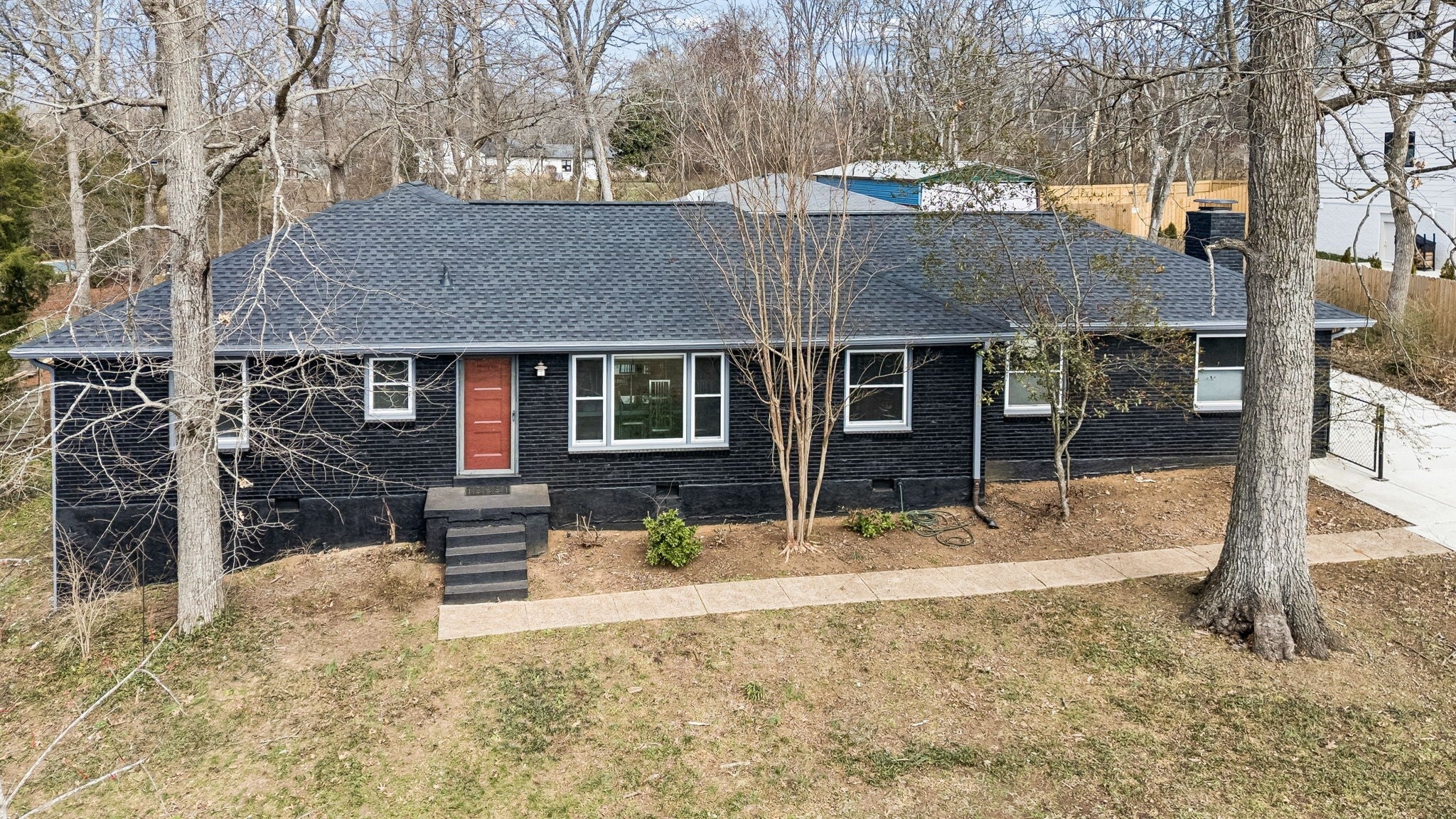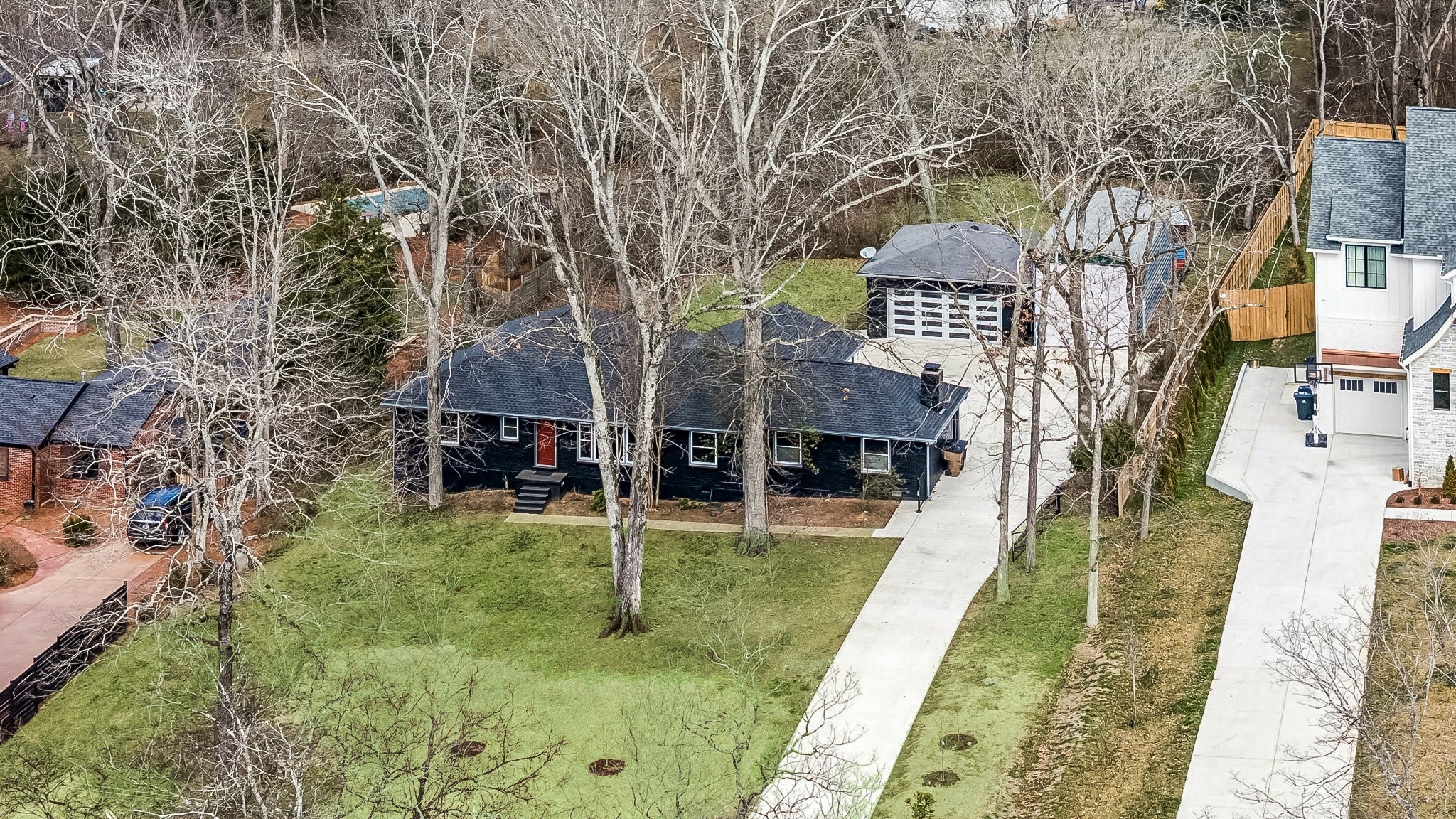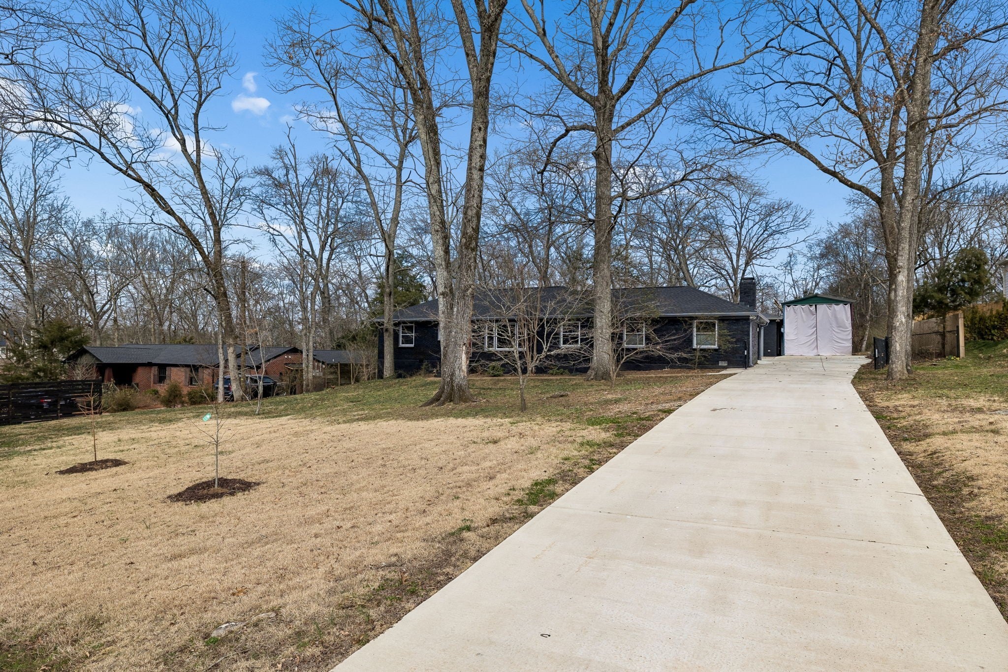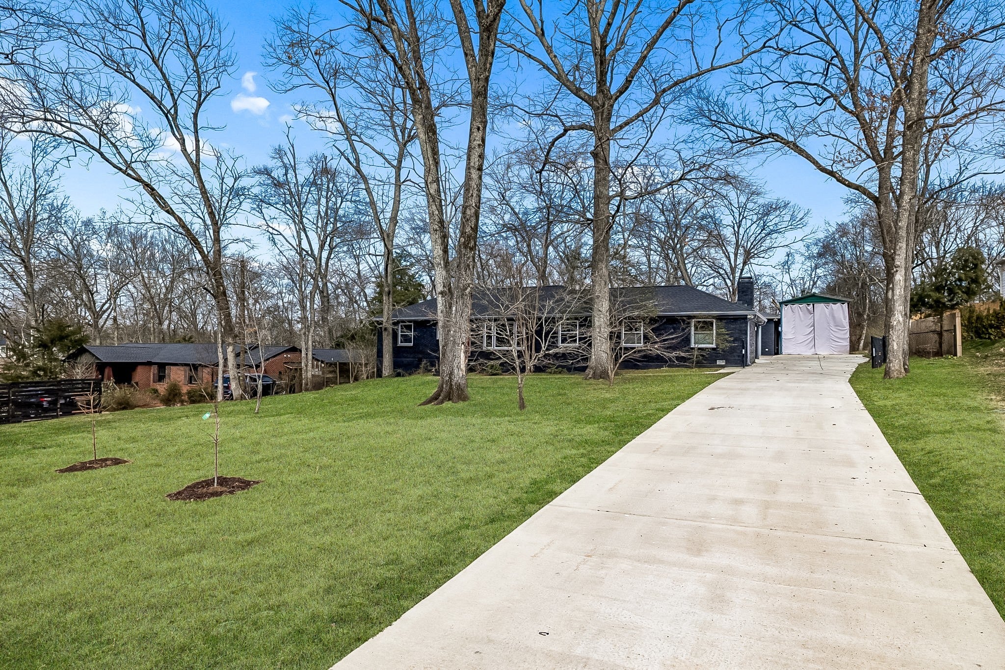 Tucked away in the highly sought-after Hillwood Estates/Brook Meade community of West Nashville, this well-maintained single-story ranch home sits on just under an acre minutes from shopping, dining, and all that West Nashville has to offer. Inside, you’ll find 3 bedrooms (with 2 primary suites) and 2 bathrooms thoughtfully arranged around an easy, flowing floor plan. Upon entering the home, the spacious living room is filled with natural light and can easily accommodate both a lounge area and dining room. Adjacent to the living room is a bright kitchen featuring a breakfast bar, granite countertops and pantry. The family room located just off the kitchen showcases warm Saltillo terracotta title floors, period piece wood paneling, built in bookcases and wood burning fireplace. Two doors lead to the backyard, one of which there is an oversized covered patio with natural gas hookups for a BBQ. The space overlooks a private wooded fully fenced backyard including an electric driveway gate. The oversized primary suite with new cherrywood oak floors serves as a true retreat, filled with natural light and a door to the covered patio the room comes complete with a generous en-suite bath which was remodeled in the last six months. The primary bathroom features heated floors, a large walk in shower, separate soaking tub, a sink vanity area and a large walk-in closet. Direct access to the laundry room is off the primary bedroom but an additional door from the hallway could be easily added. There is a 720 square foot detached garage/workshop area that is temperature-controlled (heated and cooled) and has a sink with a dedicated water heater for quick cleanups. The property also features 2 separate storage areas for an RV or trailer storage. With a new roof, new plumbing, new water heater and a prime West Nashville location less then 2 miles to Nashville West Shopping Center, Costco, and dining don’t miss this rare opportunity to own a private acre sought-after neighborhood.