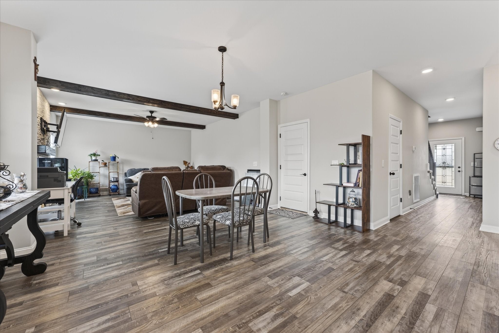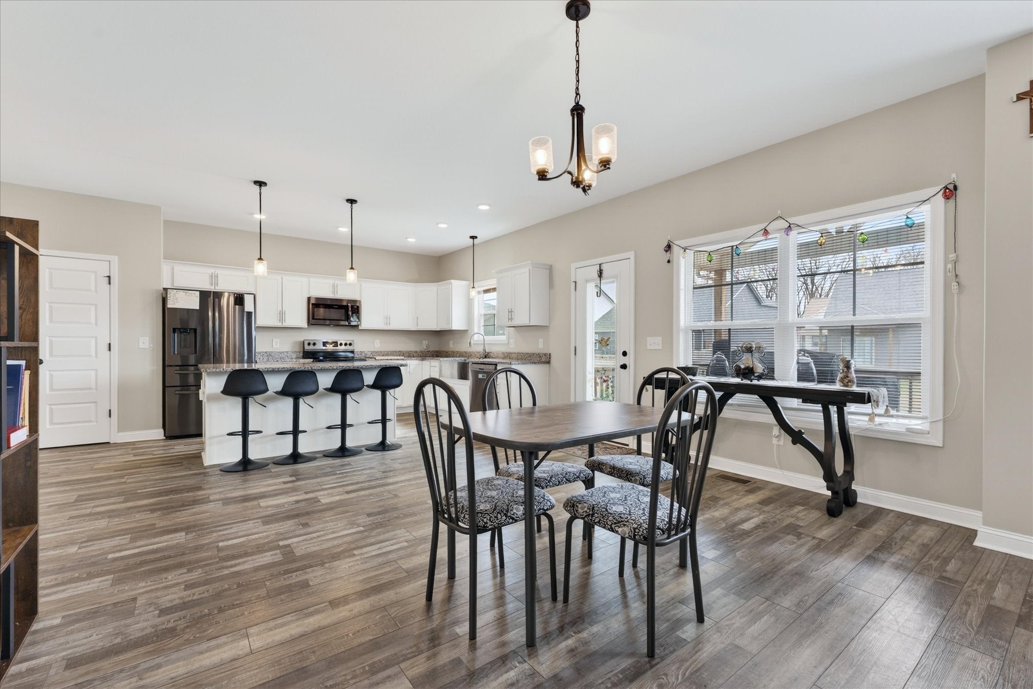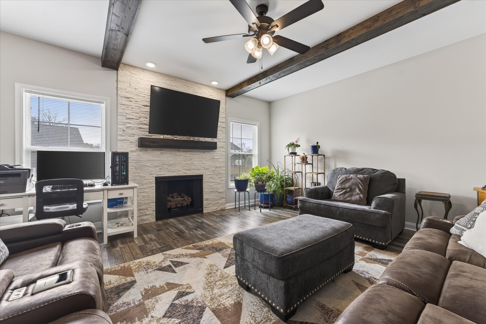 Welcome home to 530 Bloomington Trace, where this open and inviting floor plan was designed with everyday living and entertaining in mind. This beautiful home offers a formal dining room and a spacious living area that flows seamlessly into the kitchen. The kitchen features an island, stainless steel appliances, plenty of cabinet space, and overlooks the cozy fireplace, making the main level perfect for both everyday living and entertaining. Upstairs, you’ll find two primary suites, each with its own private bathroom and LVP flooring, plus two additional bedrooms with generously sized closets. The upper level laundry room adds convenience right where you need it most. Step outside to enjoy the covered back porch, ideal for relaxing evenings, and a screened garage door that lets you take advantage of summer nights in comfort. Storm doors on both the front and back doors offer added functionality and efficiency. Don’t miss this one. Schedule your showing today! Items to convey with the sale include the living room TV, two refrigerators, all TV mounts, and curtain rods. Negotiable items include the bedroom set in the grey room, washer and dryer, and both couches.