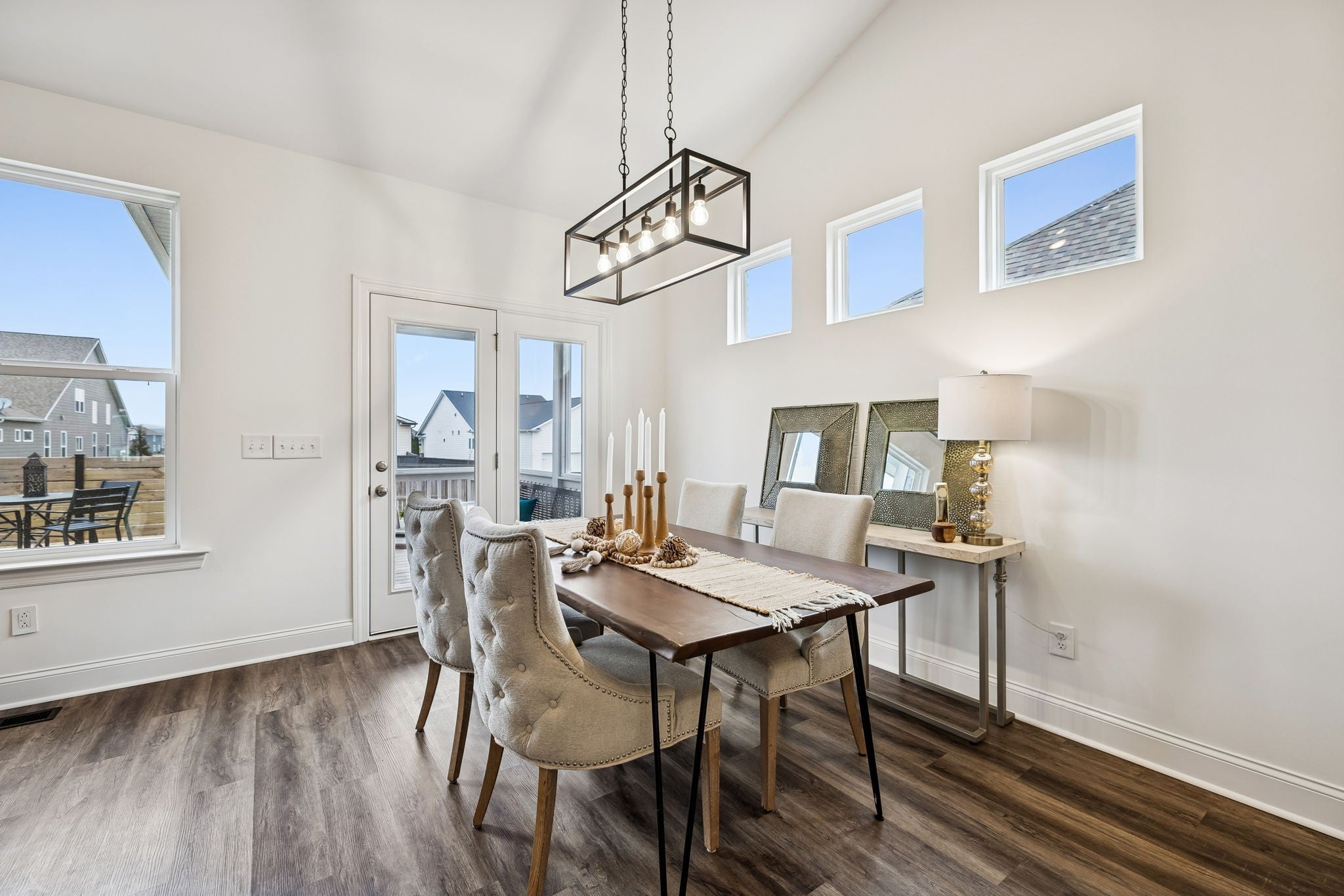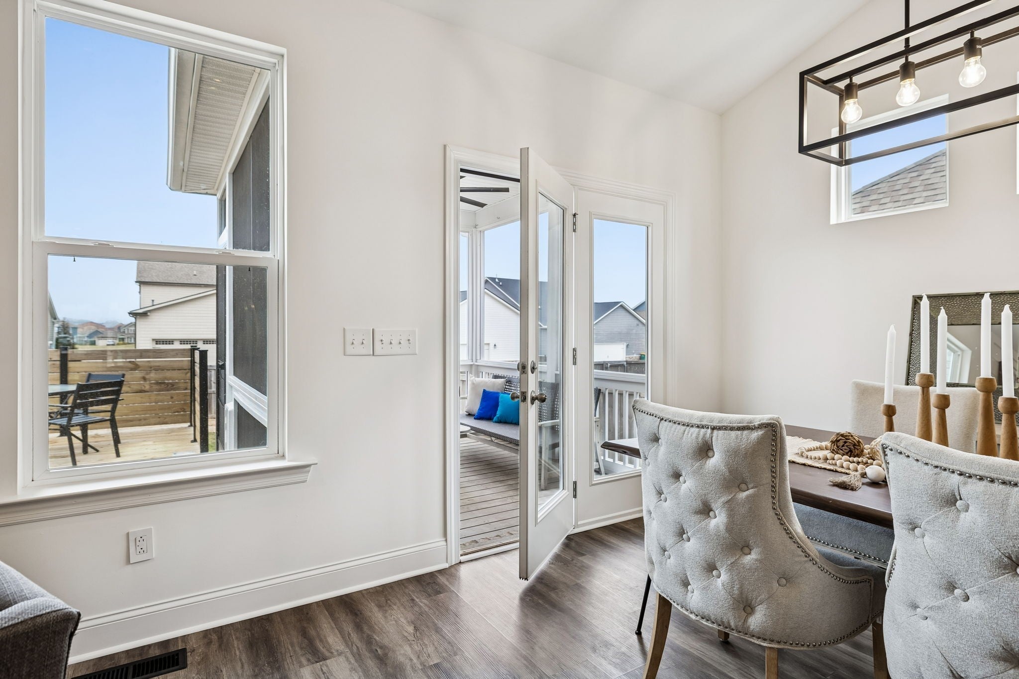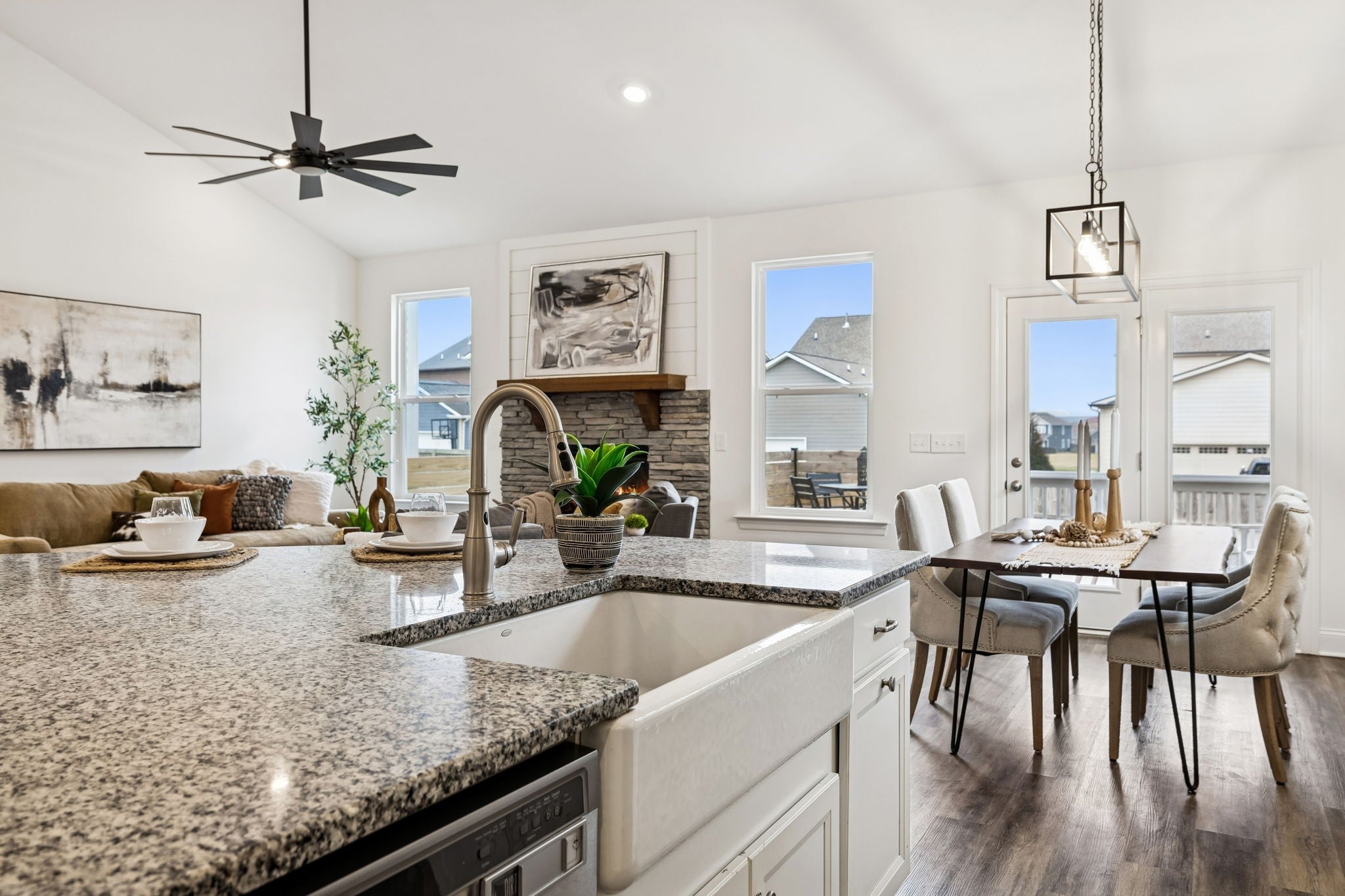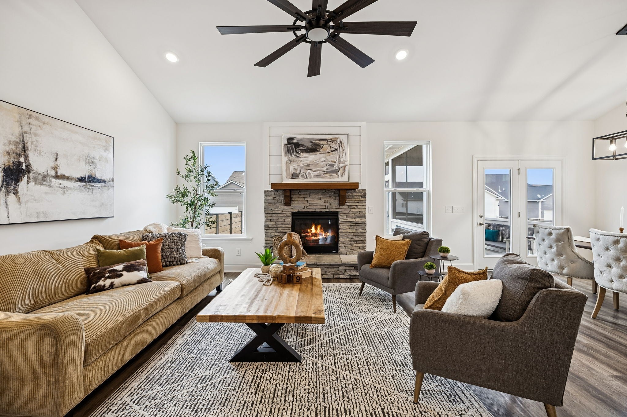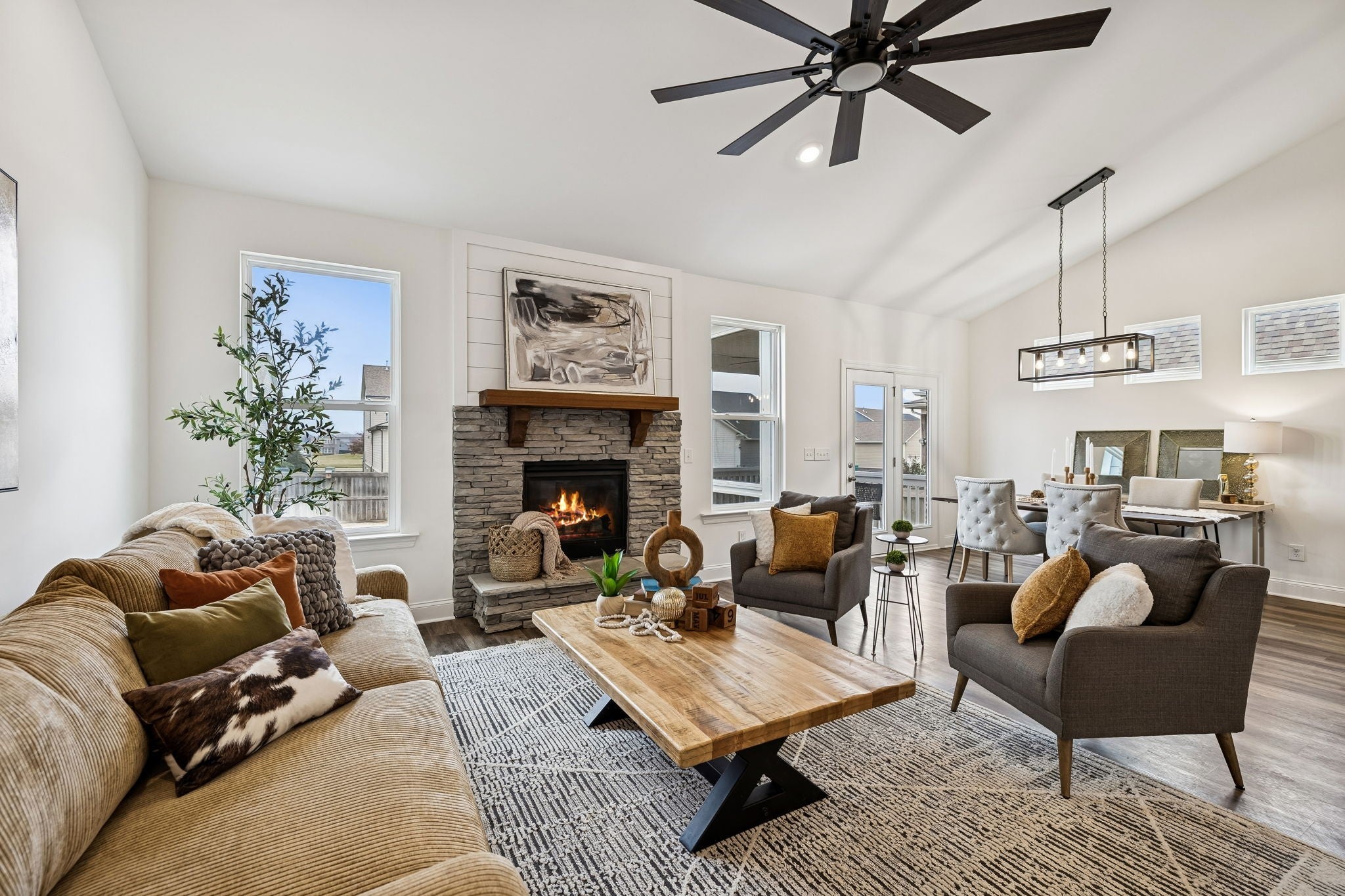 Welcome home to this thoughtfully-crafted 5 bedroom, 4.5 bath residence, offering over 2,800 square feet of living space in the highly sought-after Harvest Point community. From the inviting covered front porch, to the updated and screened-in back porch, this home was made for both relaxing and entertaining. Inside, the open-concept layout features a vaulted living area with a stone-flanked gas fireplace, creating a warm and welcoming focal point. Two bedrooms on the main level provide flexibility for guests or a home office, while upstairs you’ll find a spacious loft with vaulted ceilings and additional bedrooms for room to grow. Step out back to enjoy a custom deck and grilling space, spacious fire pit area, and a smart irrigation system ready to make the yard around it shine! A privacy fence with a French gate for alley access rounds out the space perfectly. Just steps from the community shops, resort-style pool, community garden, walking trails, park, and playground—and only a 5 minute drive from The Crossings shopping center—this home truly offers the best of lifestyle and location.