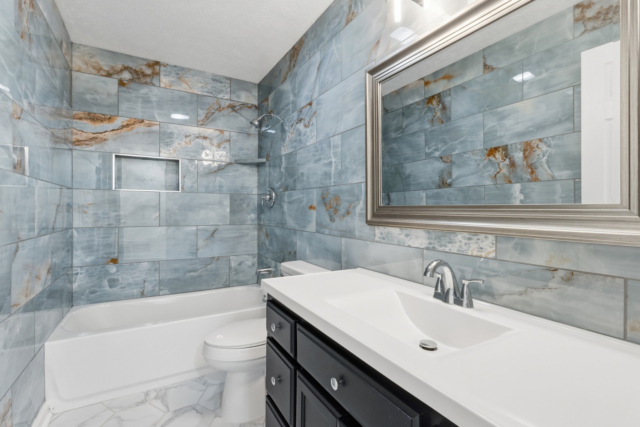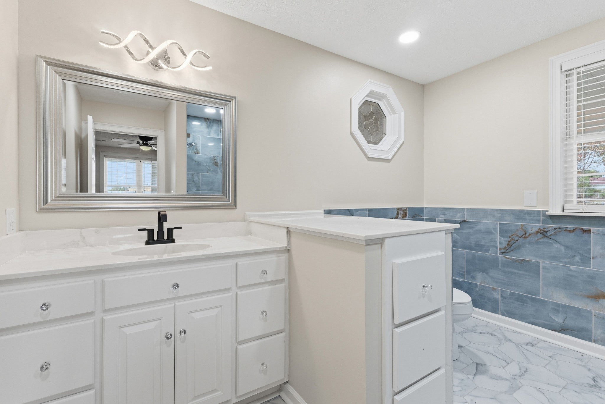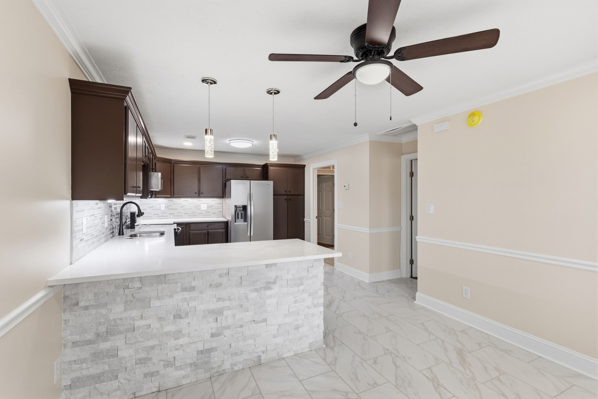 Welcome to 320 Chaney Rd — where comfort meets modern charm in the heart of Smyrna! This beautifully renovated two-story home features elegant finishes, a spacious layout, and a seamless flow designed for today’s lifestyle. The home offers 4 bedrooms plus a bonus/flex room, 3 full bathrooms, a carport, a detached garage, and sits on a generous 0.36-acre lot. The main level includes the primary suite with private bath, a second bedroom, an additional full bathroom, and the versatile bonus/flex room — perfect for an office, playroom, or guest space. Upstairs, you’ll find the third and fourth bedrooms along with the third full bathroom, providing plenty of room for family or guests. The inviting front porch is the perfect place to unwind and enjoy peaceful afternoons. The fully renovated kitchen is a true showpiece, blending sophistication, elegance, and functionality. It features sleek quartz countertops, a glass backsplash, rich espresso cabinetry, and a striking stacked-stone breakfast bar that adds texture and style. Contemporary pendant lighting and a ceiling fan create a warm, inviting atmosphere, while stainless steel appliances and gleaming tile floors make this kitchen ideal for both everyday living and stylish entertaining. Outside, enjoy a large, level backyard perfect for entertaining, gardening, or relaxing outdoors, along with a spacious driveway, covered parking, and a detached garage. With its fresh updates, elegant details, and prime location close to schools, shopping, dining, and everyday conveniences, this home is truly move-in ready and a must-see!