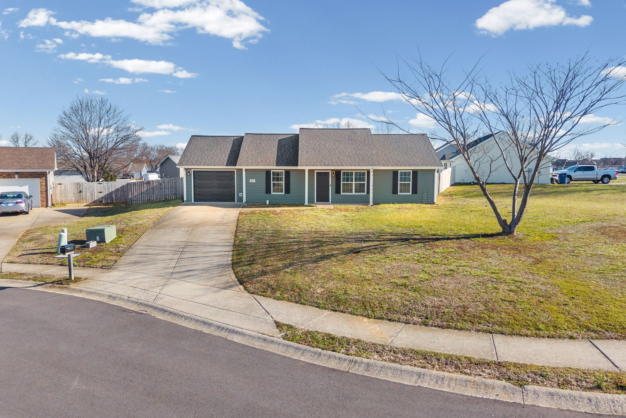 Welcome home to 1071 Meshaw Trail, conveniently located near Exit 1 in Clarksville! This 3-bedroom, 2-bath ranch features a desirable split-bedroom floor plan and a functional layout that maximizes space and comfort. Exterior improvements include adorable green vinyl siding and a dark grey roof installed in 2024, among other upgrades (see Offer Instruction Sheet for full list). Situated on a cul-de-sac with a large, fully fenced (2024) backyard, this well-kept property offers both privacy and convenience with easy access to shopping, dining, and Fort Campbell.