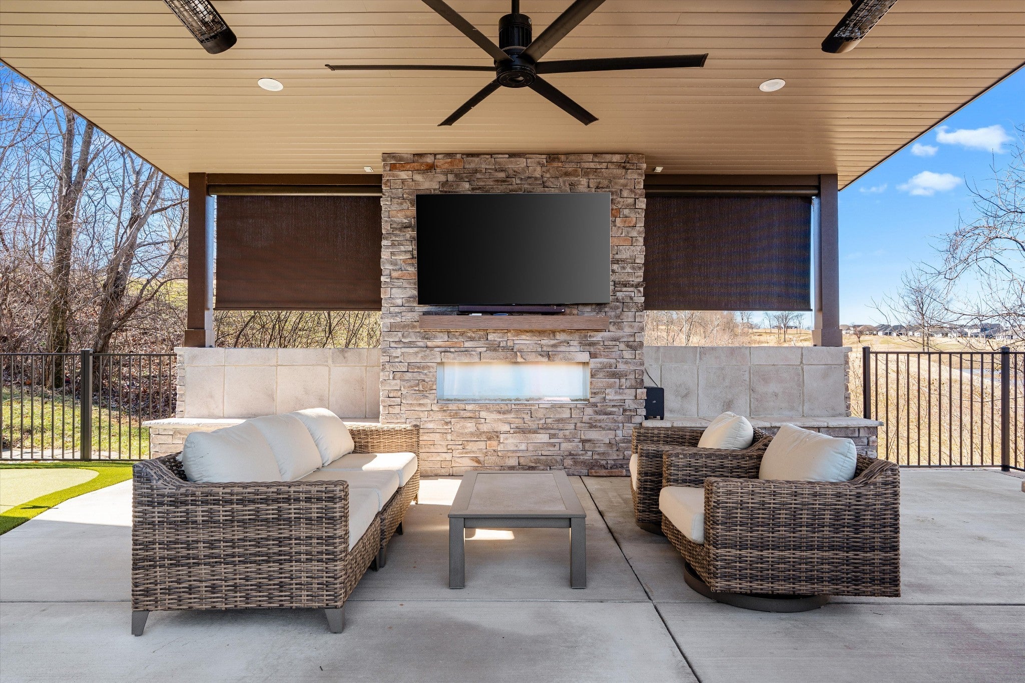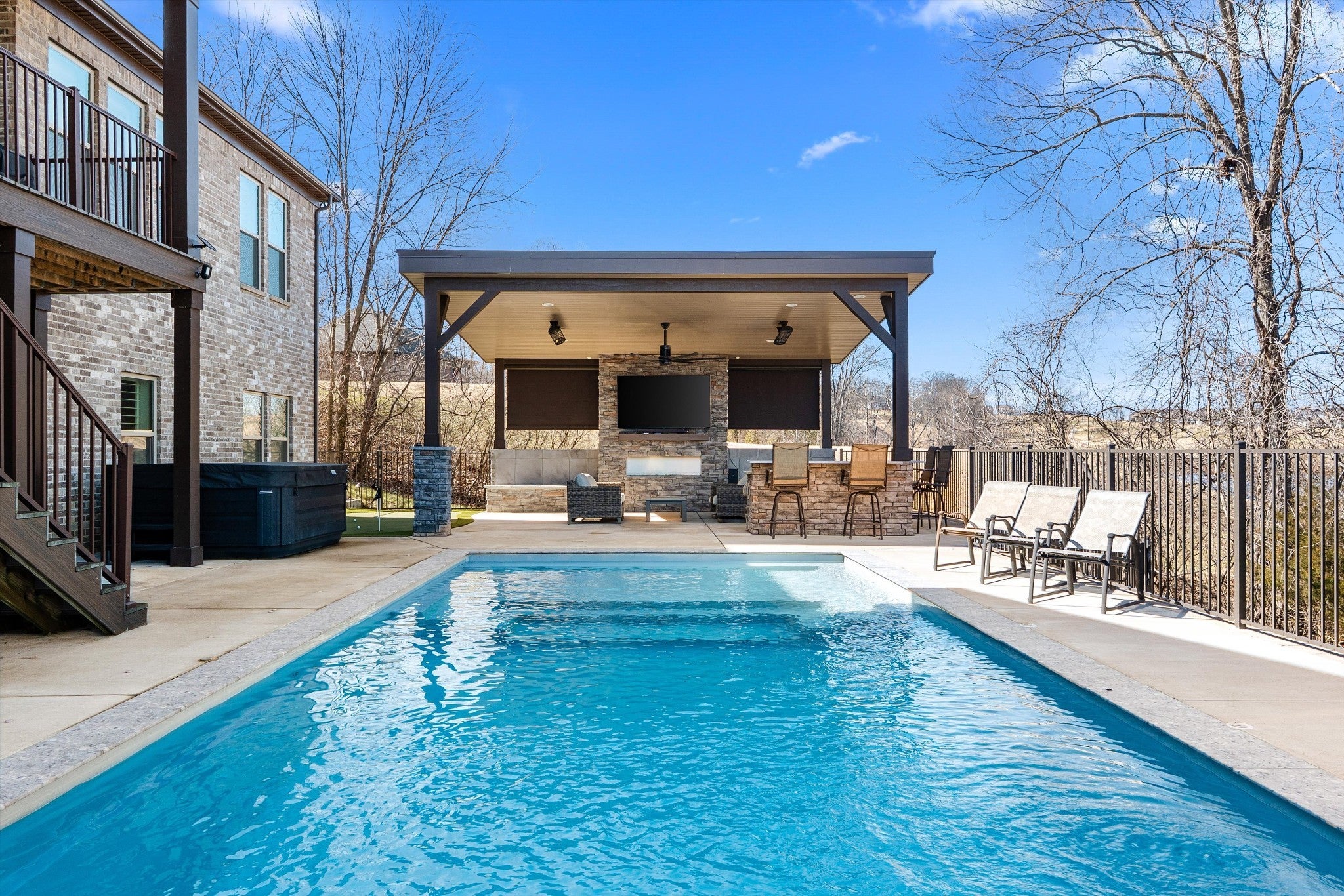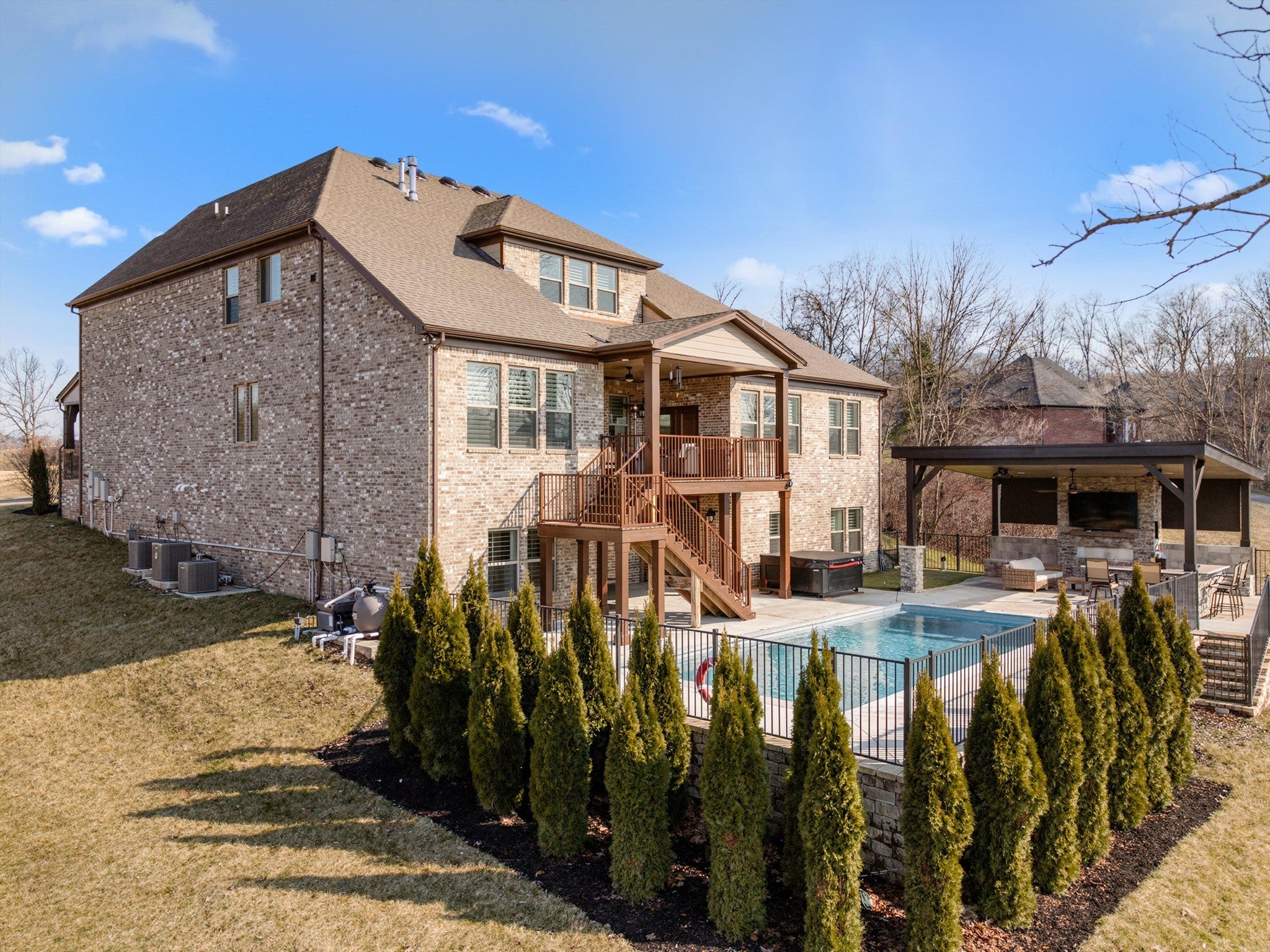 Welcome to this luxury custom built estate located in the prestigious golf community of The Club at Five Oaks. This exceptional 6 bedroom home features ensuite baths in all bedrooms with an additional half bathroom on the main level. This home offers comfort, functionality, and privacy for family and guests. The main level showcases a thoughtfully designed layout including a large private office with elegant glass french doors, an inviting family room with a stacked stone gas fireplace, along with the primary suite featuring a large spa like ensuite bathroom and the massive owners closet. An additional main level bedroom with ensuite provides ideal accommodations for guests or multi-generational living. The chef's kitchen is designed for entertaining with double ovens, gas range, large bar island, generous size pantry, and ample workspace flowing seamlessly into the main living areas. The dining room opens to a large covered trex patio overlooking the lake and greens. Along with guests bedrooms and ensuites, the upstairs offers a large bonus room ideal for entertainment or recreation as well as additional unfinished space for more storage. The finished lower level of the home offers a complete in-law or guest suite, a large full size secondary kitchen, exercise room, two large living spaces, and includes one of the six bedrooms and baths on this level. The home also features an additional 700 unfinished sq ft of full storage space on this lower level. Next, step outside to your private backyard oasis, complete with a heated saltwater in-ground pool, personal 4 hole putting green, outdoor stone covered area with an outdoor kitchen, bar, remote blinds, and seating area with a TV for entertainment and ceiling heaters for your comfort in cooler months. This home is perfectly positioned along by the 2nd tee box, offering beautiful golf course and lake views and access to private club amenities with available golf and social packages. This home is your resort.