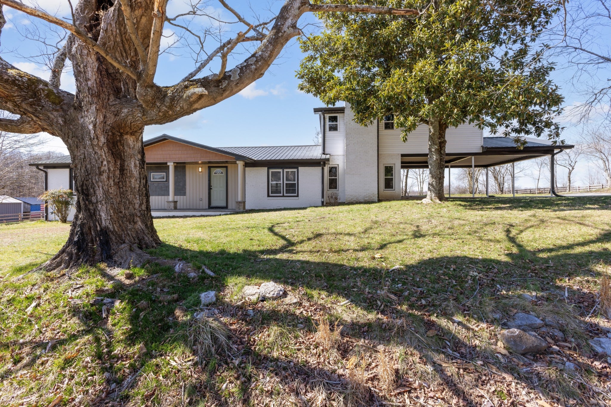 Welcome to this renovated home located on 1.19 acres, with no HOA! Enjoy peaceful country living in Bethpage, Tennessee. This residence features three bedrooms and three bathrooms, offering just under 2,800 square feet of thoughtfully designed living space, complete with established fruit trees. Step inside to discover an inviting open-concept layout that showcases real hardwood floors and upgraded finishes throughout. The spacious living area features a large electric fireplace, creating a warm and stylish focal point. The stunning kitchen is ideal for both everyday living and entertaining, complete with modern finishes and a convenient pot filler above the stove area. The main level primary suite offers comfort, featuring a walk-in closet and a luxurious ensuite bathroom that includes a separate shower, a soaking tub, and a built-in essential oil diffuser for a spa-like experience. You will also find a dedicated mudroom and laundry area for added convenience. There is a versatile main level flex space with its own private entrance and an adjacent full bathroom, providing endless possibilities perfect for a home office, guest suite, or hobby space. Upstairs, you'll find two additional bedrooms and a full bathroom, each equipped with a mini-split heating and air unit for personalized climate control. Additional features of the home include a brand new HVAC system and a tankless water heater for energy efficiency. The exterior boasts a durable metal roof, a large carport, a small garage ideal for a riding mower or workshop, and ample storage in the basement. Enjoy the serenity of country living without HOA restrictions. This move-in ready property perfectly combines modern upgrades with peaceful acreage. Schedule your showing today and experience it for yourself!