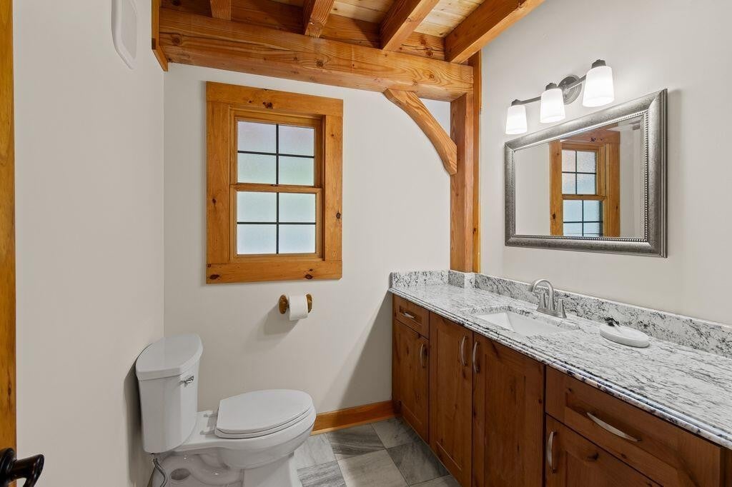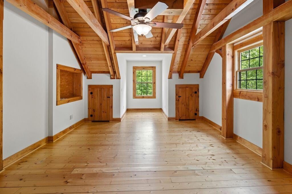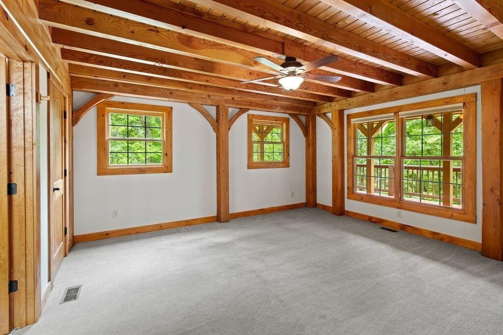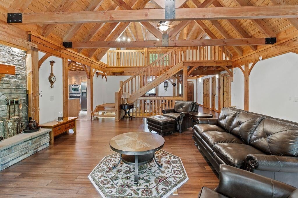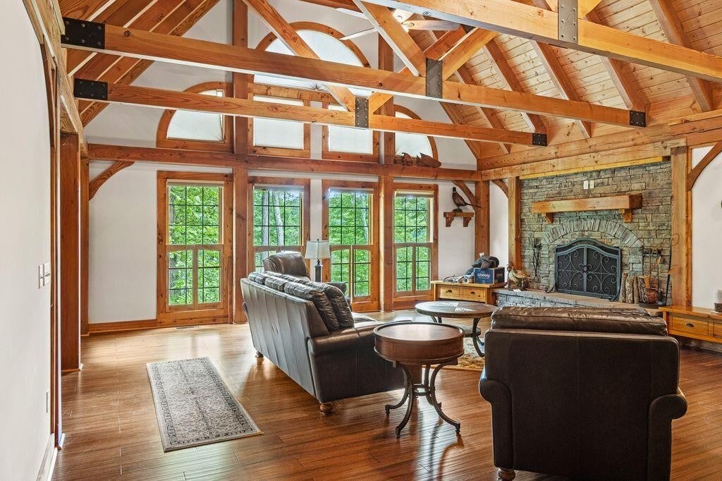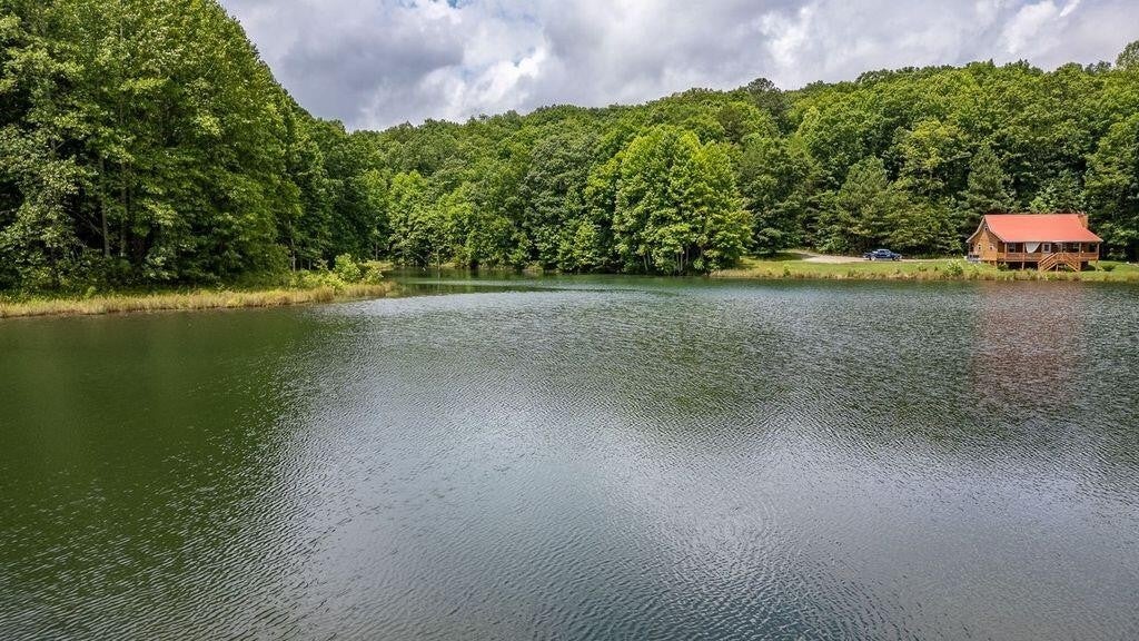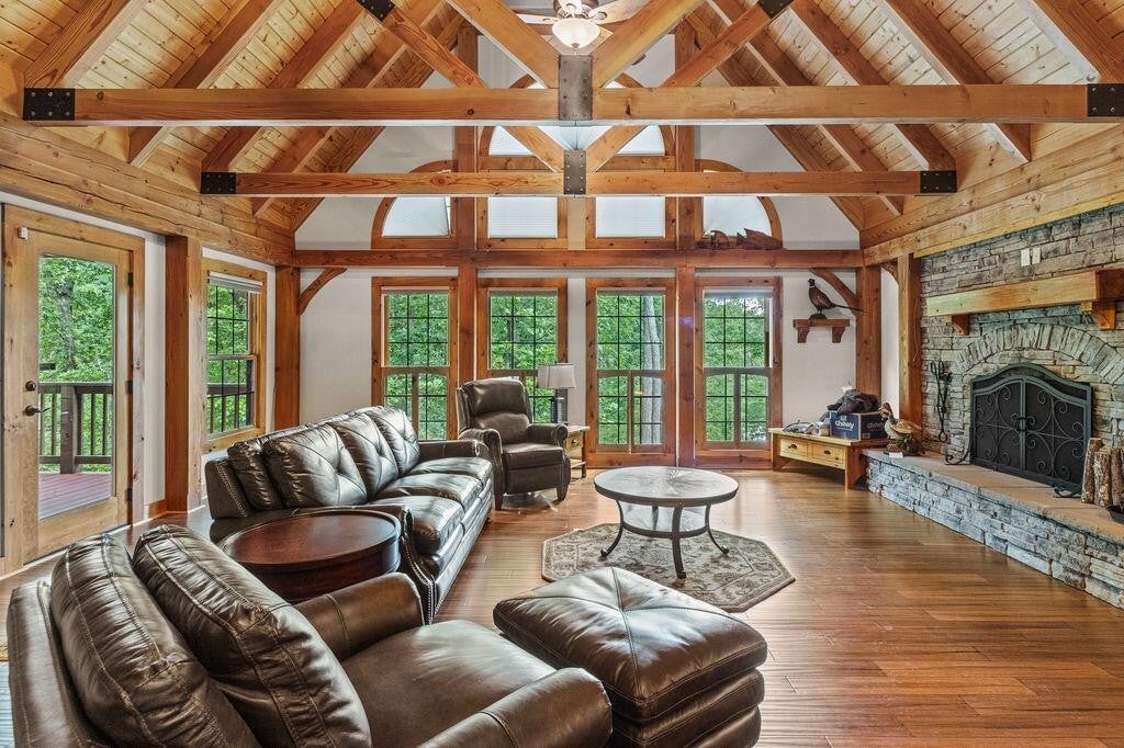 A private drive leads to this 3,033 sq ft post and beam secluded lakeside retreat on 3.6 acres covered with mature hardwood trees on Fredonia Mountain. The 3-bedroom 2.5-bath large craftsman home is move-in ready with a new metal roof, new exterior paint, and landscape touch-ups. The floor to ceiling windows surrounded by post and beam and tongue and groove ceilings open onto a tranquil 7 ac stocked lake. The two over-sized bedrooms upstairs have exposed beams, hardwood floors, custom solid wood doors, generous closets and dormer storage areas, and locally controlled heating and cooling split systems -- ensuring privacy for guests or home-based office -- with views of the lake and woods. A custom solid wood, open staircase leads from the main level to the second-level landing. The large bath has a shower, and ample granite-topped hardwood storage cabinets. The kitchen design includes custom lighted pantry cabinets, granite counter tops, tile floor, hardwood faced storage cabinets, induction range, Kitchen Aid stainless steel wall oven, microwave and garbage disposal. The kitchen bar opens to a breakfast area and covered exterior porch, providing natural light and views of the lake and woods. The kitchen is arranged so that the practiced chef has immediate access to all appliances, food preparation and cooking areas. A laundry room with washer, dryer, upright freezer, deep sink and room for cleaning supplies is easily assessable but hidden behind a large wooden pocket door. All bathrooms contain custom-trimmed granite counter tops and generous hardwood storage drawers and cabinets. The master suite has a oversized shower, a garden tub for a longer relaxing bath and access to the master bedroom closet. The large master bedroom has windows opening to a wrap-around covered porch and the quiet of the lake. The living room area -- with cathedral windows opening to the lake, a dual-fuel, stone-faced fireplace, and a hand-crafted wooden mantel -- provides an open spa